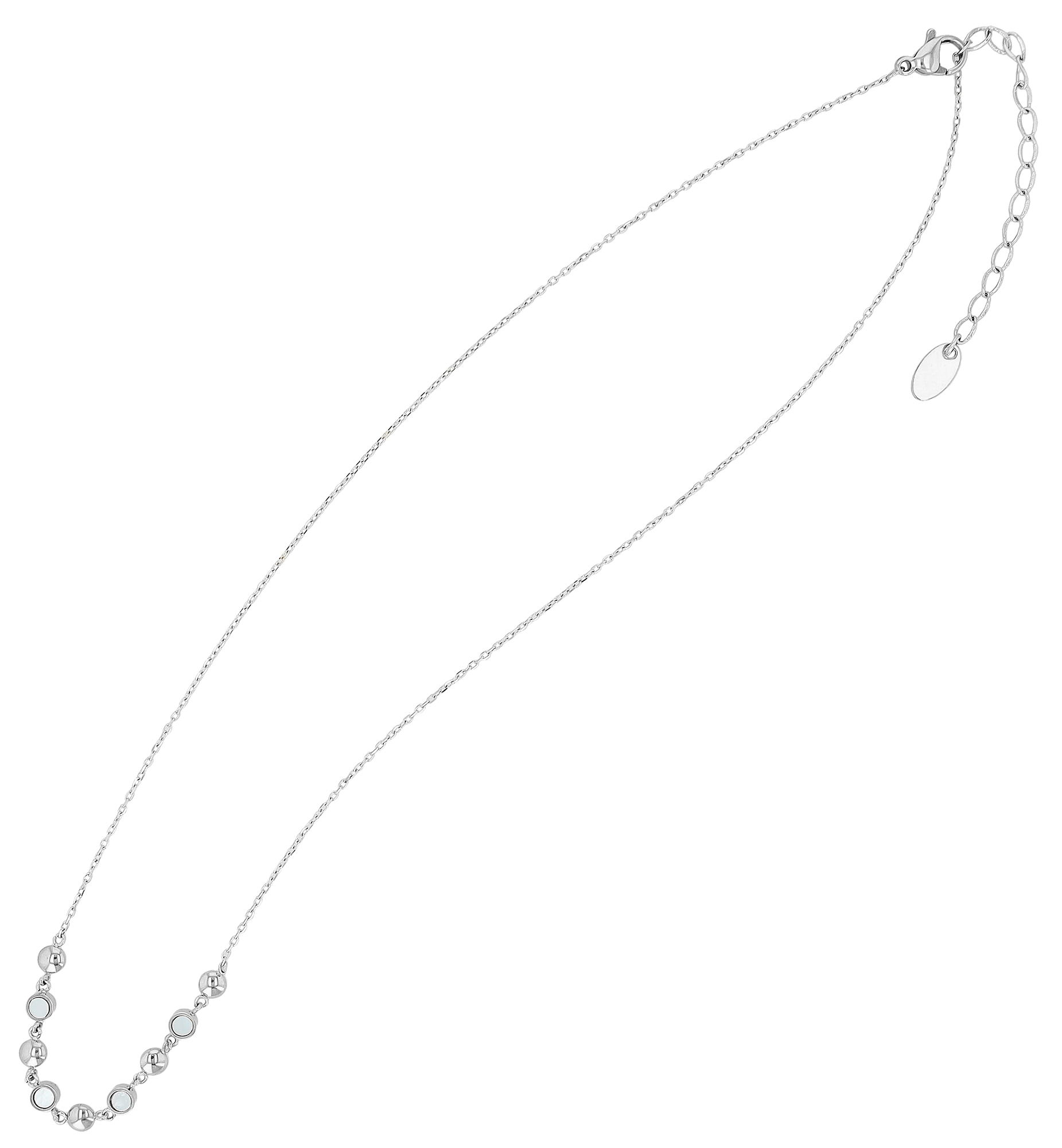 Diese stilvolle Edelstahlkette kombiniert edles Perlmutt mit hochwertigen Edelstahlelementen auf einer Länge von 6 cm. Die fein gearbeiteten Elemente (Ø 4 mm) verleihen dem Schmuckstück eine dezente, aber dennoch ausdrucksstarke Optik. Erhältlich in zwei Varianten, silberfarben mit einer Kettenlänge von 41 cm, goldfarben mit einer Kettenlänge von 42 cm. Dank der zusätzlichen 5 cm Verlängerung kann die Länge individuell angepasst werden. Der praktische Karabiner-Verschluss sorgt für sicheren Halt. Diese Kette ist ein perfekter Begleiter für elegante und alltagstaugliche Looks.