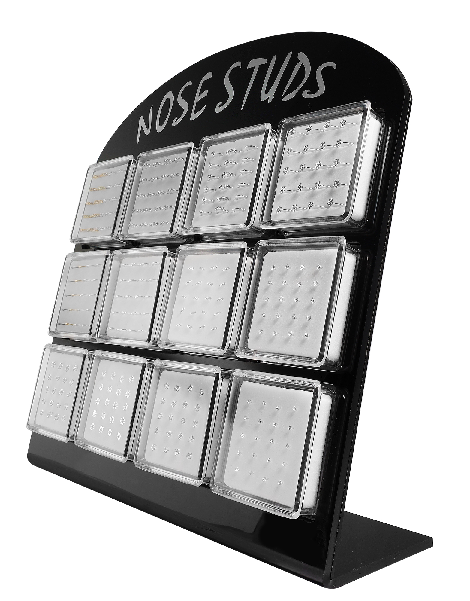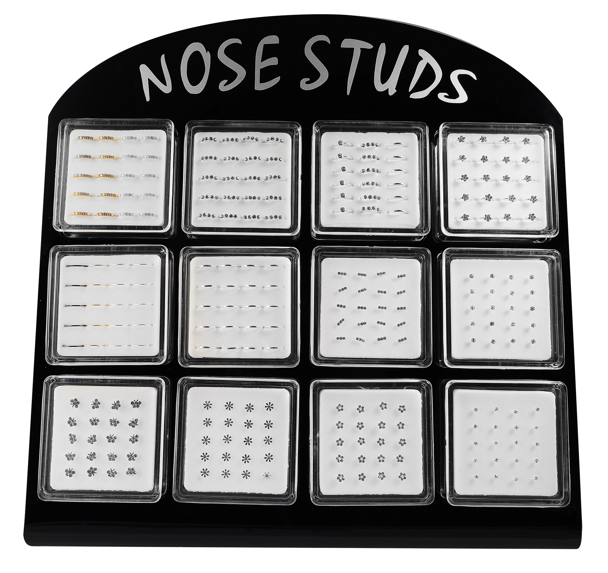 Das schlichte und zeitlose Design des Displays, mit der Beschriftung "NOSE STUDS", fügt sich harmonisch in jede Verkaufsfläche ein.