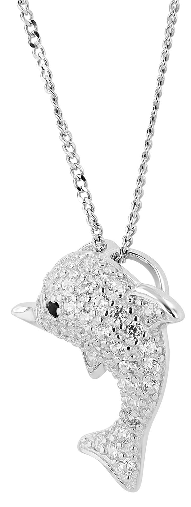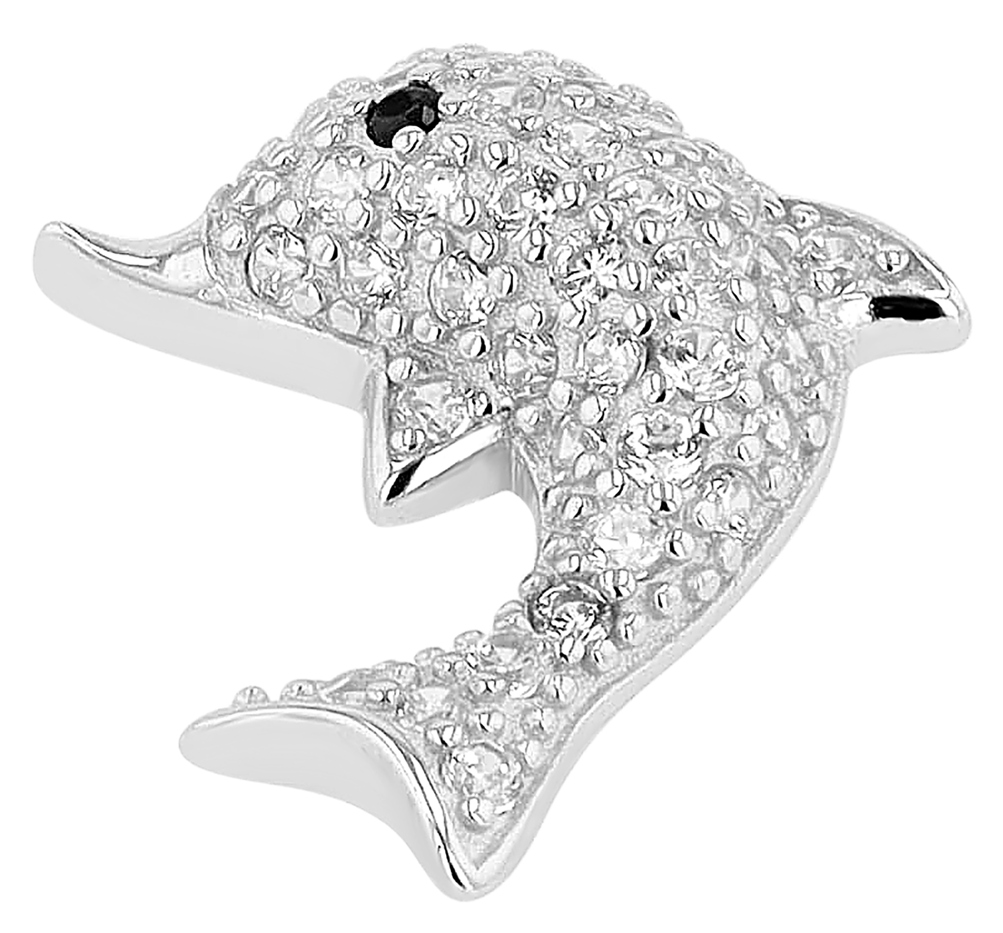 Mit den Maßen 19 x 11,5 x 5 mm und einem versteckten Ösenverschluss wirkt es, als würde der Delfin schwerelos an der Kette schweben. Die zahlreichen Zirkoniasteine verleihen dem Anhänger einen glitzernden Effekt.