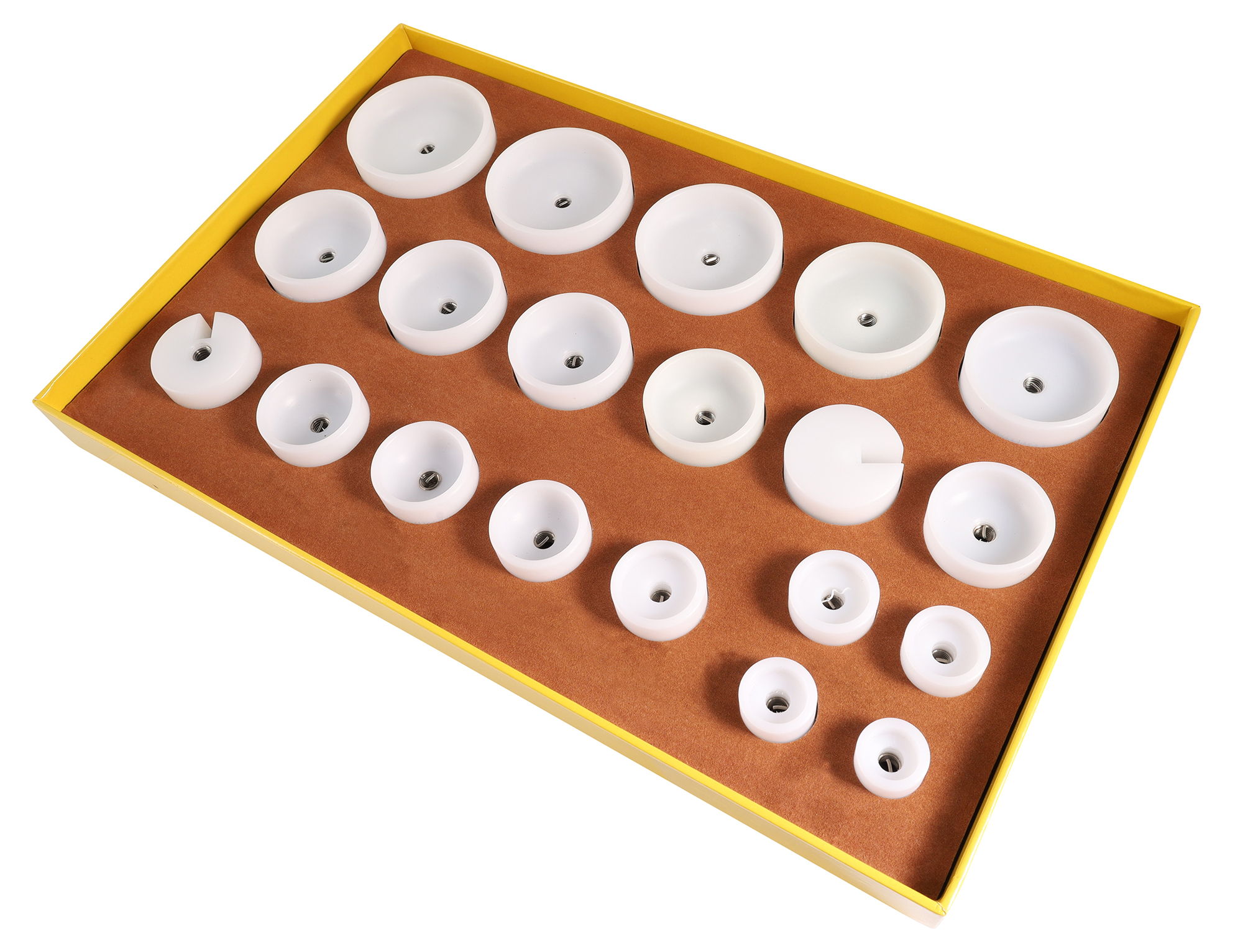 Dieses Druckstückset für Glaseinpresser mit Schraubverfahren, zum Austausch und Anbringen von Druckstücken, besteht aus Kunststoff-Druckstücken in den Größen: 18 mm - 52 mm mit zwei Stücken ohne Einwölbung, aber mit verbreitertem Schlitz in den Größen 32 mm und 34 mm, welche zum Aufsetzen auf Gläser mit Lupe für die Datumsanzeige verwendet werden können.