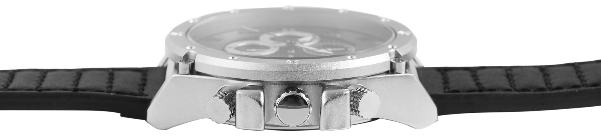 Der Herrenchronograph der Marke Elite verfügt über ein hochwertiges Quarzuhrwerk. Das schwarze Echtlederarmband ist am Anstoß 24 mm breit und lässt sich mit einer silberfarbenen Dornschließe öffnen und schließen. Die Gesamtlänge der Uhr beträgt 26 cm. Das silberfarbene Metallgehäuse mit Mineralglas hat eine Abmessung von 50 mm im Durchmesser und einer Gehäusehöhe von 14 mm. Der Gehäuseboden ist aus Edelstahl gefertigt. Mit dem Chronographen lässt sich die Zeit stoppen, diese ist dann auf den drei Totalisatoren auf sechs, neun und zwölf Uhr abzulesen. Das Modell verfügt außerdem noch über eine Datumsanzeige auf drei Uhr. Durch die mit Superluminova beschichteten Zeiger und Indexe lässt sich auch im Dunkeln die Zeit gut ablesen. Des Weiteren hat die Herrenuhr eine Wasserdichtigkeit von 3 bar. Ein weiteres Highlight sind die abgesteppten Nähte am Uhrenarmband und die markante Lünette. Die Herrenarmbanduhr ist ein zuverlässiger Begleiter, der vielseitig nutzbar und zudem noch ein absoluter Blickfang an Ihrem Handgelenk ist.