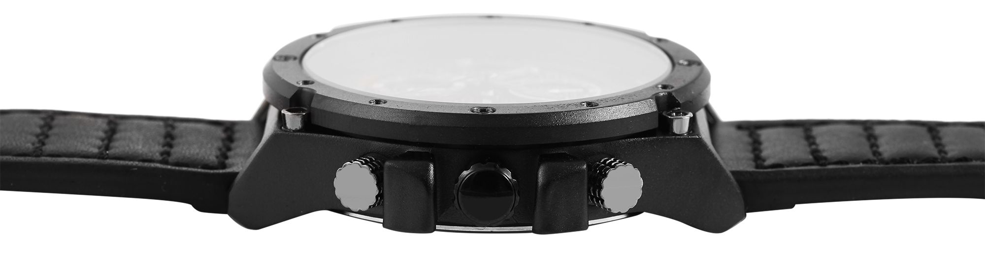 Der Herrenchronograph der Marke Elite verfügt über ein hochwertiges Quarzuhrwerk. Das schwarze Echtlederarmband ist am Anstoß 24 mm breit und lässt sich mit einer schwarzen Dornschließe öffnen und schließen. Die Gesamtlänge der Uhr beträgt 26 cm. Das schwarze Metallgehäuse mit Mineralglas hat eine Abmessung von 50 mm im Durchmesser und einer Gehäusehöhe von 14 mm. Der Gehäuseboden ist aus Edelstahl gefertigt. Mit dem Chronographen lässt sich die Zeit stoppen, diese ist dann auf den drei Totalisatoren auf sechs, neun und zwölf Uhr abzulesen. Das Modell verfügt außerdem noch über eine Datumsanzeige auf drei Uhr. Durch die mit Superluminova beschichteten Zeiger und Indexe lässt sich auch im Dunkeln die Zeit gut ablesen. Des Weiteren hat die Herrenuhr eine Wasserdichtigkeit von 3 bar. Ein weiteres Highlight sind die abgesteppten Nähte am Uhrenarmband und die markante Lünette. Die Herrenarmbanduhr ist ein zuverlässiger Begleiter, der vielseitig nutzbar und zudem noch ein absoluter Blickfang an Ihrem Handgelenk ist.