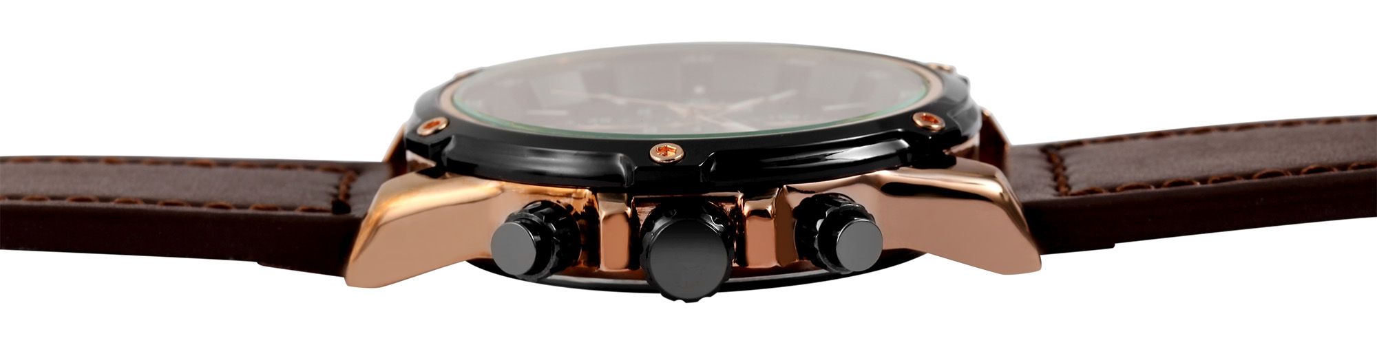 Der Herrenchronograph der Marke Elite verfügt über ein hochwertiges Quarzuhrwerk. Das braune Echtlederarmband ist am Anstoß 22 mm breit und lässt sich mit einer schwarzen Dornschließe öffnen und schließen. Die Gesamtlänge der Uhr beträgt 26 cm. Das roségoldfarbene Metallgehäuse mit schwarzer Lünette und Mineralglas hat eine Abmessung von 45 mm im Durchmesser und einer Gehäusehöhe von 12 mm. Der Gehäuseboden ist aus Edelstahl gefertigt. Mit dem Chronographen lässt sich die Zeit stoppen, diese ist dann auf den drei Totalisatoren auf sechs, neun und zwölf Uhr abzulesen. Das Modell verfügt außerdem noch über eine Datumsanzeige auf drei Uhr. Durch die mit Superluminova beschichteten Zeiger und Indexe lässt sich auch im Dunkeln die Zeit gut ablesen. Des Weiteren hat die Herrenuhr eine Wasserdichtigkeit von 3 bar. Die Herrenarmbanduhr ist ein zuverlässiger Begleiter, der vielseitig nutzbar und zudem noch ein absoluter Blickfang an Ihrem Handgelenk ist.