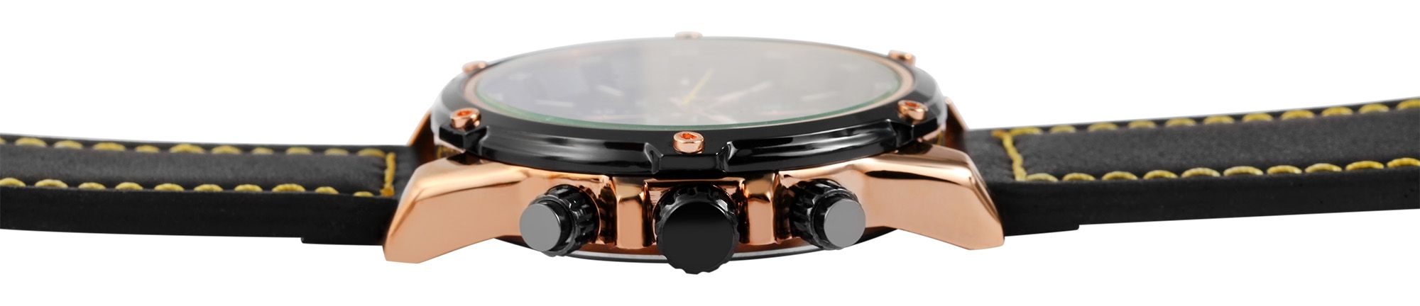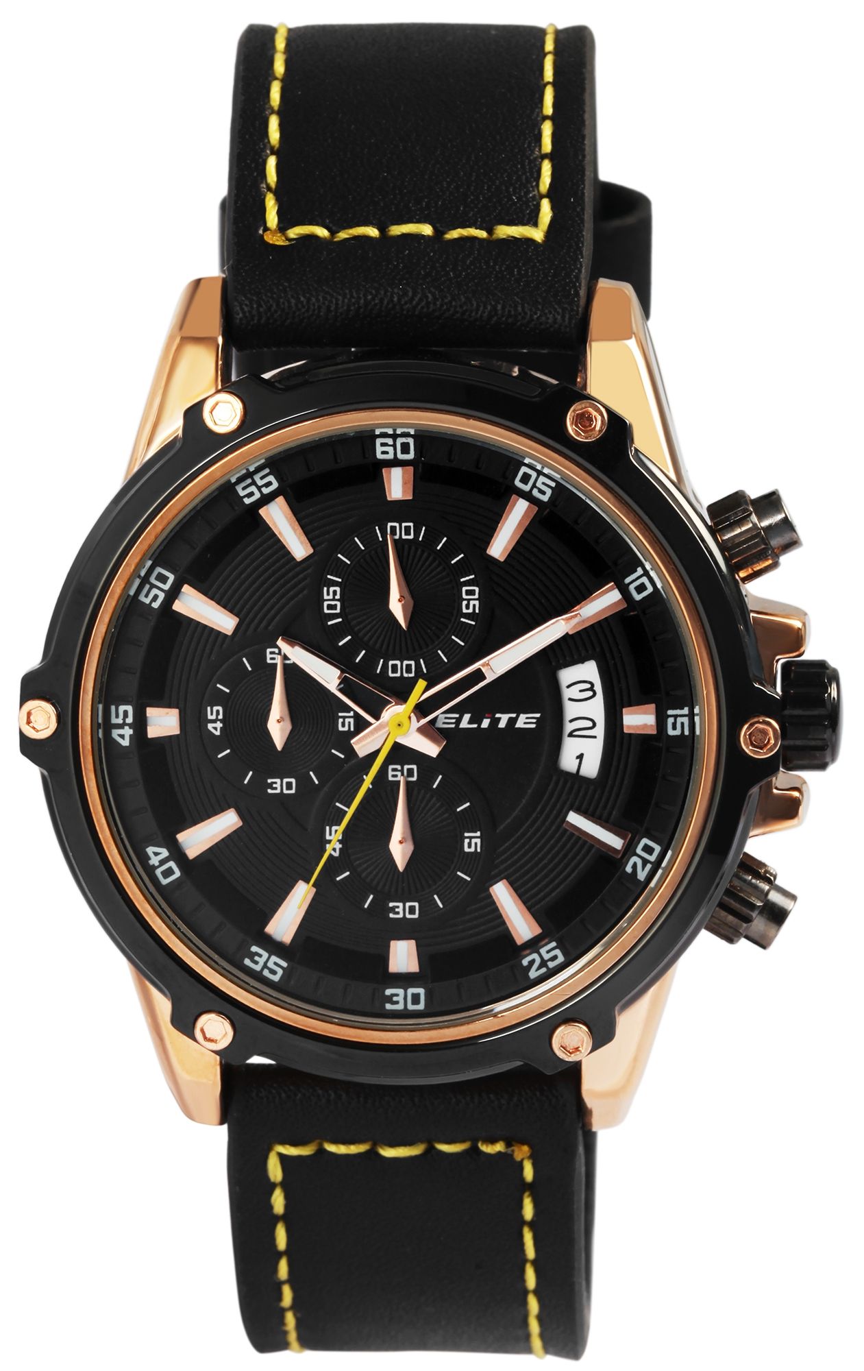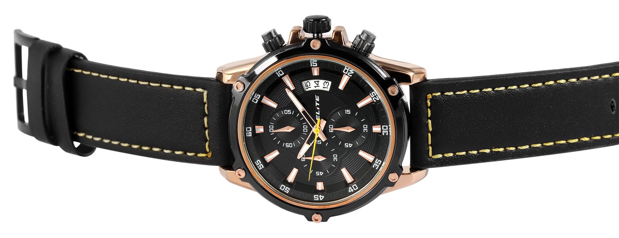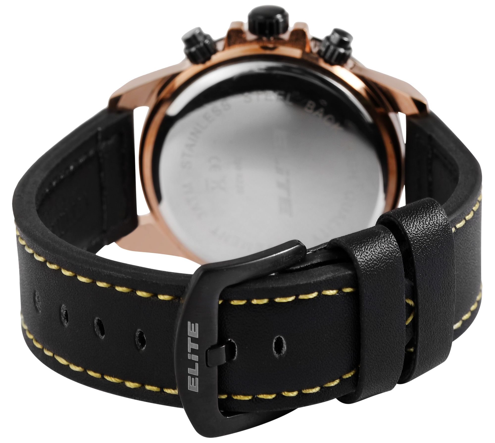Der Herrenchronograph der Marke Elite verfügt über ein hochwertiges Quarzuhrwerk. Das schwarze Echtlederarmband ist am Anstoß 22 mm breit und lässt sich mit einer schwarzen Dornschließe öffnen und schließen. Die Gesamtlänge der Uhr beträgt 26 cm. Das roségoldfarbene Metallgehäuse mit schwarzer Lünette und Mineralglas hat eine Abmessung von 45 mm im Durchmesser und einer Gehäusehöhe von 12 mm. Der Gehäuseboden ist aus Edelstahl gefertigt. Mit dem Chronographen lässt sich die Zeit stoppen, diese ist dann auf den drei Totalisatoren auf sechs, neun und zwölf Uhr abzulesen. Das Modell verfügt außerdem noch über eine Datumsanzeige auf drei Uhr. Durch die mit Superluminova beschichteten Zeiger und Indexe lässt sich auch im Dunkeln die Zeit gut ablesen. Des Weiteren hat die Herrenuhr eine Wasserdichtigkeit von 3 bar. Ein weiteres Highlight sind die gelben Nähte am Uhrenarmband. Der dazu farblich abgestimmte Sekundenzeiger rundet das Gesamtbild harmonisch ab. Die Herrenarmbanduhr ist ein zuverlässiger Begleiter, der vielseitig nutzbar und zudem noch ein absoluter Blickfang an Ihrem Handgelenk ist.