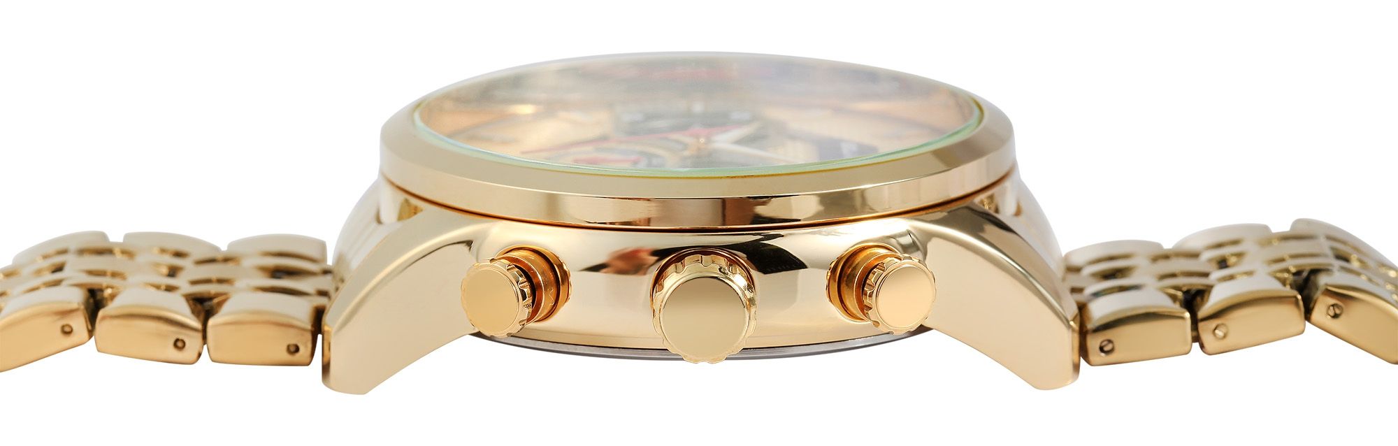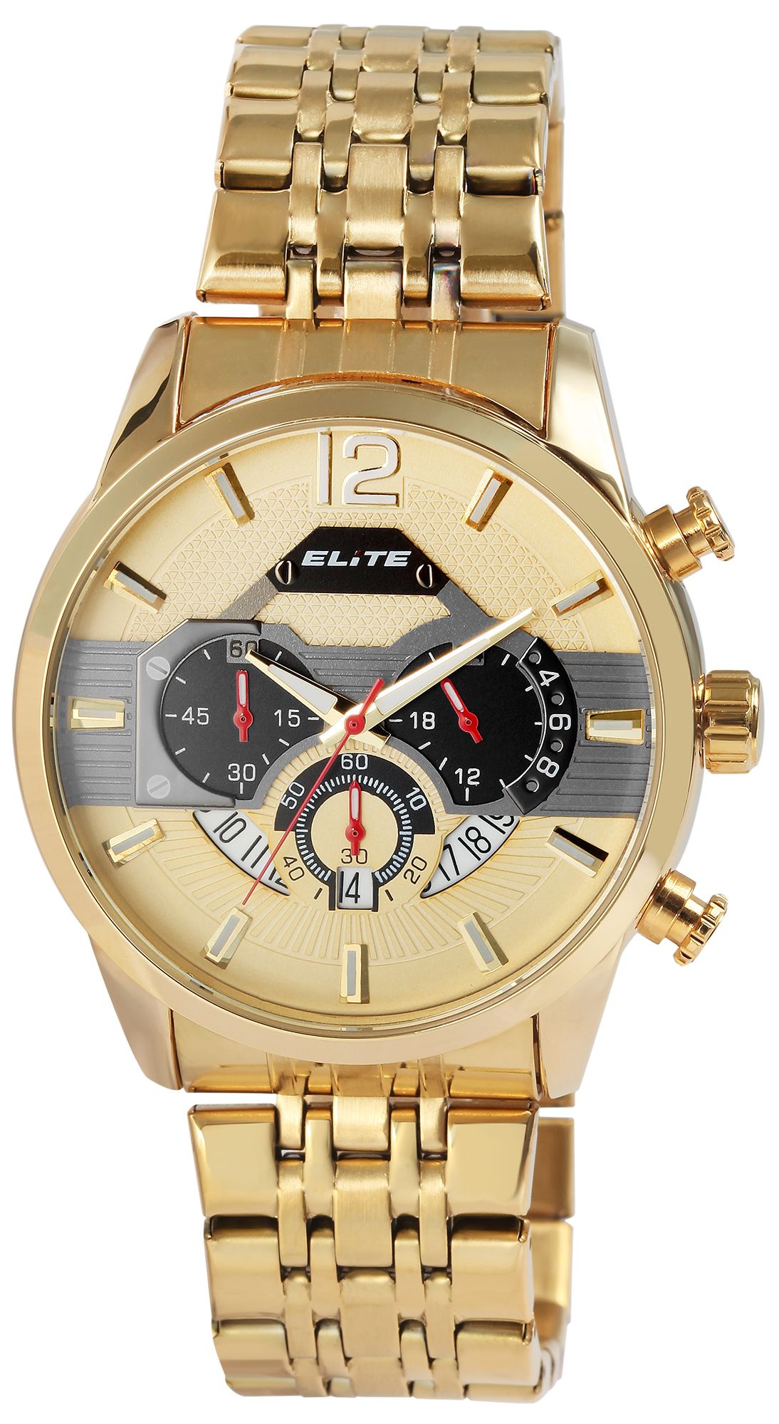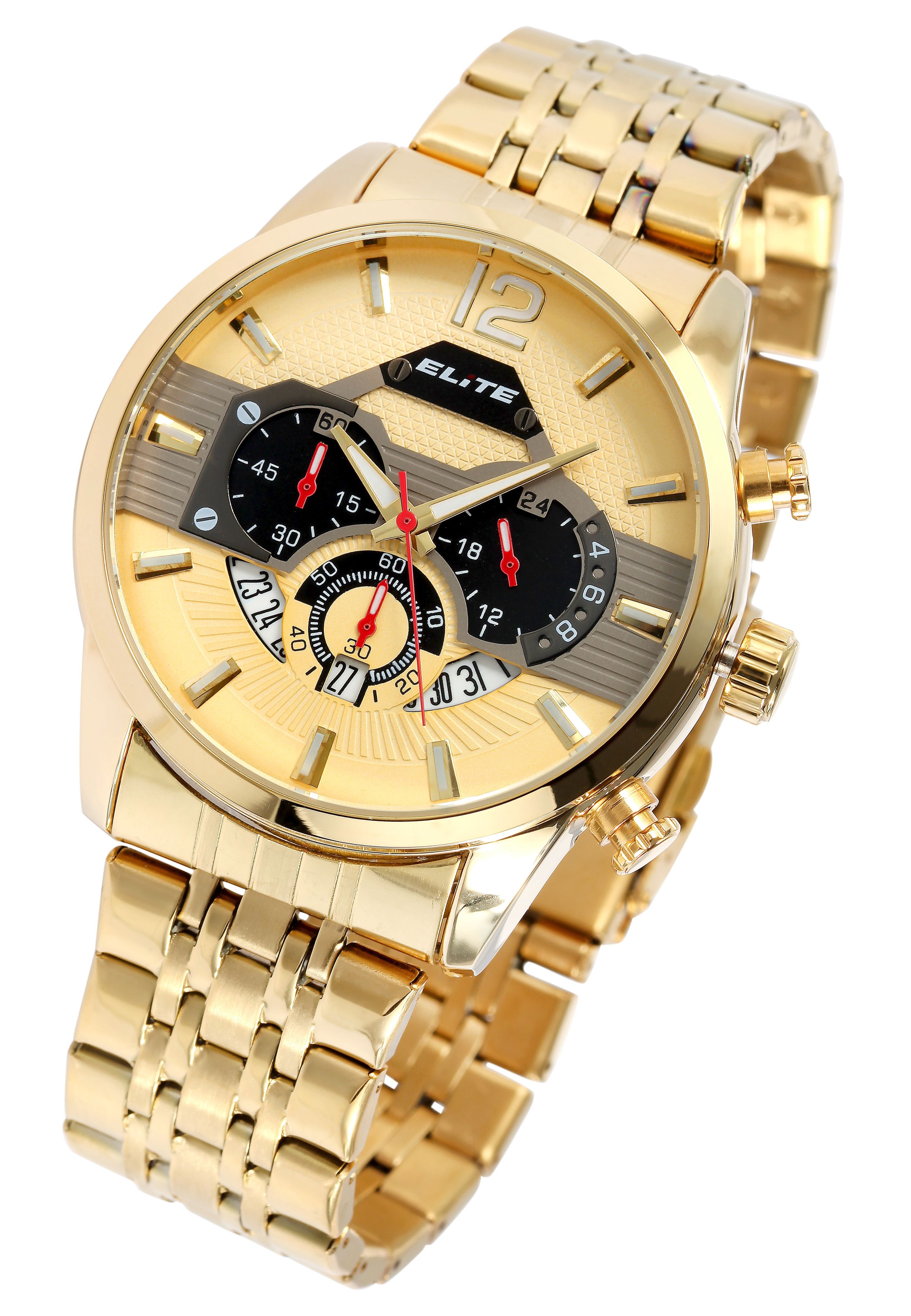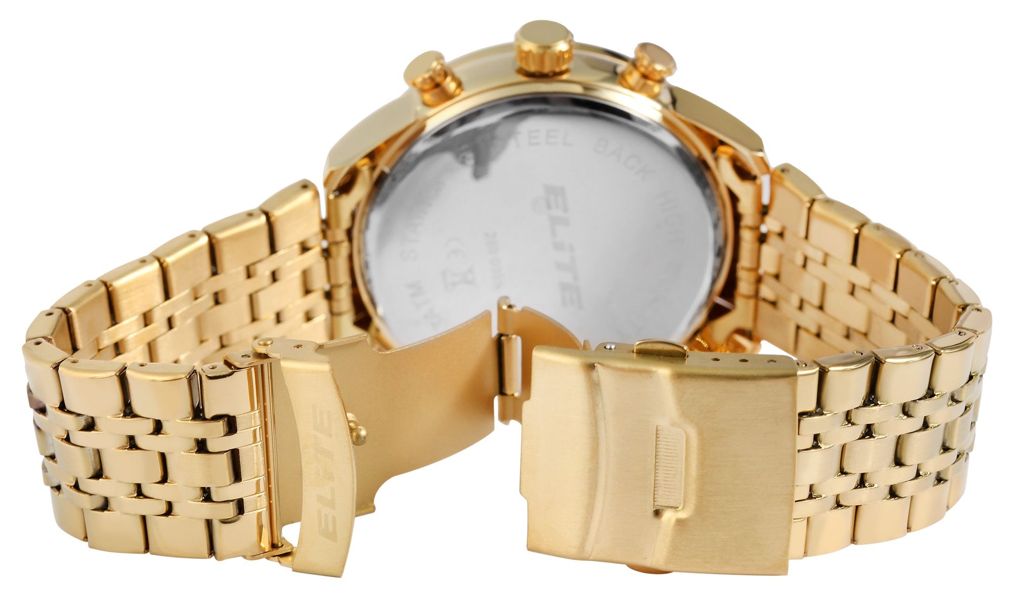 Der Herrenchronograph der Marke Elite verfügt über ein hochwertiges Quarzuhrwerk. Das goldfarbene Edelstahlarmband ist am Anstoß 24 mm breit und lässt sich mit einer Faltschließe mit Sicherheitsbügel öffnen und schließen. Aufgrund der herausnehmbaren Elemente lässt sich das Armband beliebig jedem Handgelenkumfang anpassen. Die Gesamtlänge der Uhr beträgt 23,5 cm. Das goldfarbene Metallgehäuse mit Mineralglas hat eine Abmessung von 46 mm im Durchmesser und einer Gehäusehöhe von 14 mm. Der Gehäuseboden ist aus Edelstahl gefertigt. Mit dem Chronographen lässt sich die Zeit stoppen, diese ist dann auf den drei Totalisatoren auf drei, sechs und neun Uhr abzulesen. Das Modell verfügt außerdem noch über eine Datumsanzeige auf sechs Uhr. Durch die mit Superluminova beschichteten Zeiger und Indexe lässt sich auch im Dunkeln die Zeit gut ablesen. Des Weiteren hat die Herrenuhr eine Wasserdichtigkeit von 3 bar. Die Herrenarmbanduhr ist ein zuverlässiger Begleiter, der vielseitig nutzbar und zudem noch ein absoluter Blickfang an Ihrem Handgelenk ist.