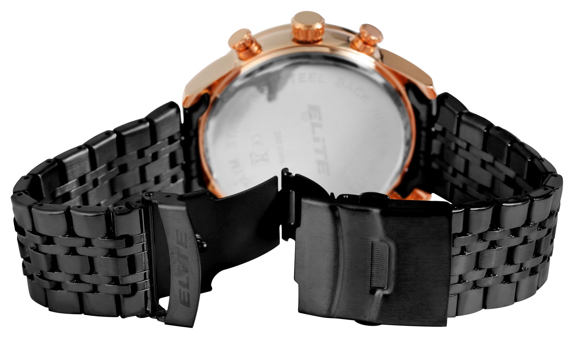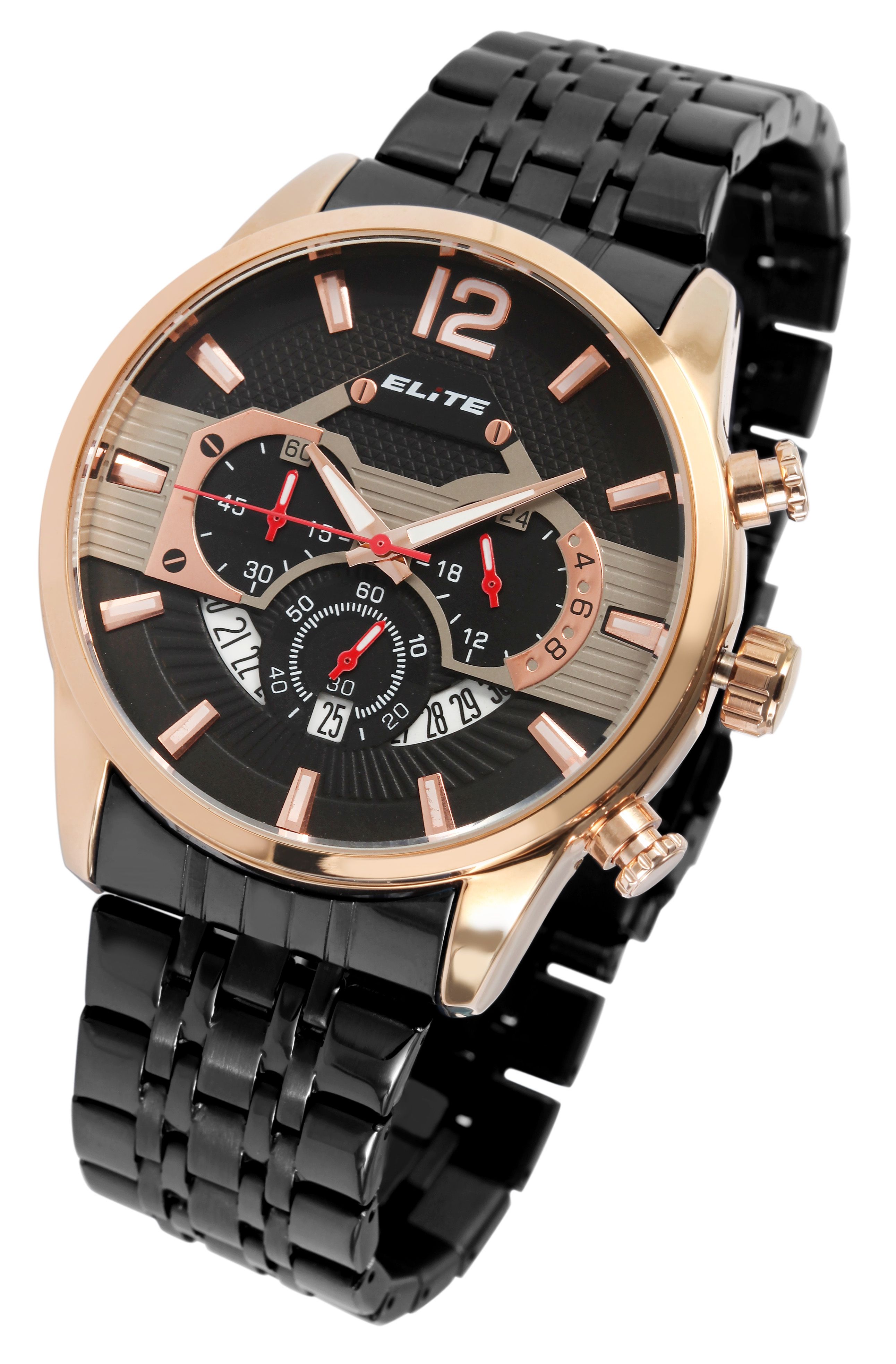 Der Herrenchronograph der Marke Elite verfügt über ein hochwertiges Quarzuhrwerk. Das schwarze Edelstahlarmband ist am Anstoß 24 mm breit und lässt sich mit einer Faltschließe mit Sicherheitsbügel öffnen und schließen. Aufgrund der herausnehmbaren Elemente lässt sich das Armband beliebig jedem Handgelenkumfang anpassen. Die Gesamtlänge der Uhr beträgt 23,5 cm. Das roségoldfarbene Metallgehäuse mit Mineralglas hat eine Abmessung von 46 mm im Durchmesser und einer Gehäusehöhe von 14 mm. Der Gehäuseboden ist aus Edelstahl gefertigt. Mit dem Chronographen lässt sich die Zeit stoppen, diese ist dann auf den drei Totalisatoren auf drei, sechs und neun Uhr abzulesen. Das Modell verfügt außerdem noch über eine Datumsanzeige auf sechs Uhr. Durch die mit Superluminova beschichteten Zeiger und Indexe lässt sich auch im Dunkeln die Zeit gut ablesen. Des Weiteren hat die Herrenuhr eine Wasserdichtigkeit von 3 bar. Die Herrenarmbanduhr ist ein zuverlässiger Begleiter, der vielseitig nutzbar und zudem noch ein absoluter Blickfang an Ihrem Handgelenk ist.