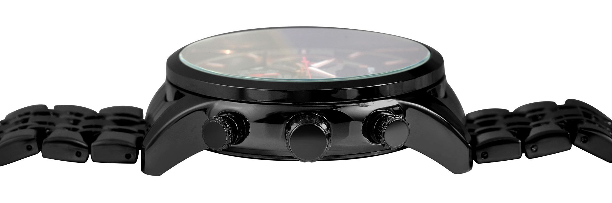 Der Herrenchronograph der Marke Elite verfügt über ein hochwertiges Quarzuhrwerk. Das schwarze Edelstahlarmband ist am Anstoß 24 mm breit und lässt sich mit einer Faltschließe mit Sicherheitsbügel öffnen und schließen. Aufgrund der herausnehmbaren Elemente lässt sich das Armband beliebig jedem Handgelenkumfang anpassen. Die Gesamtlänge der Uhr beträgt 23,5 cm. Das schwarze Metallgehäuse mit Mineralglas hat eine Abmessung von 46 mm im Durchmesser und einer Gehäusehöhe von 14 mm. Der Gehäuseboden ist aus Edelstahl gefertigt. Mit dem Chronographen lässt sich die Zeit stoppen, diese ist dann auf den drei Totalisatoren auf drei, sechs und neun Uhr abzulesen. Das Modell verfügt außerdem noch über eine Datumsanzeige auf sechs Uhr. Durch die mit Superluminova beschichteten Zeiger und Indexe lässt sich auch im Dunkeln die Zeit gut ablesen. Des Weiteren hat die Herrenuhr eine Wasserdichtigkeit von 3 bar. Die Herrenarmbanduhr ist ein zuverlässiger Begleiter, der vielseitig nutzbar und zudem noch ein absoluter Blickfang an Ihrem Handgelenk ist.