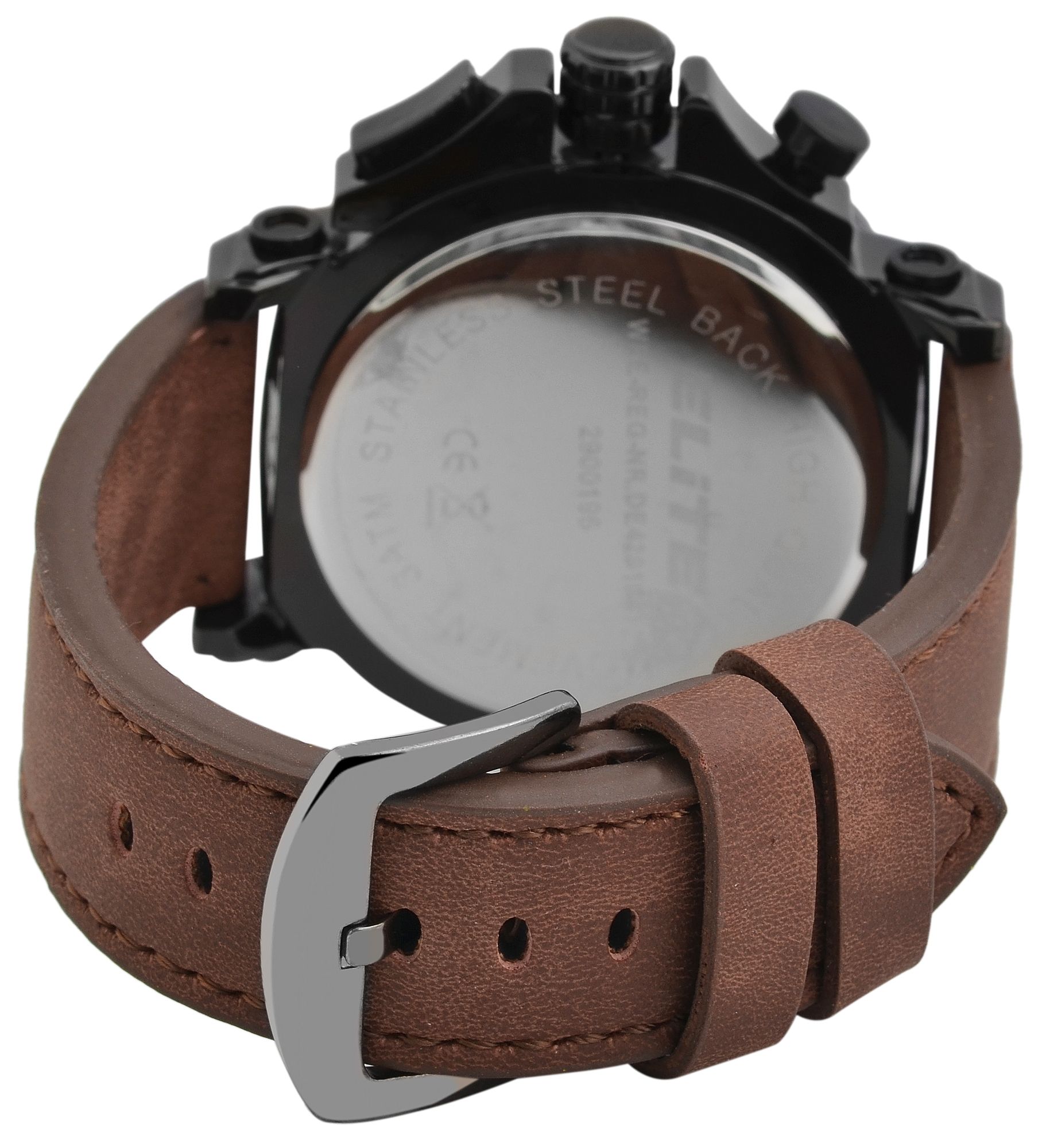 Der Herrenchronograph der Marke Elite verfügt über ein hochwertiges Quarzuhrwerk. Das braune Lederimitatarmband ist am Anstoß 24 mm breit und lässt sich mit einer Dornschließe öffnen und schließen. Die Gesamtlänge der Uhr beträgt 26 cm. Das schwarze Metallgehäuse mit Mineralglas hat eine Abmessung von 47 mm im Durchmesser und einer Gehäusehöhe von 15 mm. Der Gehäuseboden ist aus Edelstahl gefertigt. Mit dem Chronographen lässt sich die Zeit stoppen, diese ist dann auf den drei Totalisatoren auf sechs, neun und zwölf Uhr abzulesen. Die Uhr verfügt außerdem noch über eine Datumsanzeige. Durch die mit Superluminova beschichteten Zeiger und Indexe lässt sich auch im Dunkeln die Zeit gut ablesen. Des Weiteren hat die Herrenuhr eine Wasserdichtigkeit von 3 bar. Rundum ist diese Uhr ein sportlicher Zeitgeber und ein toller Begleiter für den Alltag.