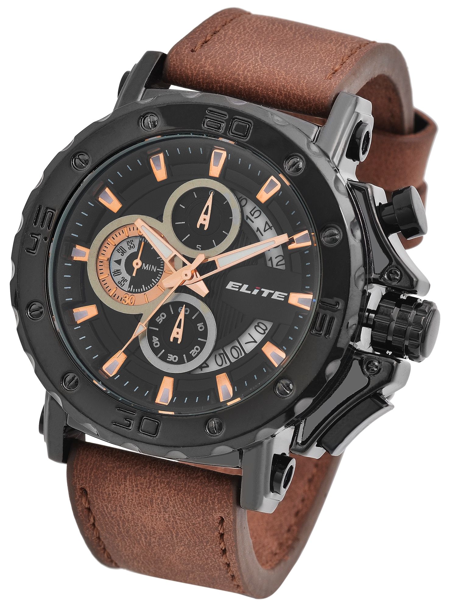 ELITE Herrenchronograph mit Lederimitationsarmband in braun/schwarz