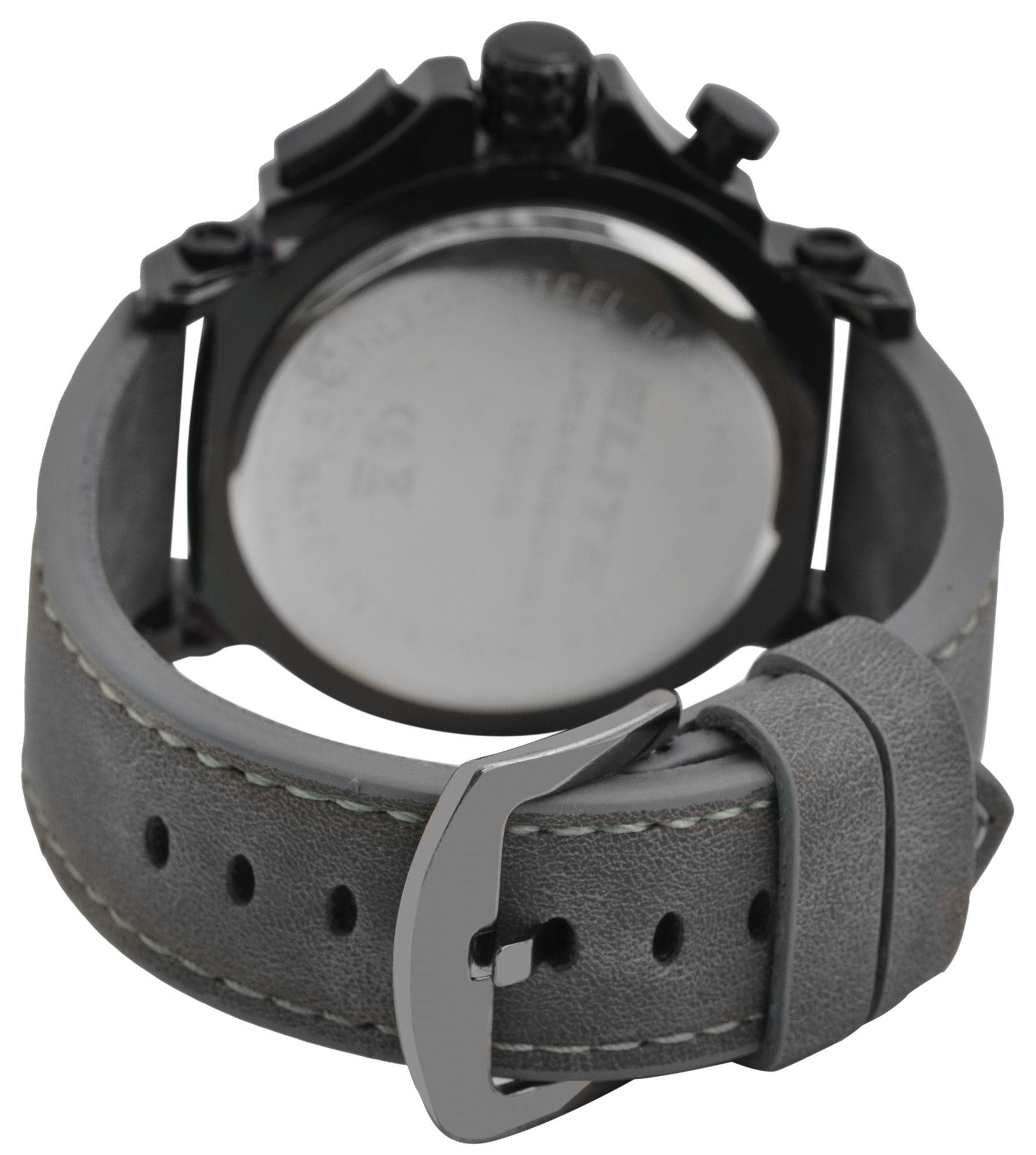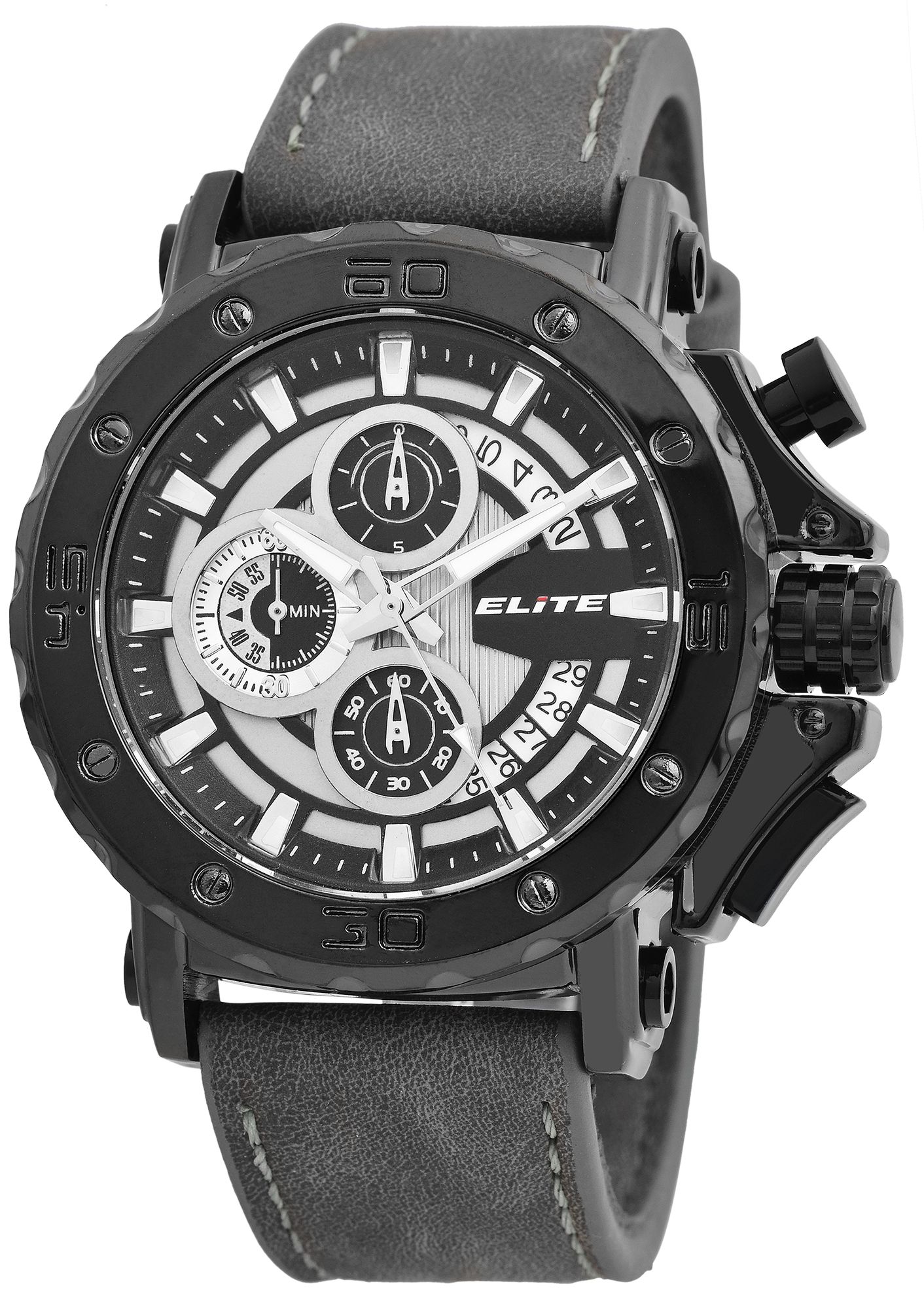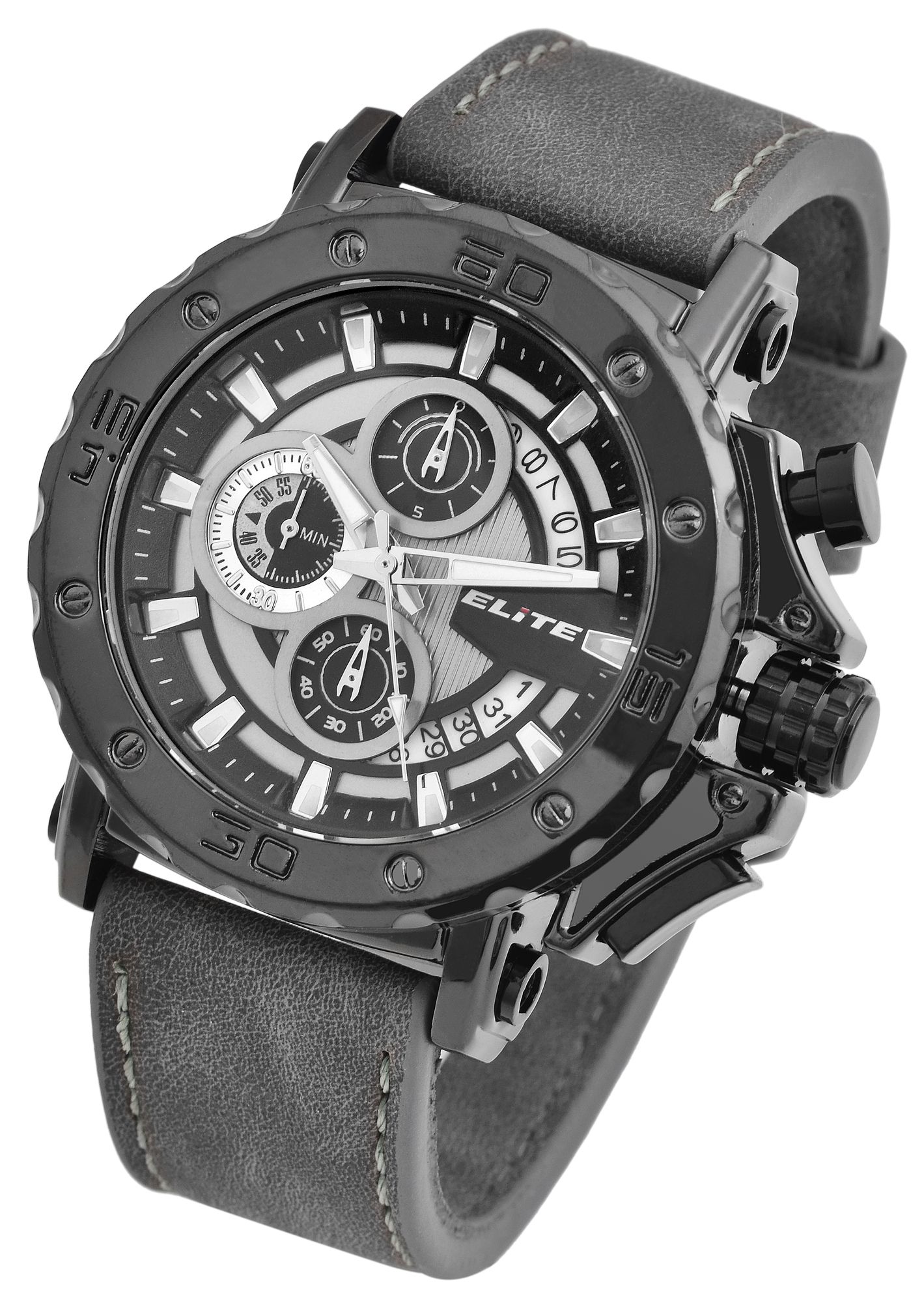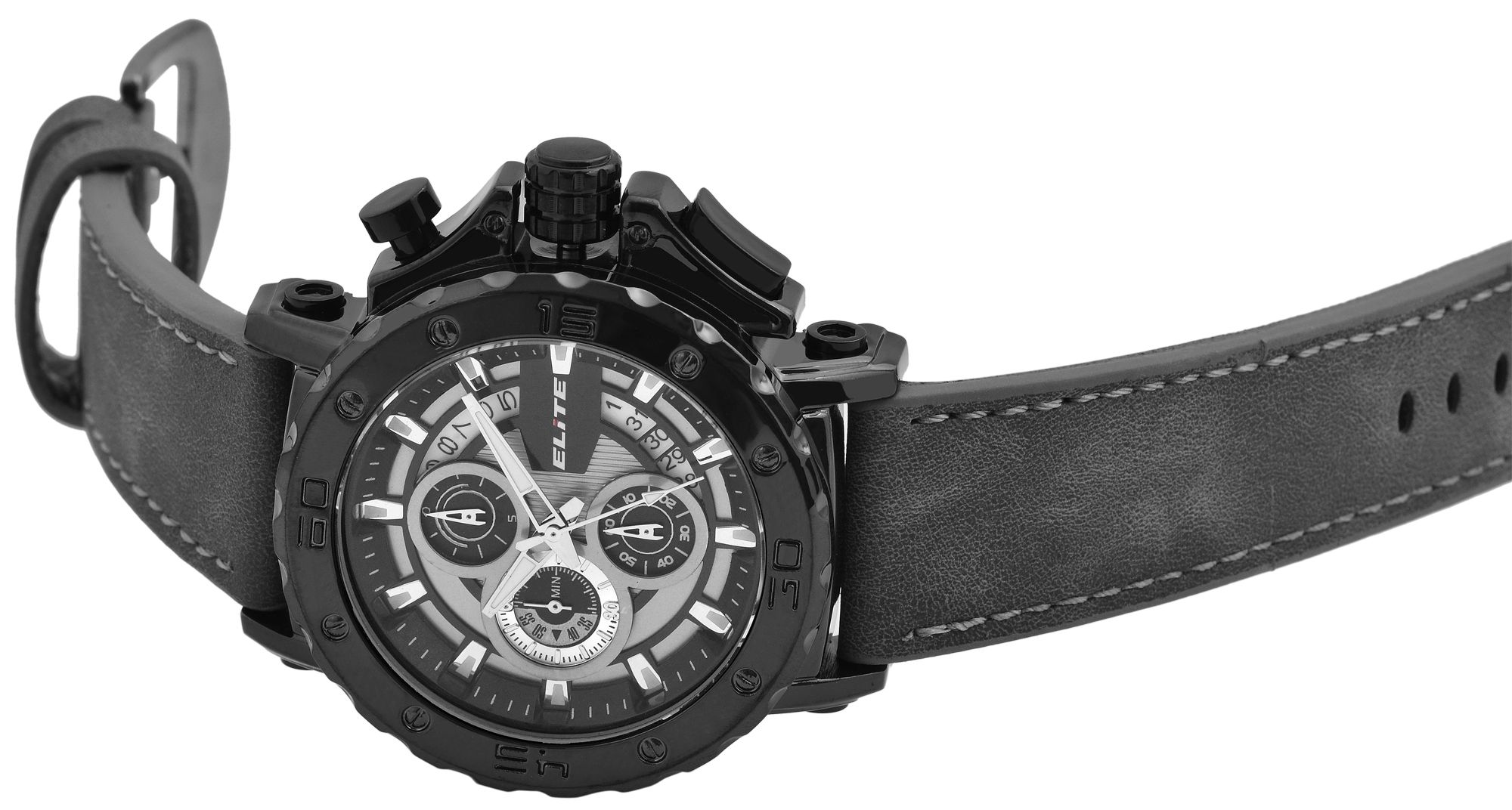 Der Herrenchronograph der Marke Elite verfügt über ein hochwertiges Quarzuhrwerk. Das graue Lederimitatarmband ist am Anstoß 24 mm breit und lässt sich mit einer Dornschließe öffnen und schließen. Die Gesamtlänge der Uhr beträgt 26 cm. Das schwarze Metallgehäuse mit Mineralglas hat eine Abmessung von 47 mm im Durchmesser und einer Gehäusehöhe von 15 mm. Der Gehäuseboden ist aus Edelstahl gefertigt. Mit dem Chronographen lässt sich die Zeit stoppen, diese ist dann auf den drei Totalisatoren auf sechs, neun und zwölf Uhr abzulesen. Die Uhr verfügt außerdem noch über eine Datumsanzeige. Durch die mit Superluminova beschichteten Zeiger und Indexe lässt sich auch im Dunkeln die Zeit gut ablesen. Des Weiteren hat die Herrenuhr eine Wasserdichtigkeit von 3 bar. Rundum ist diese Uhr ein sportlicher Zeitgeber und ein toller Begleiter für den Alltag.