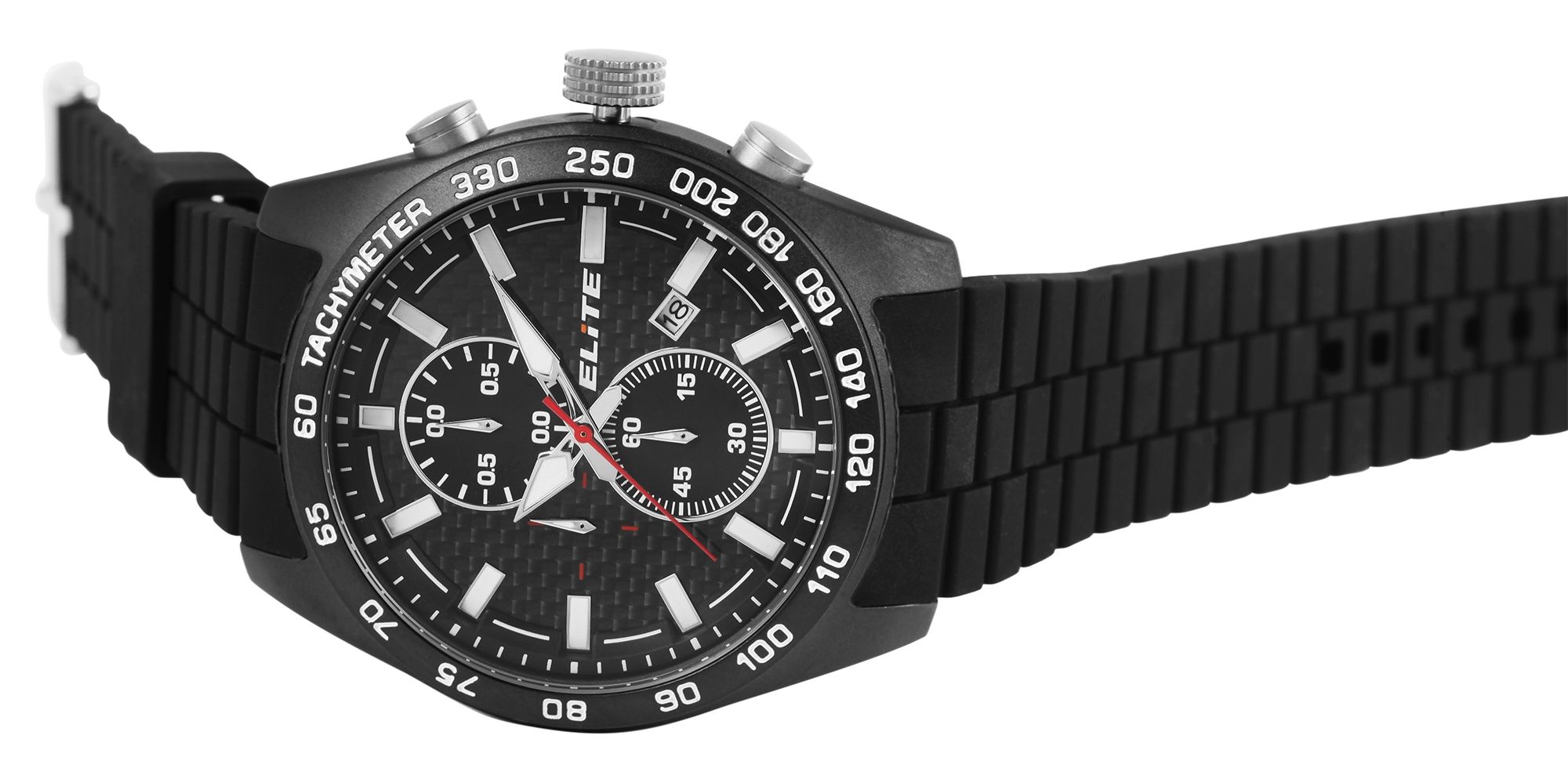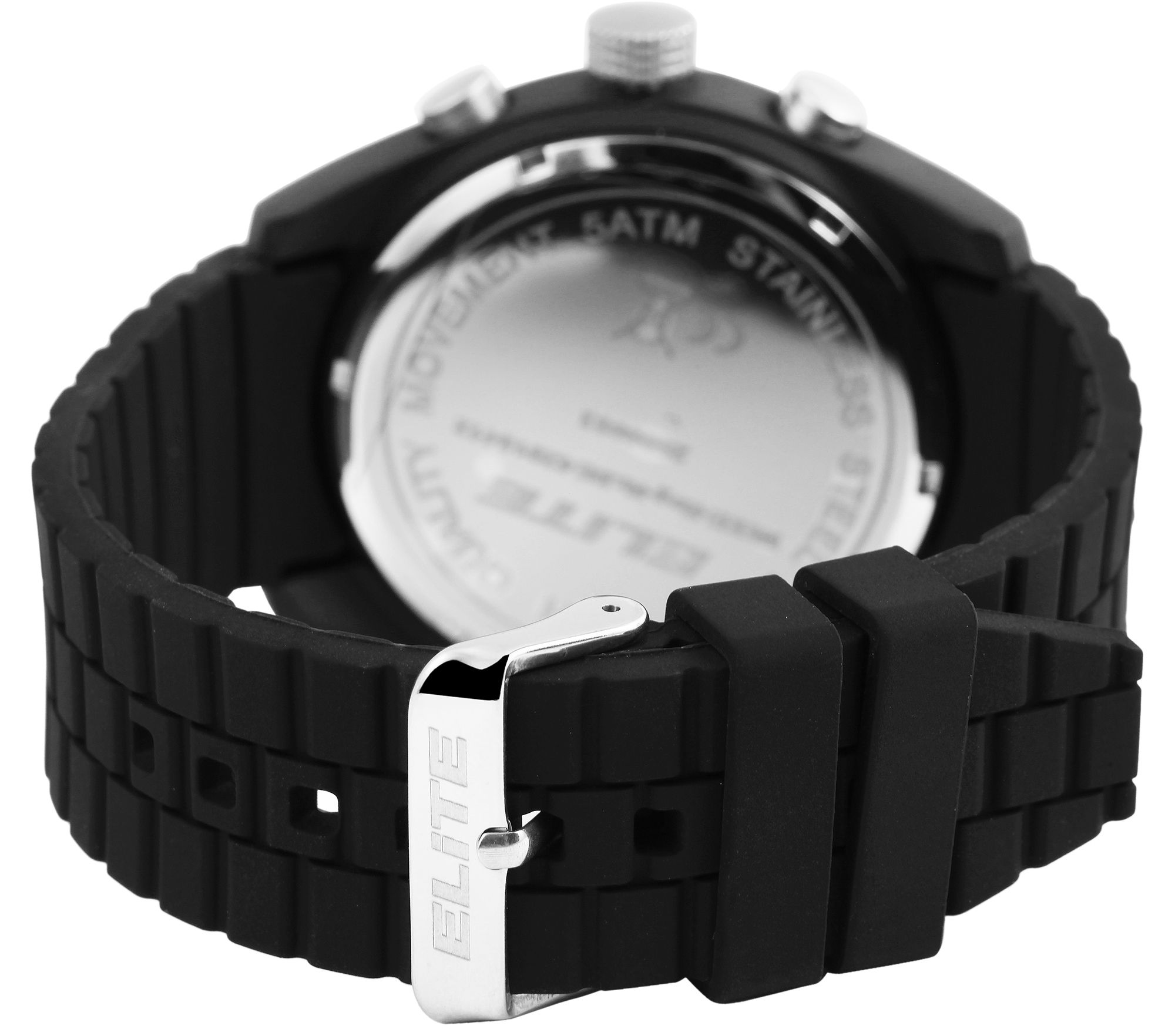 Der Herrenchronograph der Marke Elite verfügt über ein hochwertiges Quarzuhrwerk. Das schwarze Silikonarmband ist am Anstoß 25 mm breit und lässt sich mit einer silberfarbenen Dornschließe öffnen und schließen. Die Gesamtlänge der Uhr beträgt 27 cm. Das anthrazitfarbene Metallgehäuse mit Mineralglas hat eine Abmessung von 48 mm im Durchmesser und einer Gehäusehöhe von 16 mm. Der Gehäuseboden ist aus Edelstahl gefertigt. Mit dem Chronographen lässt sich die Zeit stoppen, diese ist dann auf den drei Totalisatoren auf sechs, neun und zwölf Uhr abzulesen. Die Uhr verfügt außerdem noch über eine Datumsanzeige auf vier Uhr. Durch die mit Superluminova beschichteten Zeiger und Indexe lässt sich auch im Dunkeln die Zeit gut auf dem schwarzen Zifferblatt ablesen. Die Drücker und die Krone sind ebenfalls silberfarbig und passen sich optisch gut dem Gesamtbild der Uhr an. Des Weiteren hat die Herrenuhr eine Wasserdichtigkeit von 5 bar. Rundum ist diese Uhr ein sportlicher Zeitgeber und ein toller Begleiter für den Alltag.
