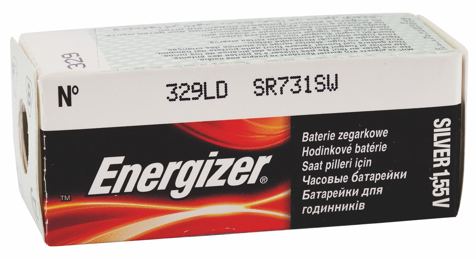 Knopfzellen Nr. 329 der Marke Energizer für Uhren mit 0% Quecksilber im 10er- Blister, einzeln verpackt. Verschiedene Größen für verschiedene Uhrwerke. Die elektrische Spannung für jede Batterie beträgt 1,55 V.