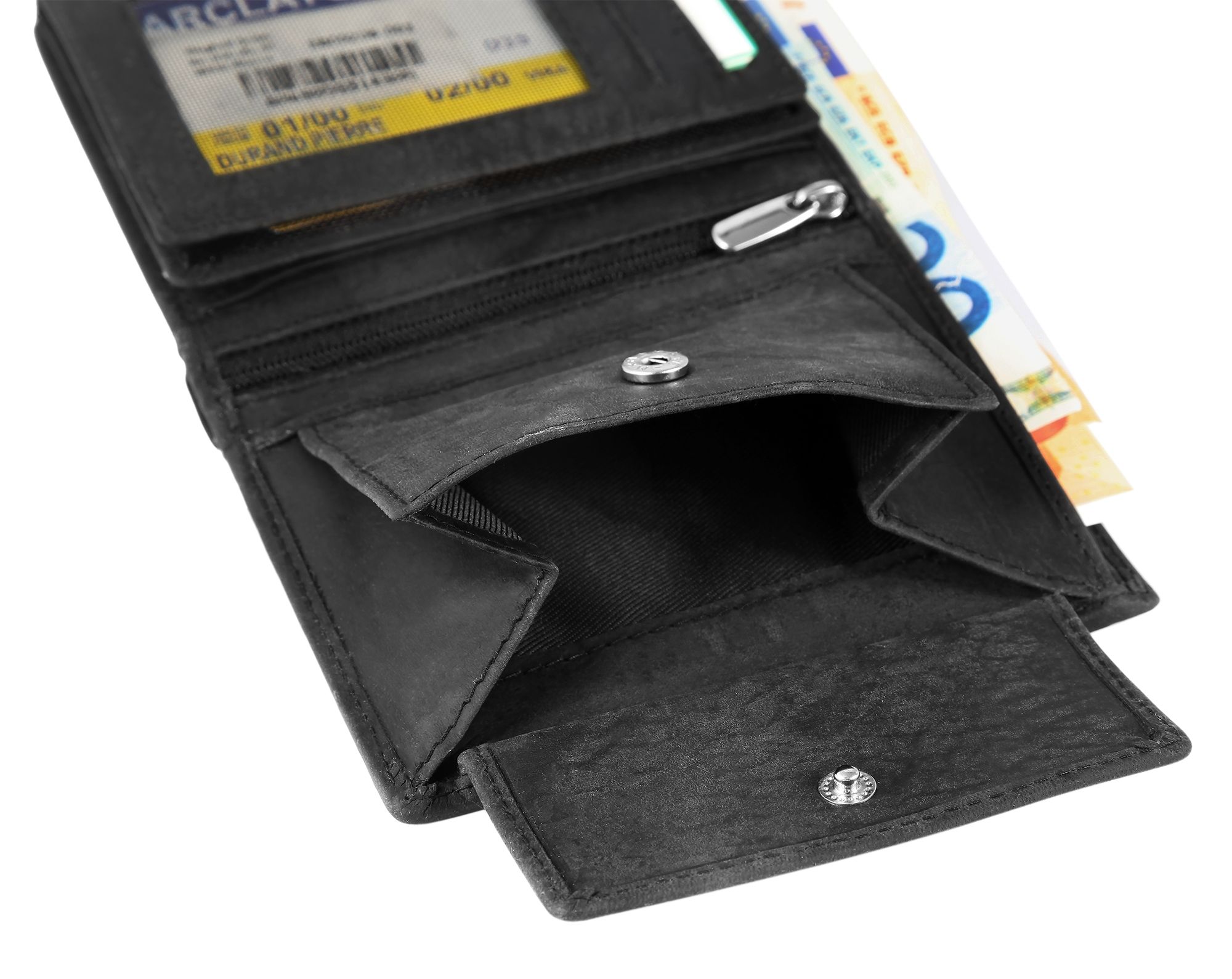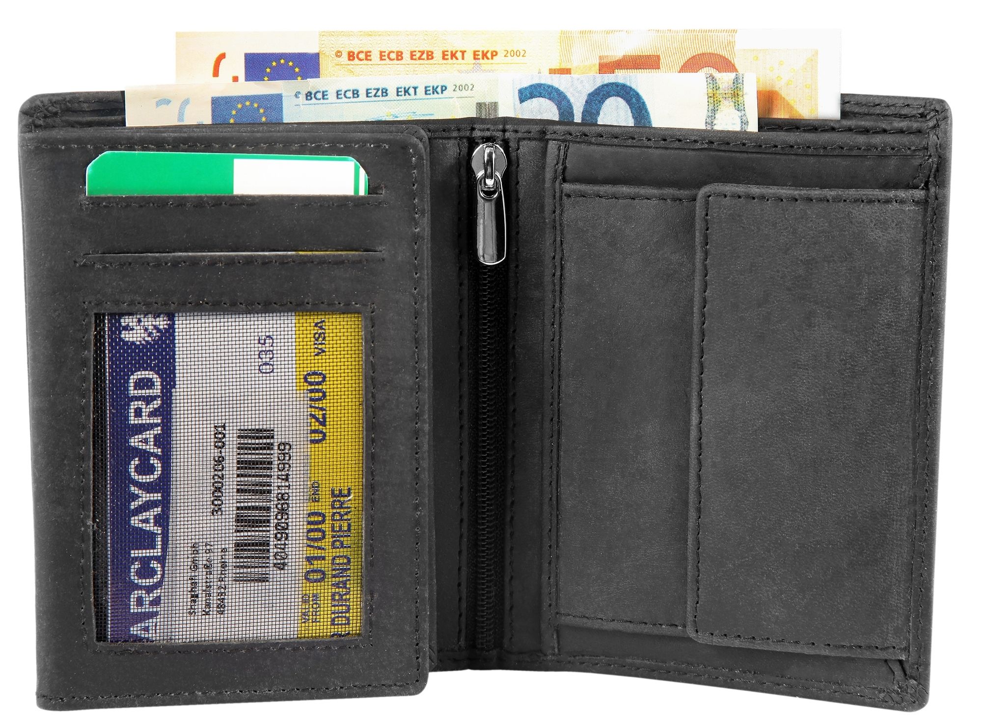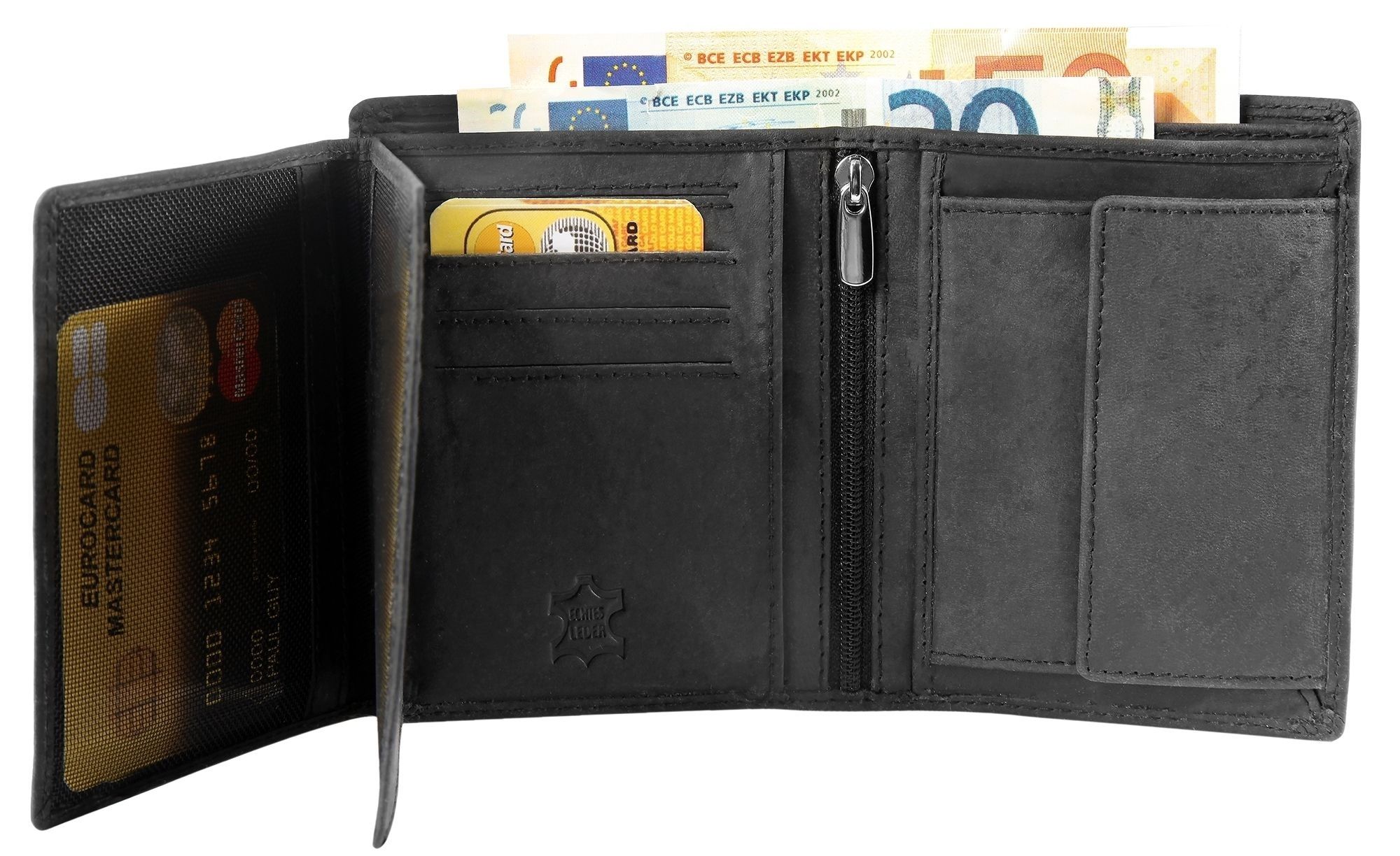 Die Geldbörse der Marke Leonardo Verrelli wurde im Hochformat aus echtem Rindsleder in Hunteroptik gefertigt und hat eine leicht raue schwarze Oberfläche. Die Geldbörse ist ein wahres Platzwunder und bietet viel Stauraum für alle wichtigen Dokumente und Karten. Aufgeteilt ist die Börse in neun Kreditkartenfächer, ein transparentes Kreditkartenfach mit Netz, zwei Geldscheinfächer, ein Münzfach, zwei Einsteckfächer, zwei transparente Ausweisfächer und ein Reißverschlussfach. Die Maße der Geldbörse ergeben sich aus einer Länge von 12,2 cm, einer Breite von 9,4 cm und einer Höhe von 2,5 cm. Die Geldbörse hat zwei ausklappbare Mäppchen.
