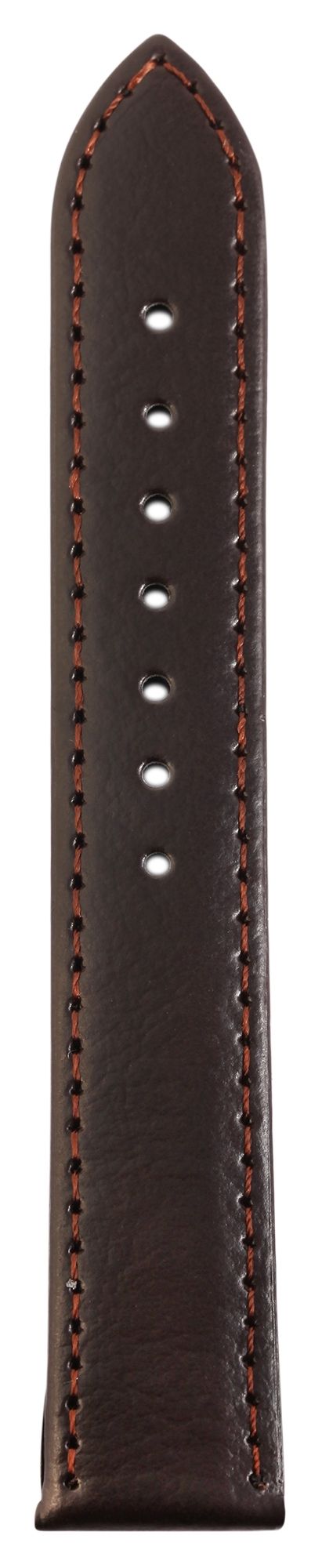 Klassiches Echtleder Ersatzarmband in der Farbe Dunkelbraun. DIe Außennaht ist im passendem Hellbraun. Das Armband besitzt eiune Stegbreite von 18 mm, eine Dornschließe und zwei Armbandschlaufen. Der Lochteil läuft am Ende spitz zu. Die Armbänder werden in einem Display geliefert. Das Display ist mit insgesamt 10 Ersatzarmbändern mit silberfarbiger Dornschließe bestückt.