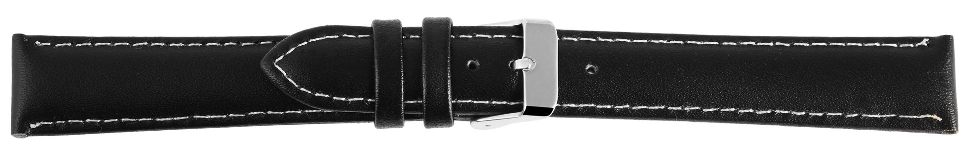Das schwarze Uhrenarmband aus Echtleder ist in den Anstoßbreiten 12 mm, 14 mm, 16 mm, 18 mm, 20 mm, 22 mm und 24 mm erhältlich. Das Lederarmband ist leicht gepolstert, sodass die Materialstärke ca. 4 mm beträgt. Es hat eine glatte Oberfläche und ist außen mit einer weißen Naht vernäht. Die Gesamtlänge des Bandes beträgt variiert mit der Anstoßbreite. Der Schließenanstoß ist 2 mm schmaler als die Anstoßbreite, da das Band schmal zuläuft. An dem Band ist eine silberfarbene Dornschließe angebracht und die erste Schlaufe ist genäht.