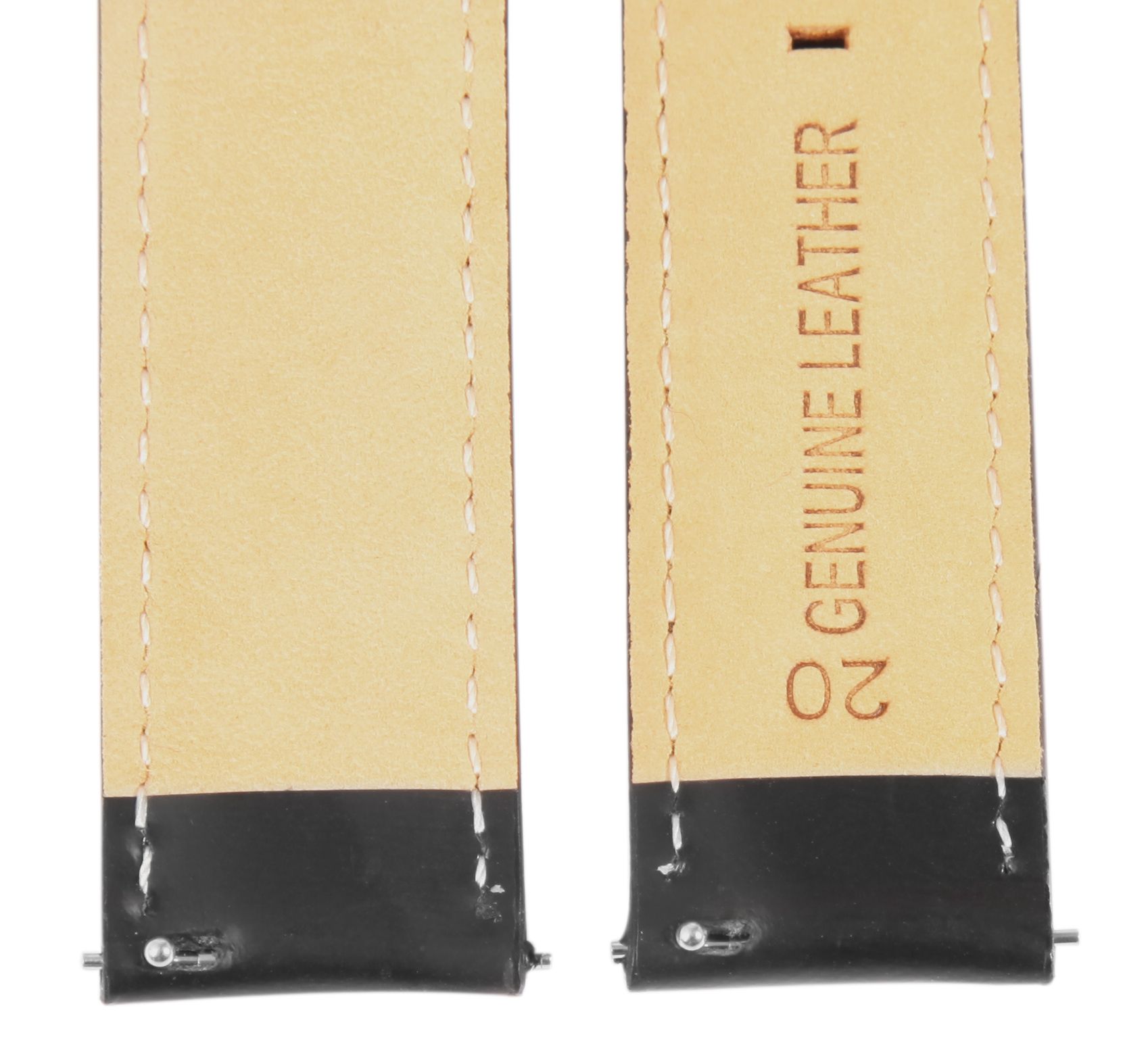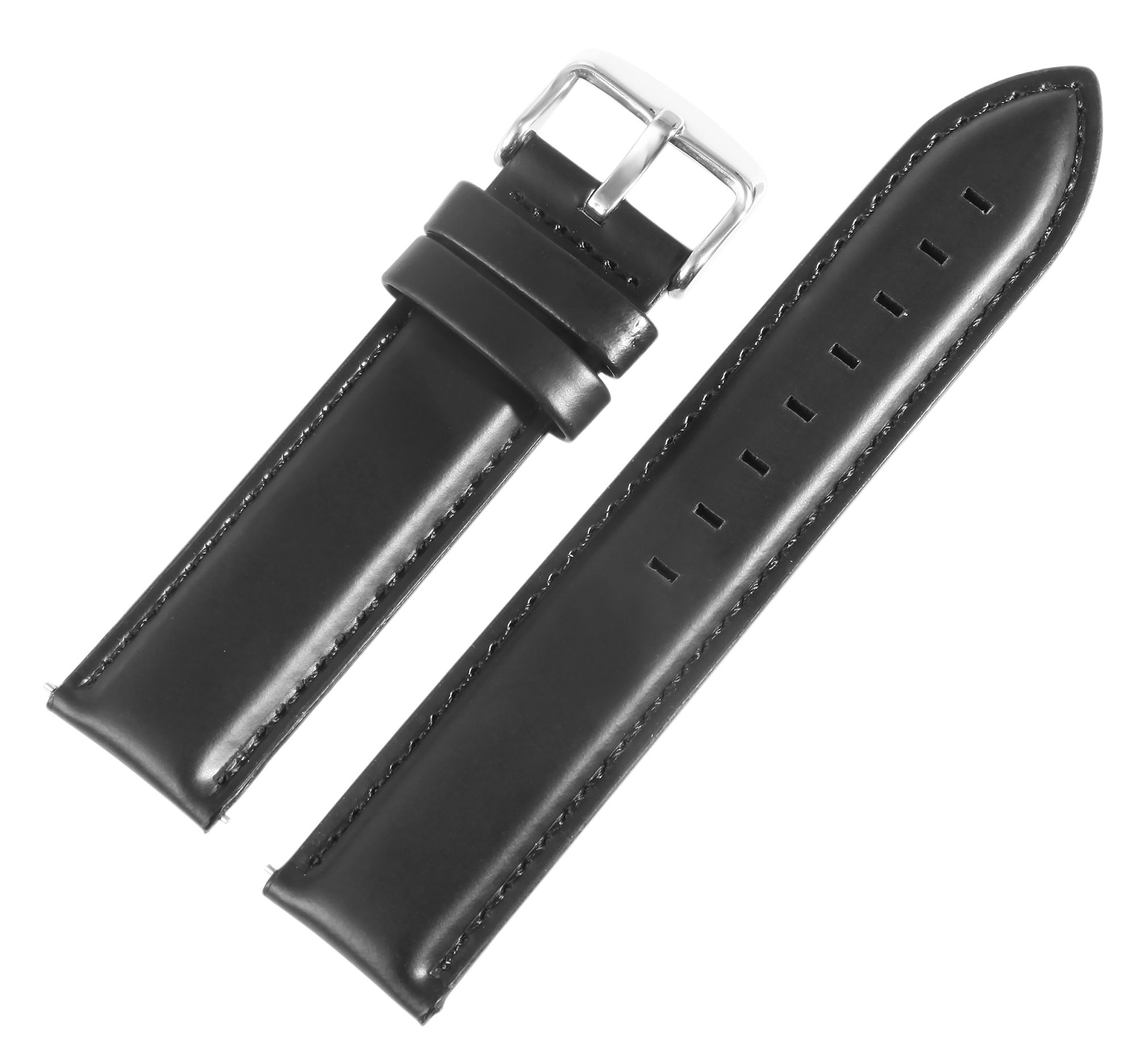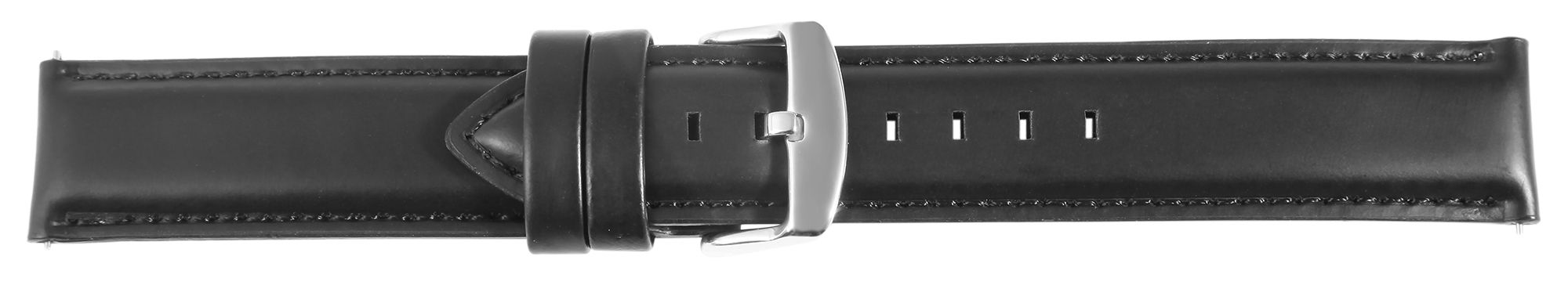 Die glatte, glänzende Oberfläche und die schwarze Naht sorgen für eine langlebige und hochwertige Optik. Das Band verjüngt sich um 2 mm zur silberfarbenen Dornschließe, wodurch es sich angenehm und leicht anlegen lässt. Die Materialstärke beträgt 4 mm und die Gesamtlänge variiert je nach Anstoßbreite zwischen 18,5 cm und 20,5 cm. Besonders praktisch: Dank des integrierten Schnellverschlusses (Quick-Release) können Sie das Band in Sekundenschnelle und ganz ohne Werkzeug wechseln.
