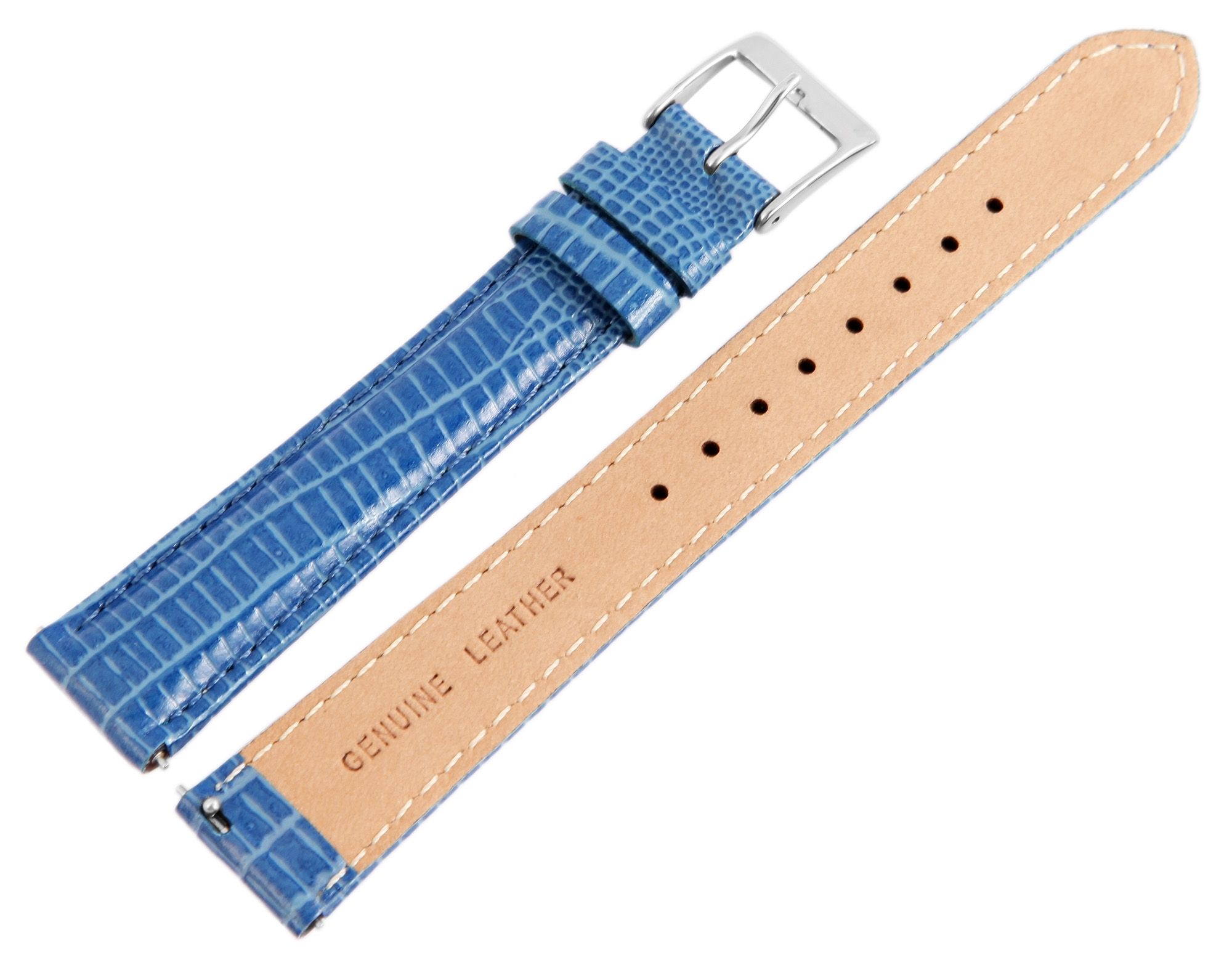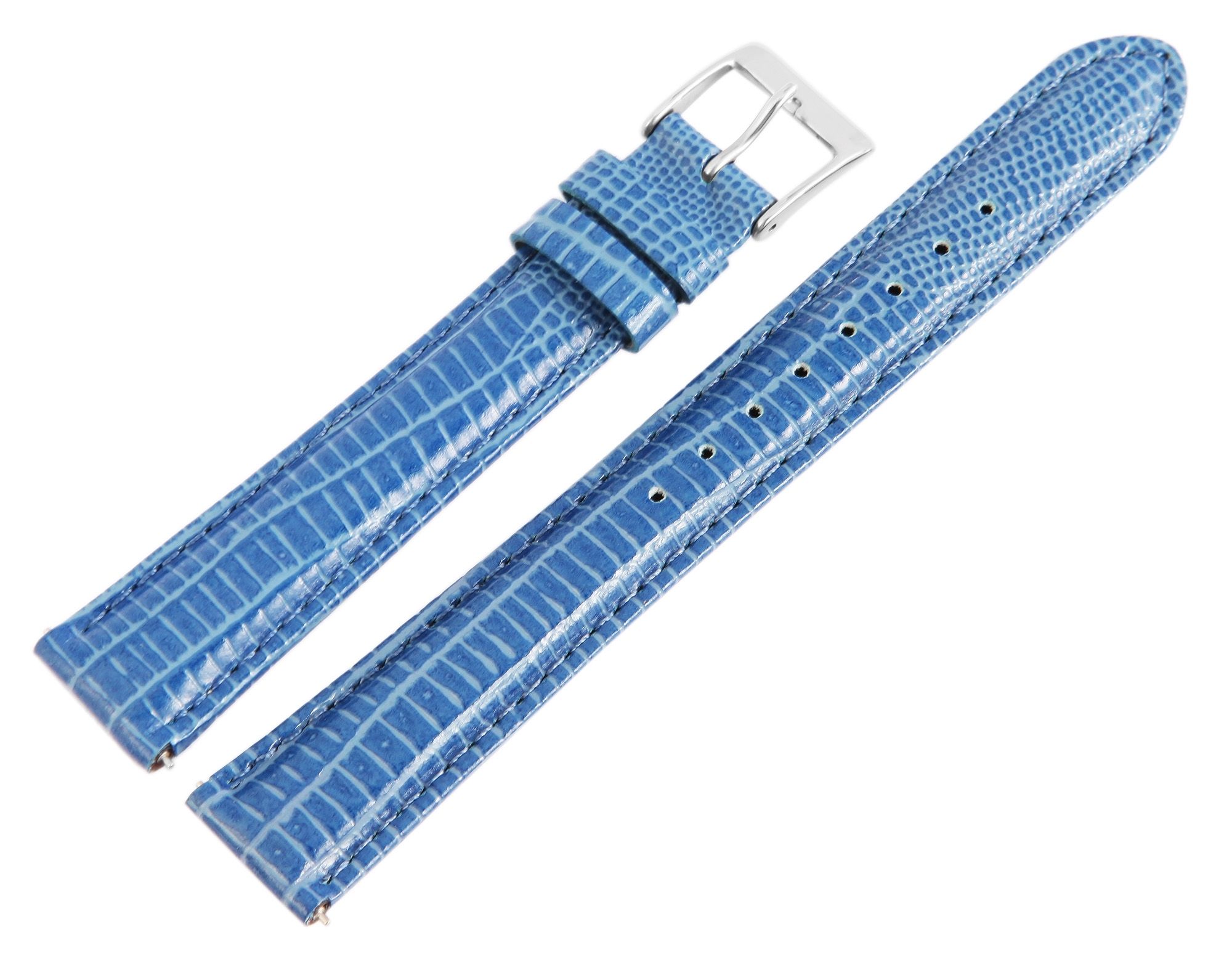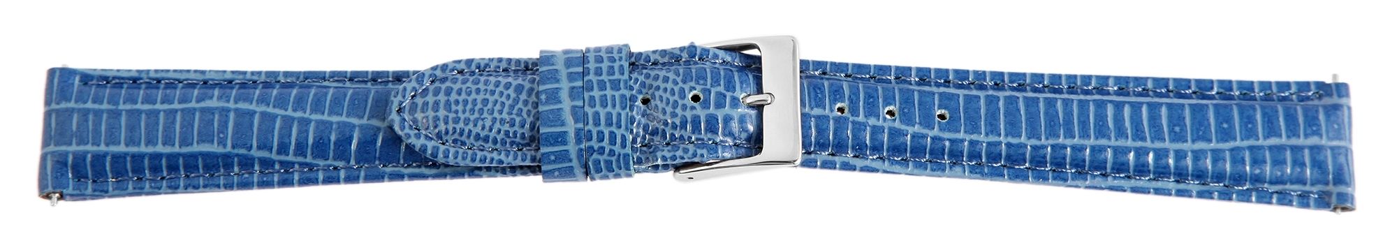 Echtleder Ersatzarmband in der Farbe Blau. Das Gesamte Armband ist gepolstert. Es wurde aus Rindsleder gefertigt und im Eidechsenlederdesign geprägt. Das Armband besitzt eine Stegbreite von 16 mm, eine silberfarbige Dornschließe sowie zwei Armbandschlaufen. Der Lochteil läuft am Ende spitz zu.