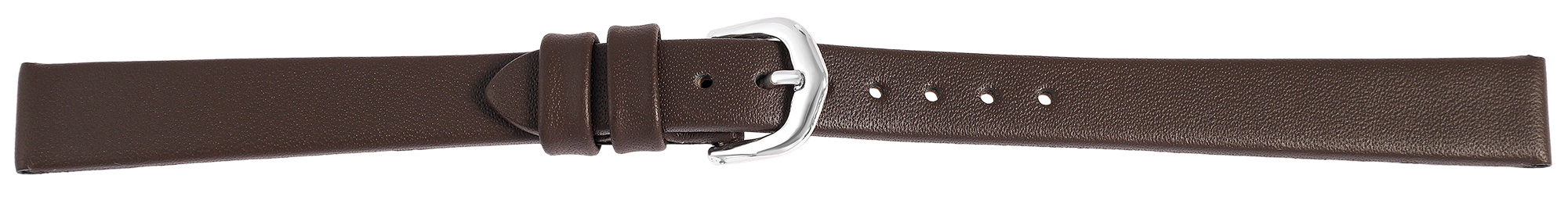 Das braune Uhrenarmband wurde aus Echtleder gefertigt und es ist in den Anstoßbreiten 12 mm, 14 mm, 16 mm, 18 mm, 20 mm und 22 mm erhältlich. Der Schließenanstoß ist 2 mm schmaler als die Anstoßbreite, da das Band dort schmaler zuläuft. Lediglich bei der Breite von 14 mm ist Schließenanstoß und Anstoßbreite gleich breit. Die Gesamtlänge des Bandes beträgt 20 cm und die Materialstärke beträgt 2,5 mm. Das Ersatzarmband lässt sich mit einer silberfarbenen, hochglanzpolierten Dornschließe öffnen und schließen. Das glänzende Finish in Kombination mit dem glatten Lederband unterstreicht das schöne Design des Uhrenarmbandes und sorgt für ein schnelles und leichthändiges An- und Ablegen.