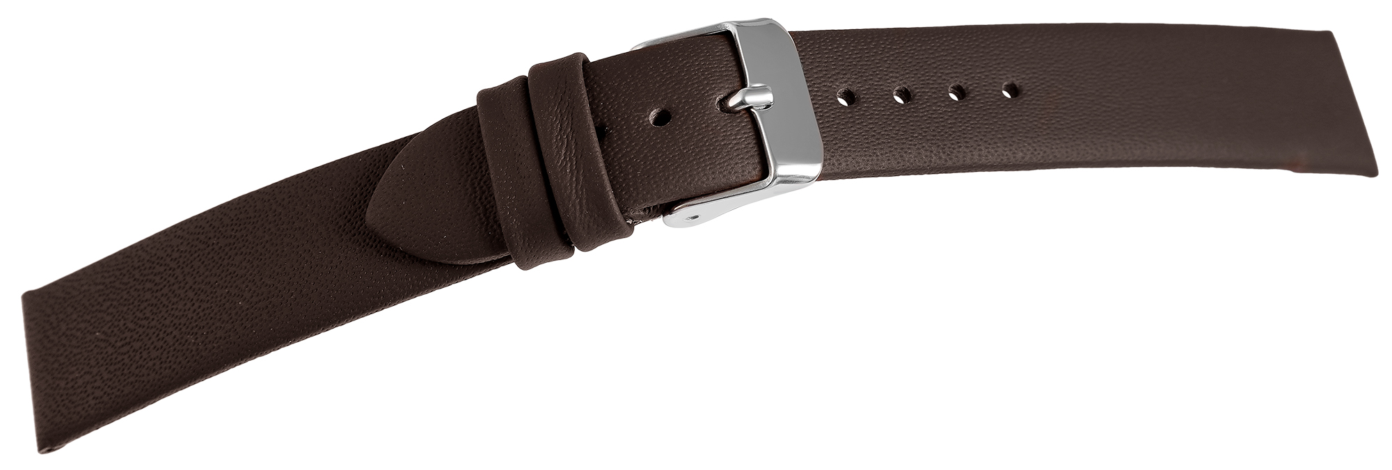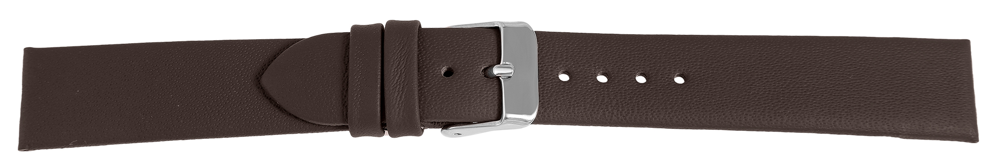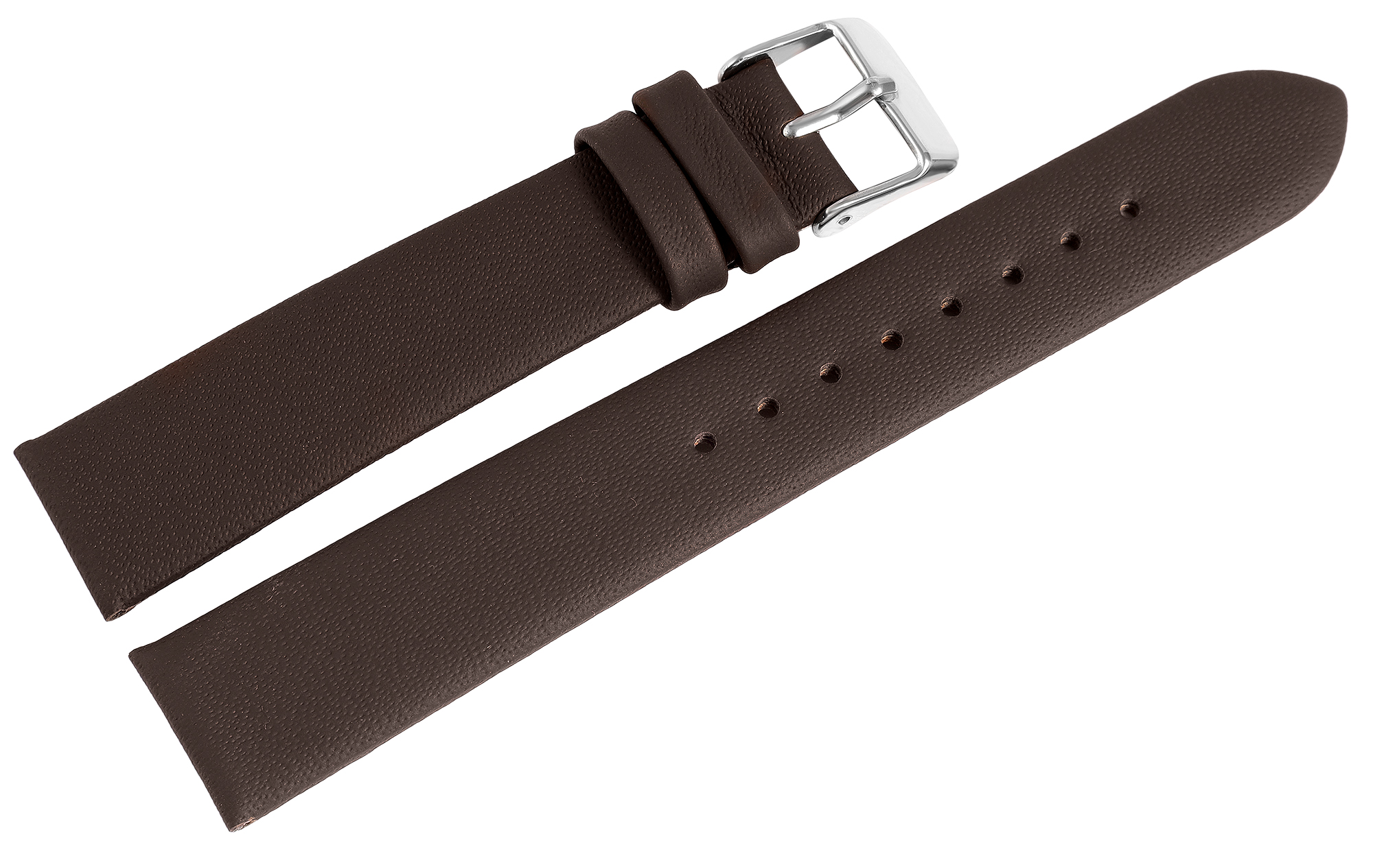 Das braune Uhrenarmband wurde aus Echtleder gefertigt und es ist in den Anstoßbreiten 12 mm, 14 mm, 16 mm, 18 mm, 20 mm und 22 mm erhältlich. Der Schließenanstoß ist 2 mm schmaler als die Anstoßbreite, da das Band dort schmaler zuläuft. Lediglich bei der Breite von 14 mm ist Schließenanstoß und Anstoßbreite gleich breit. Die Gesamtlänge des Bandes beträgt 20 cm und die Materialstärke beträgt 2,5 mm. Das Ersatzarmband lässt sich mit einer silberfarbenen, hochglanzpolierten Dornschließe öffnen und schließen. Das glänzende Finish in Kombination mit dem glatten Lederband unterstreicht das schöne Design des Uhrenarmbandes und sorgt für ein schnelles und leichthändiges An- und Ablegen.