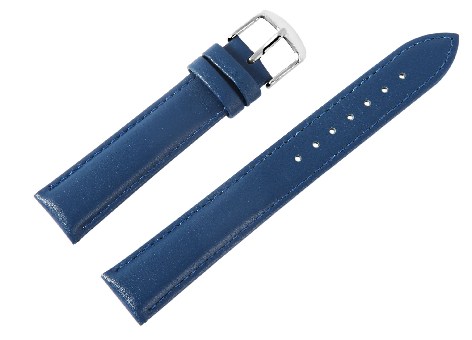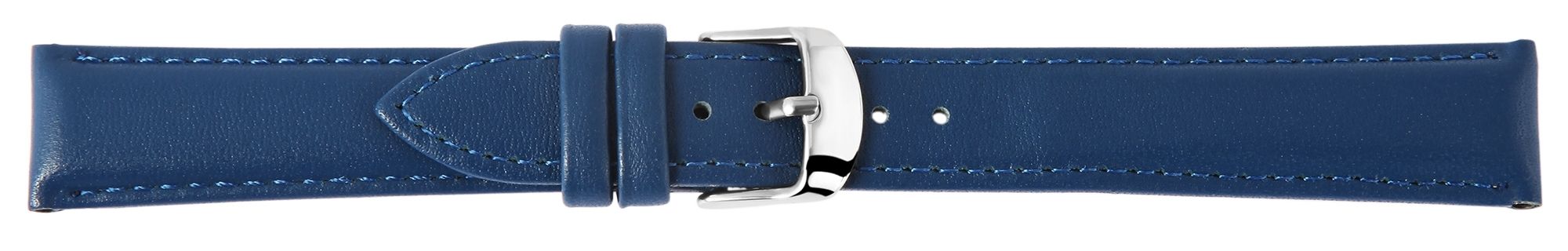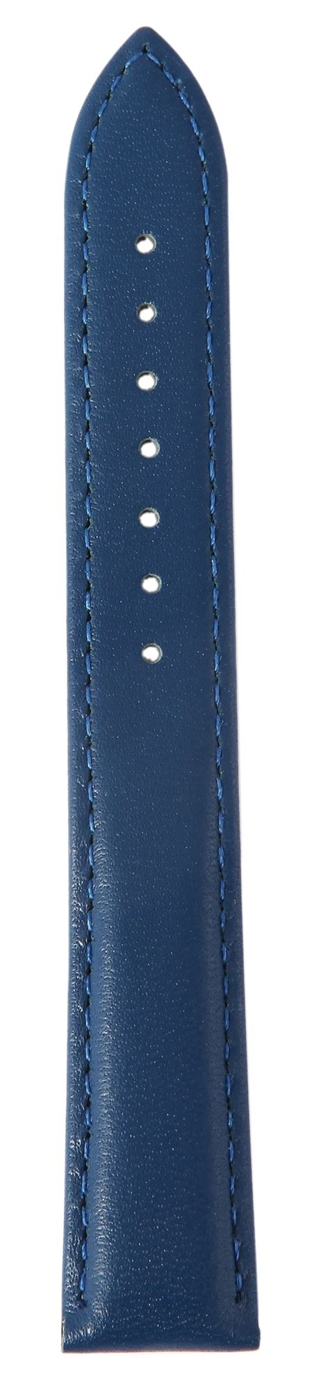 Das dunkelblaue Uhrenarmband aus Echtleder hat eine Anstoßbreite von 16 mm. Das Lederarmband ist leicht gepolstert, sodass es ca 5 mm hoch ist. Es hat eine glatte Oberfläche und ist außen mit einer blauen Naht vernäht. Die Gesamtlänge des Bandes beträgt 21,5 cm. An dem Band ist eine silberfarbene Dornschließe angebracht, dessen Anstoßbreite 14 mm beträgt.