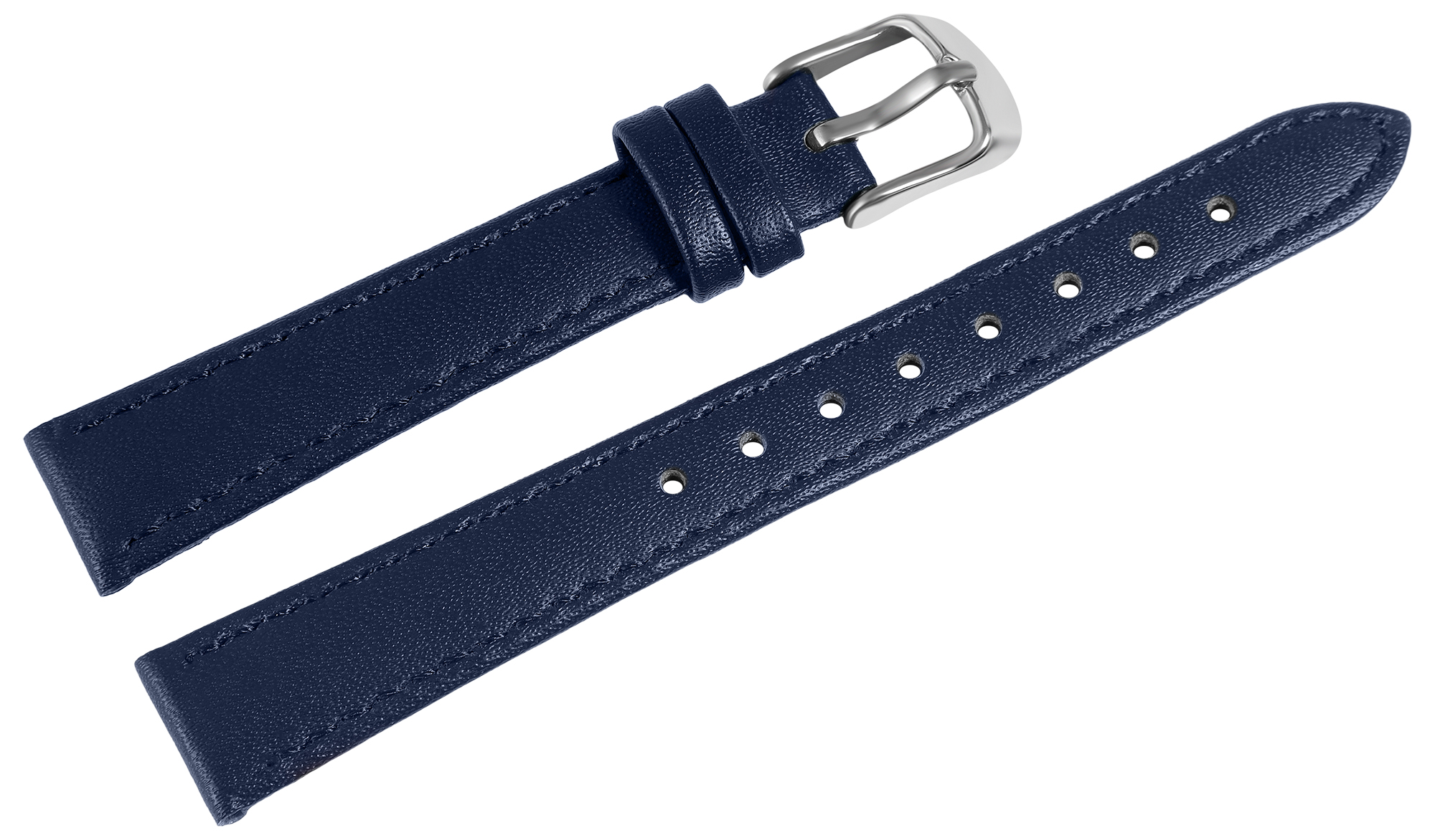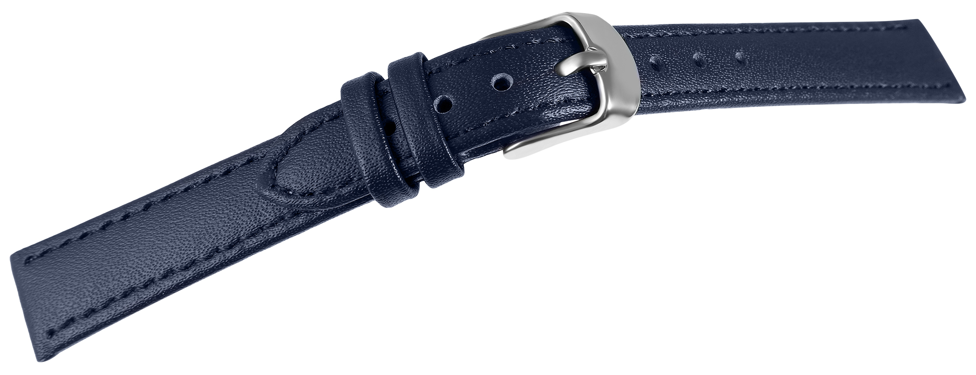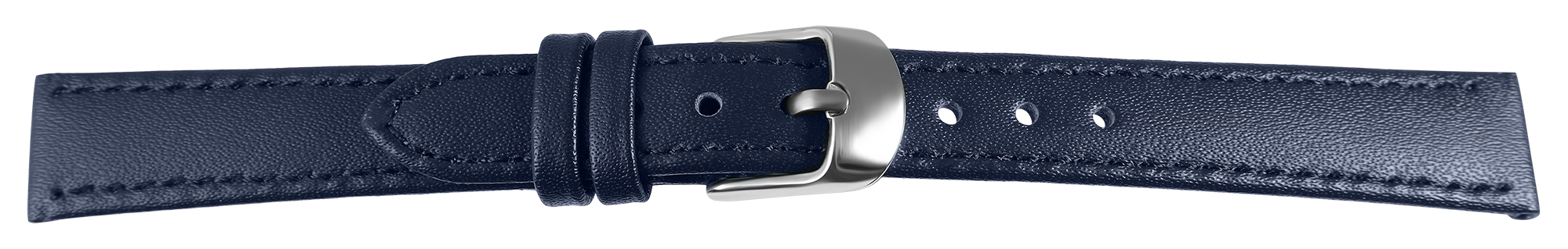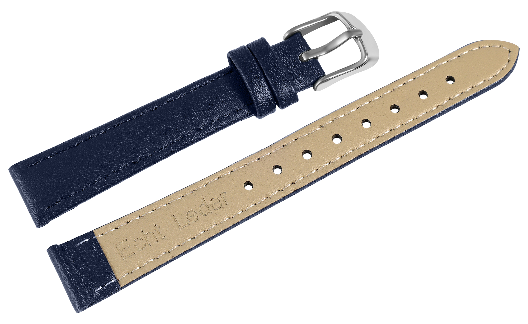 Das dunkelblaue Uhrenarmband aus Echtleder hat eine Anstoßbreite von 16 mm. Es hat eine glatte Oberfläche und ist mit einer feinen blauen Naht abgesetzt. Die Materialstärke beträgt 3 mm. Das Band hat eine Gesamtlänge von 21,5 cm. Die Gesamtlänge ist abhängig von der Anstoßbreite. Der Schließenanstoß ist 2 mm schmaler als die Anstoßbreite, da das Band schal zuläuft. Es lässt sich mit einer silberfarbenen Dornschließe öffnen und schließen.