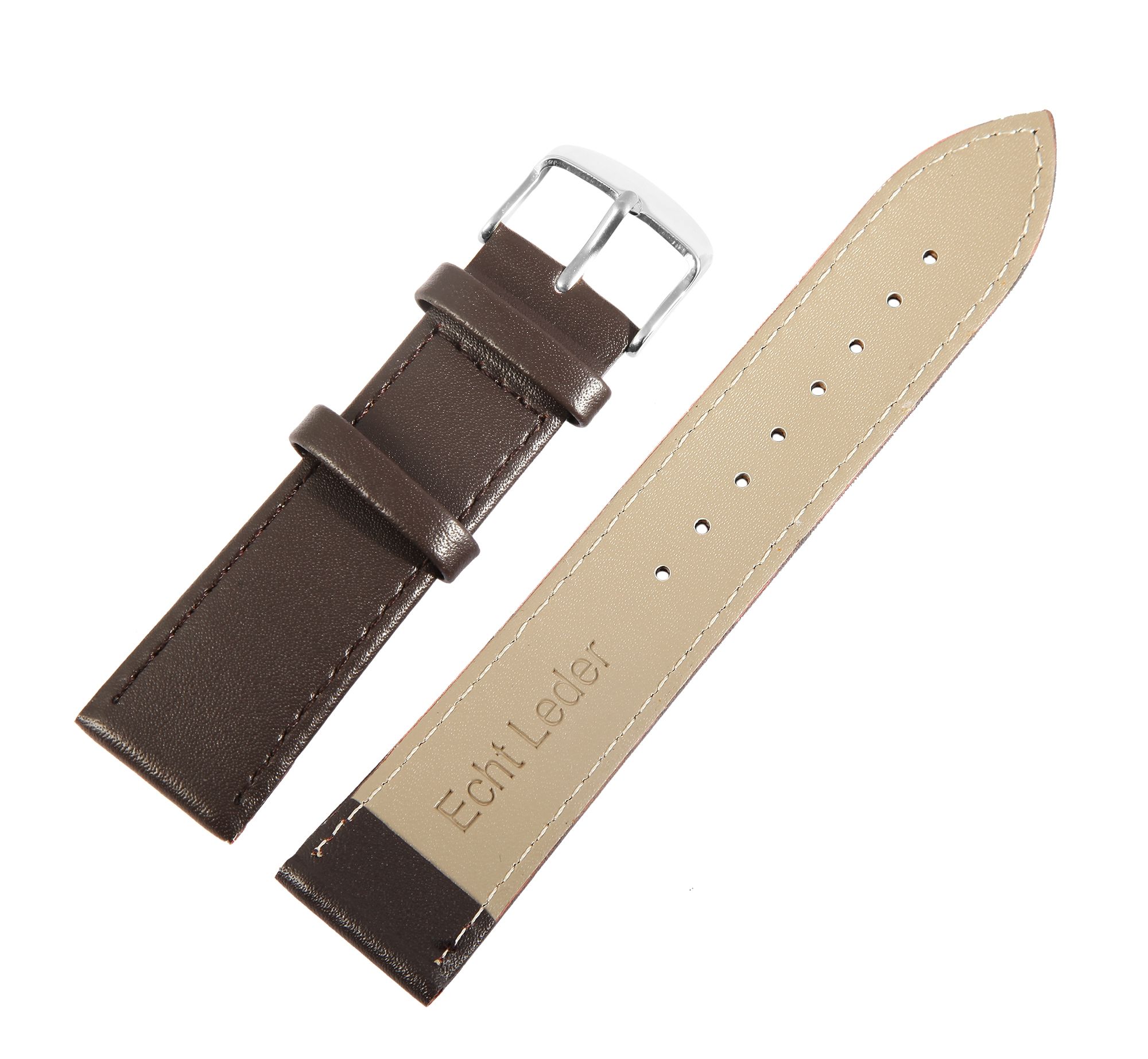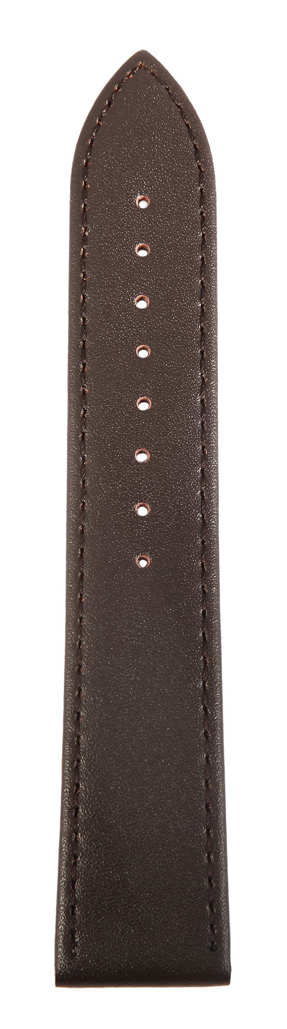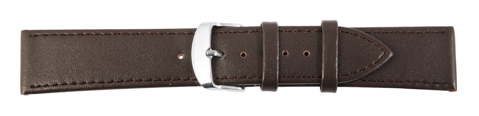 Das braune Uhrenarmband aus Echtleder hat eine Anstoßbreite von 24 mm. Es hat eine glatte Oberfläche und ist mit einer feinen braunen Naht abgesetzt. Die Materialstärke beträgt 3 mm. Das Ersatzarmband hat eine Gesamtlänge von 21,5 cm. Der Schließenanstoß ist 2 mm schmaler als die Anstoßbreite, da das Band schmal zuläuft. Es lässt sich mit einer silberfarbenen Dornschließe öffnen und schließen.
