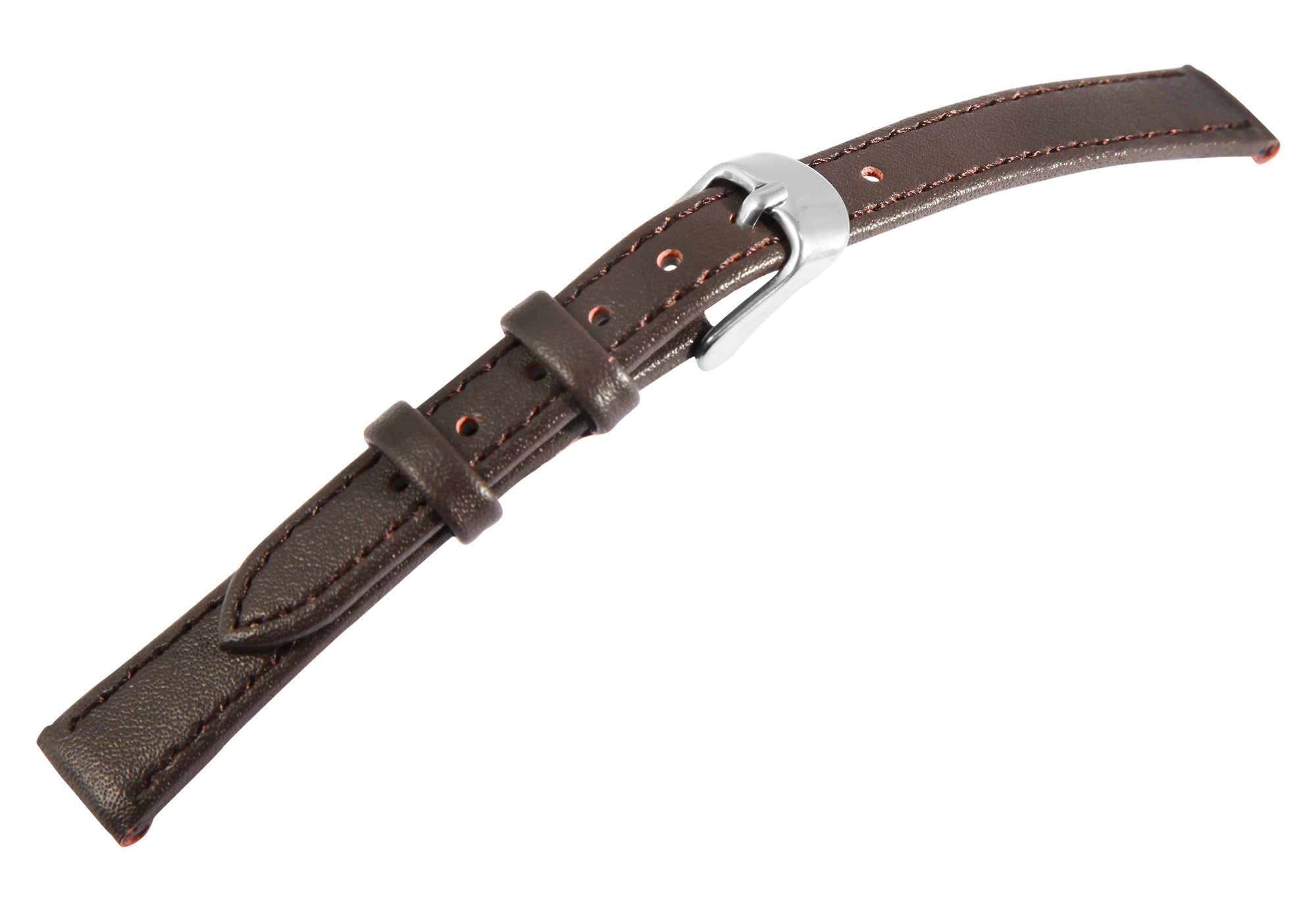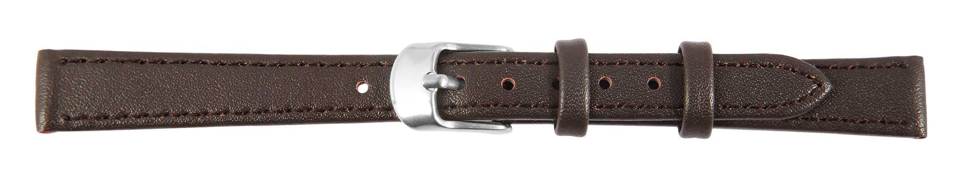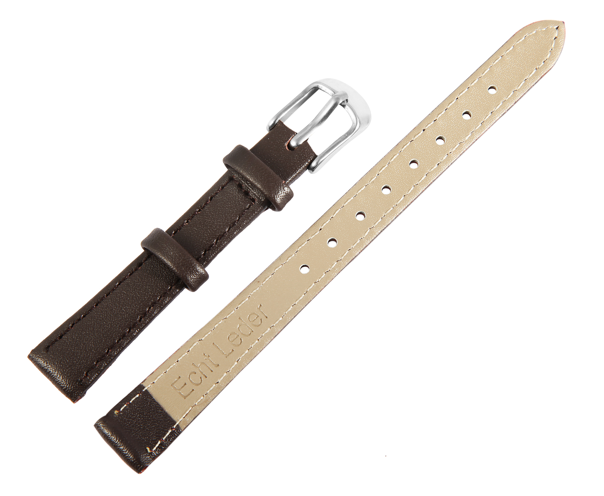 Das braune Uhrenarmband aus Echtleder hat eine Anstoßbreite von 10 mm. Es hat eine glatte Oberfläche und ist mit einer feinen braunen Naht abgesetzt. Die Materialstärke beträgt 3 mm. Das Ersatzarmband hat eine Gesamtlänge von 19 cm. Der Schließenanstoß ist 2 mm schmaler als die Anstoßbreite, da das Band schmal zuläuft. Es lässt sich mit einer silberfarbenen Dornschließe öffnen und schließen.