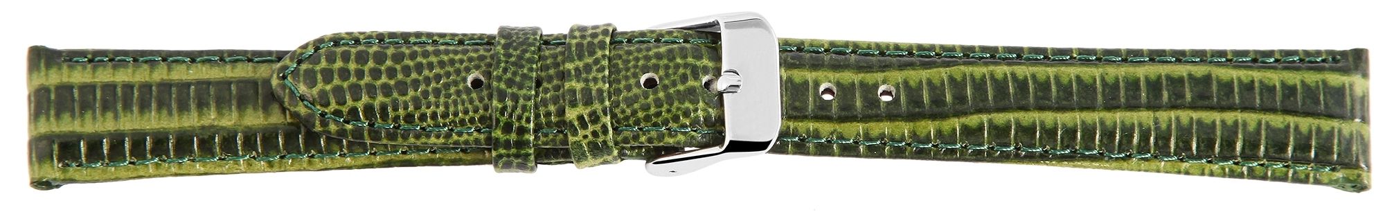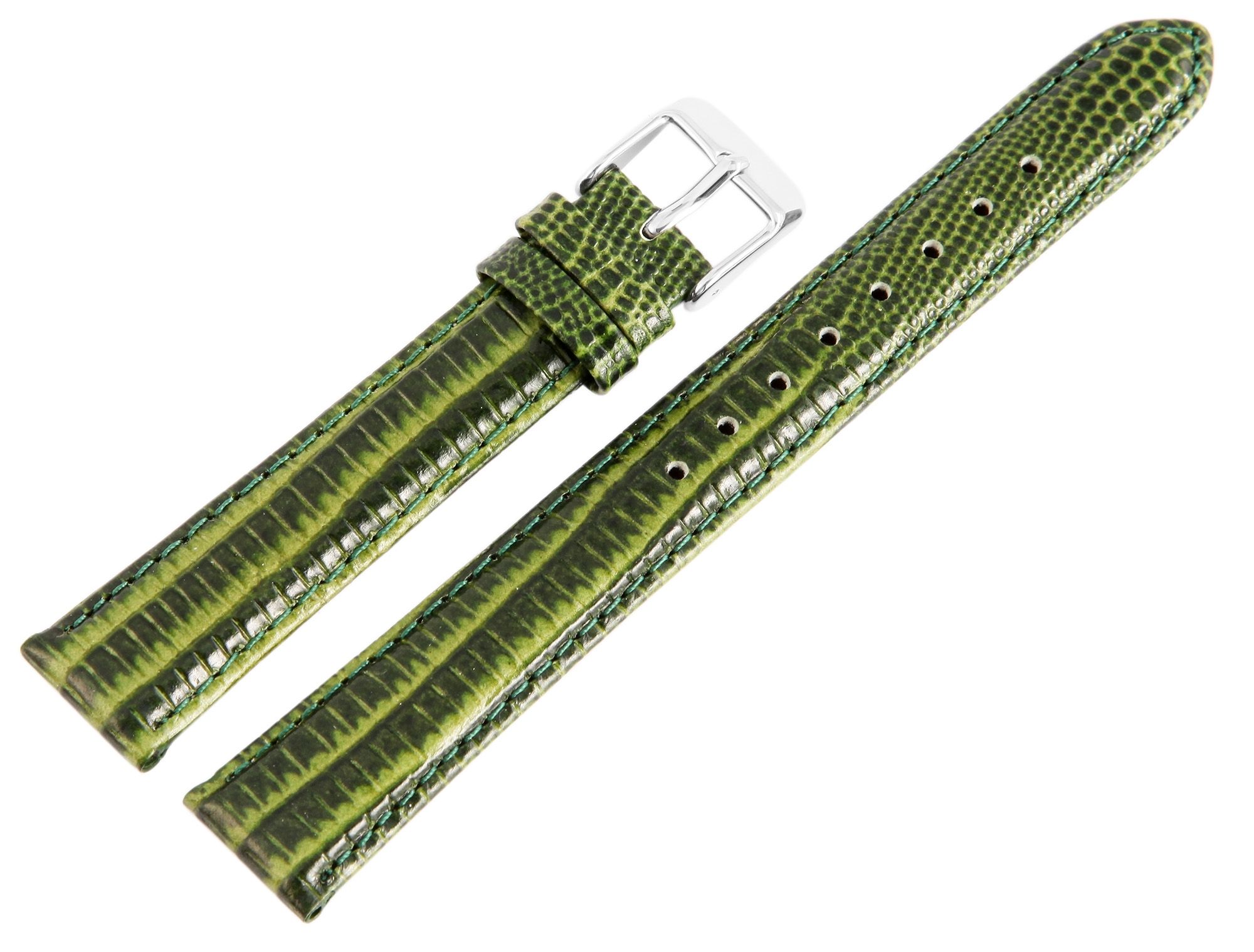 Echtleder Ersatzarmband in der Farbe Grün. Das Gesamte Armband ist gepolstert. Es wurde aus Rindsleder gefertigt und im Eidechsenlederdesign geprägt. Das Armband besitzt eiene Stegbrete von 16 mm eine silberfarbige Dornschließe sowie zwei Armbandschlaufen. Der Lochteil läuft am Ende spitz zu.