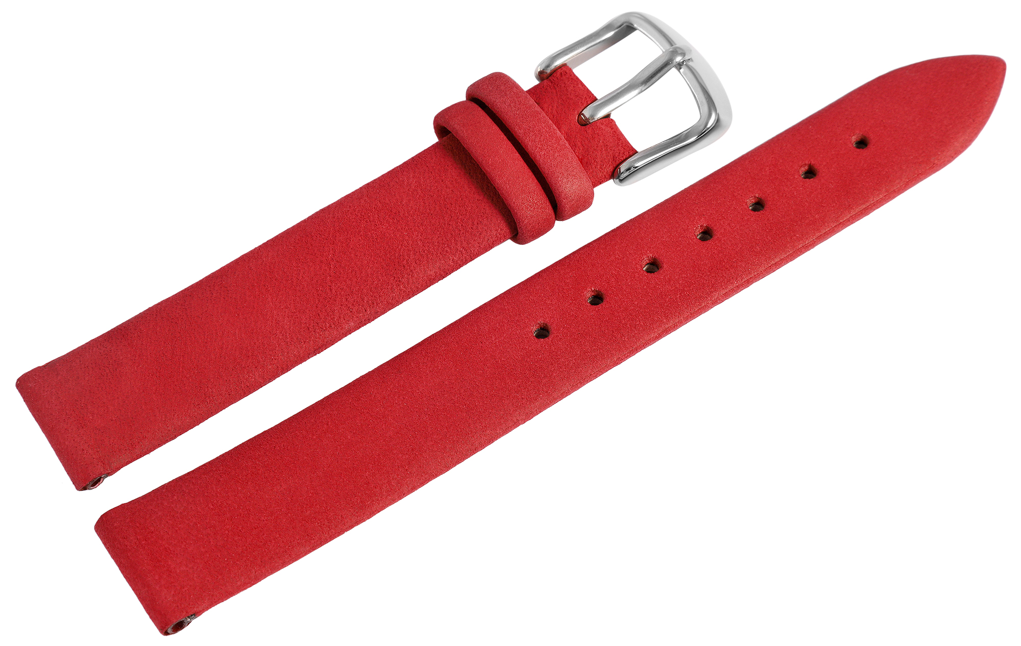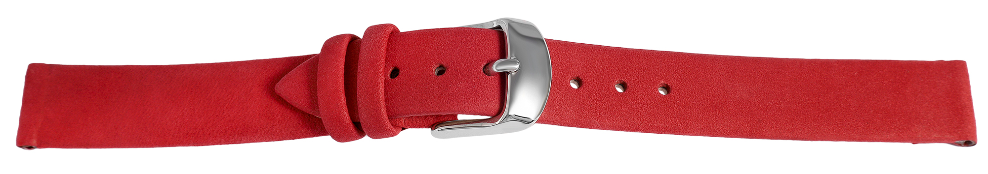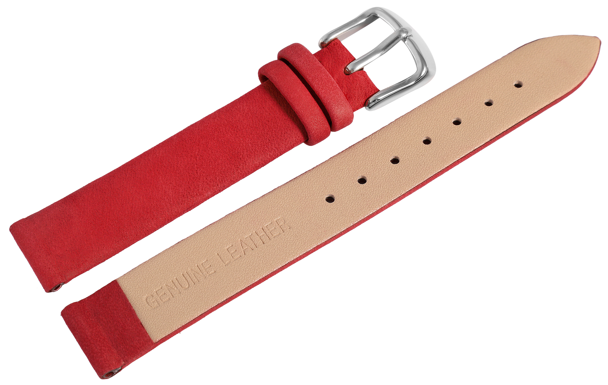 Das dunkelrote Uhrenarmband aus Echtleder hat die Anstoßbreite 14 mm. Es hat eine leicht angeraute Oberfläche und ist leicht gepolstert, sodass es ca 3 mm hoch ist. Die Gesamtlänge des Bandes beträgt 19,5 cm. Die Länge setzt sich zusammen aus dem 11 cm langen Lochteil und dem 8,5 cm langen Schließenteil. Das Ersatzarmband lässt sich mit einer silberfarbenen Dornschließe öffnen und schließen.
