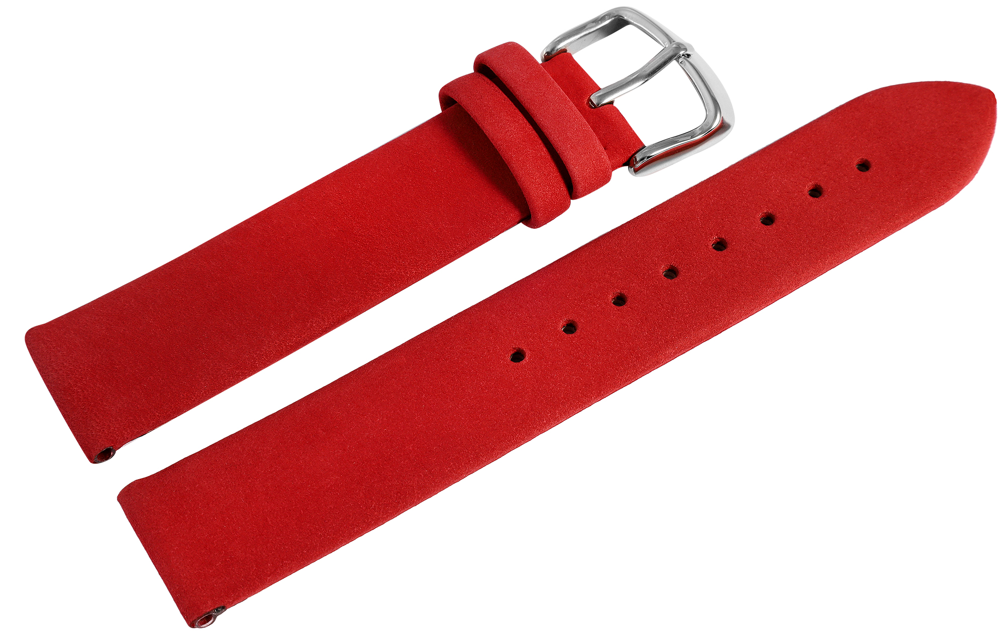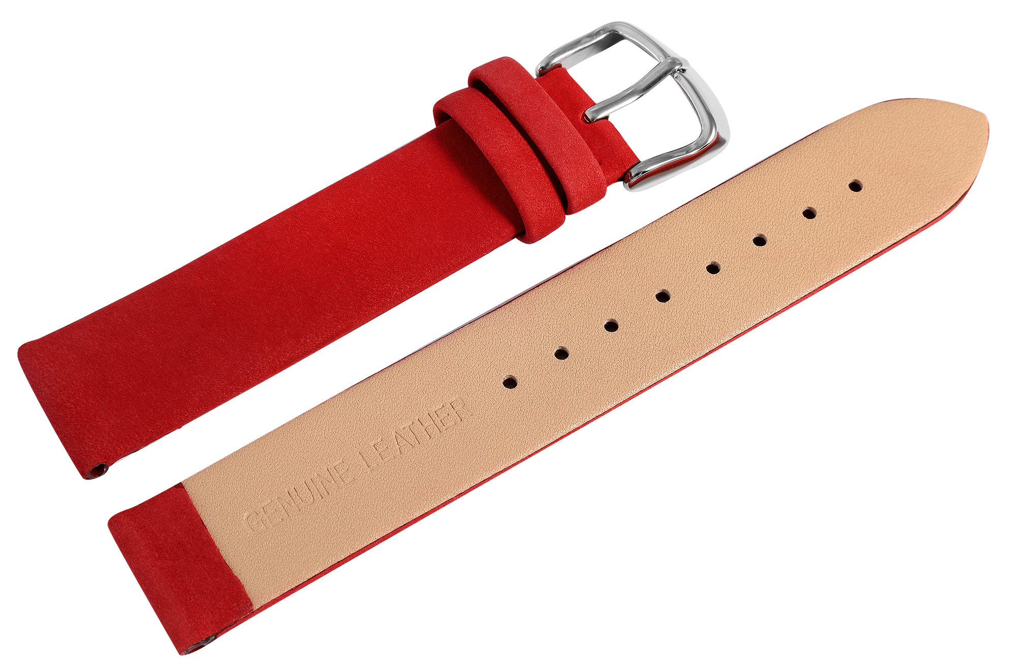 Das dunkelrote Uhrenarmband aus Echtleder hat die Anstoßbreite 18 mm. Es hat eine leicht angeraute Oberfläche und ist leicht gepolstert, sodass es ca 3 mm hoch ist. Die Gesamtlänge des Bandes beträgt 20,5 cm. Die Länge setzt sich zusammen aus dem 9 cm langen Schließenteil und dem 11,5 cm langen Lochteil. Das Ersatzarmband lässt sich mit einer silberfarbenen Dornschließe öffnen und schließen.