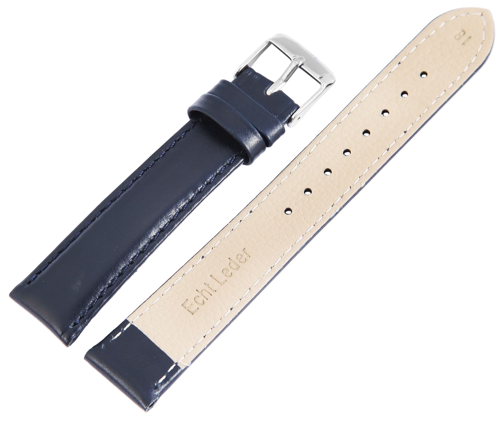 Das dunkelblaue Uhrenarmband, mit ebenfalls dunkelblauer Naht, wurde aus Echtleder gefertigt und es hat eine Anstoßbreite von 18 mm. Der Schließenanstoß ist 2 mm schmaler als die Anstoßbreite, da das Armband dort schmaler zu läuft. Die Gesamtlänge des Bandes beträgt 22 cm und die Materialstärke beträgt 5 mm. Das Ersatzarmband lässt sich mit einer silberfarbenen, hochglanzpolierten Dornschließe öffnen und schließen. Das glänzende Finish in Kombination mit dem glatten Lederband unterstreicht das schöne Design des Uhrenarmbandes und sorgt für ein schnelles und leichthändiges An- und Ablegen.