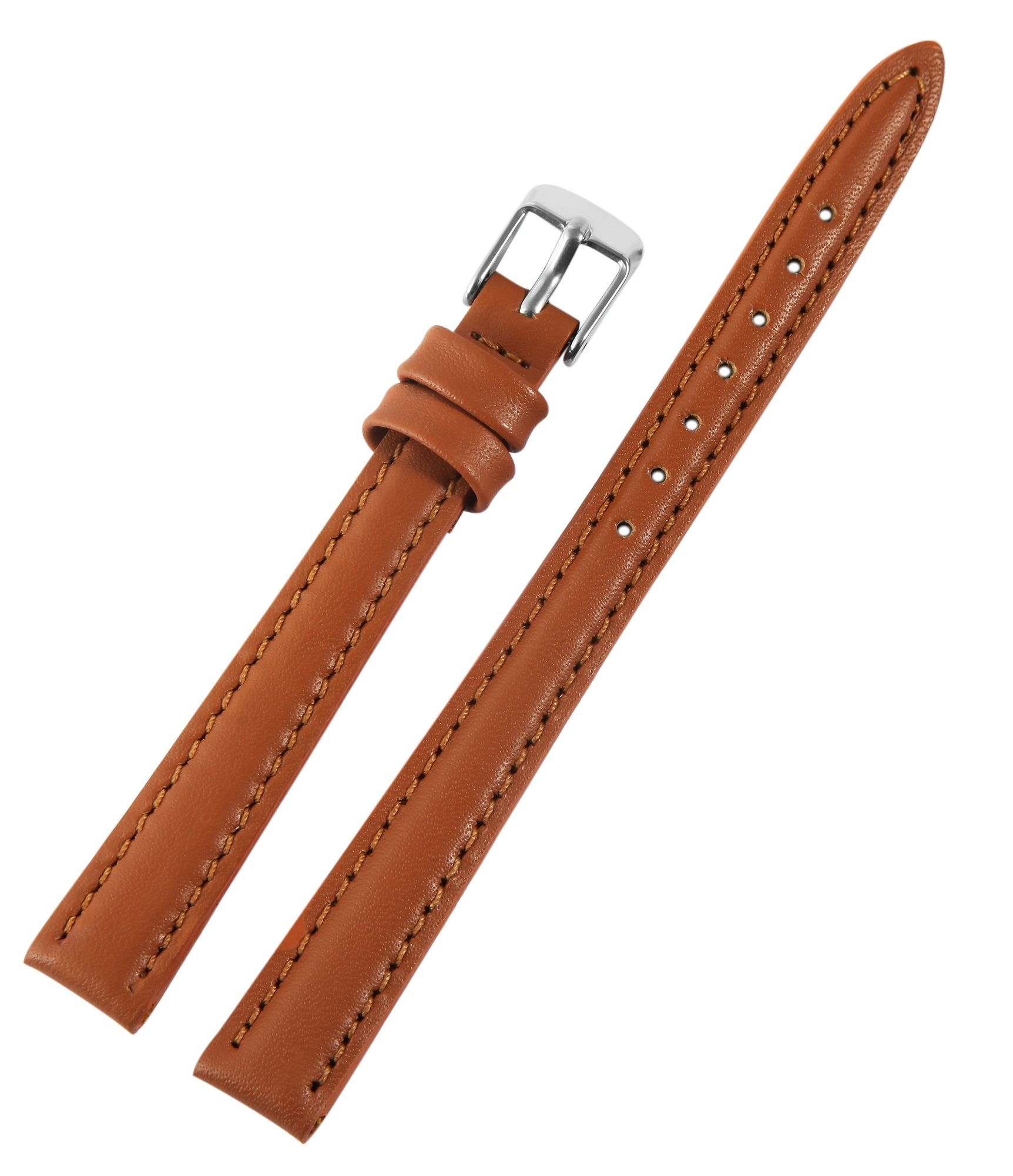 Das braune Uhrenarmband aus Echtleder hat eine Anstoßbreite von 14 mm. Der Schließenanstoß ist 2 mm schmaler als die Anstoßbreite, da das Band schmal zuläuft. Das Band hat eine glatte Oberfläche, ist leicht gepolstert und ist mit einer feinen braunen Naht abgesetzt. Die Materialstärke beträgt 3,5 mm. Das Ersatzarmband hat eine Gesamtlänge von 21 cm die sich aus dem 12 cm langen Lochteil und dem 9 cm langen Schließenteil zusammensetzt. Es lässt sich mit einer silberfarbenen, hochglanzpolierten Dornschließe öffnen und schließen. Das glänzende Finish in Kombination mit dem glatten Lederband unterstreicht das schöne Design des Uhrenarmbandes und sorgt für ein schnelles und leichthändiges An- und Ablegen. Zudem können Sie Ihrer Uhr mit diesem Band im Handumdrehen einen neuen Look verpassen.