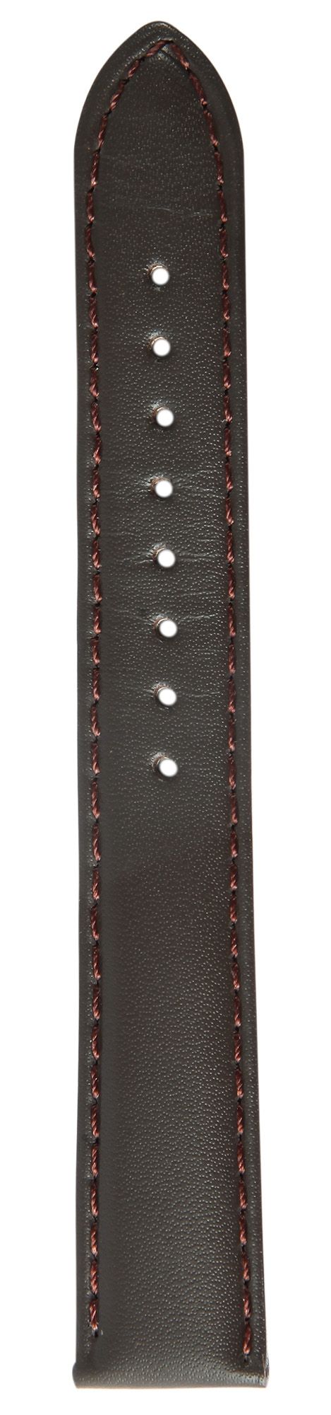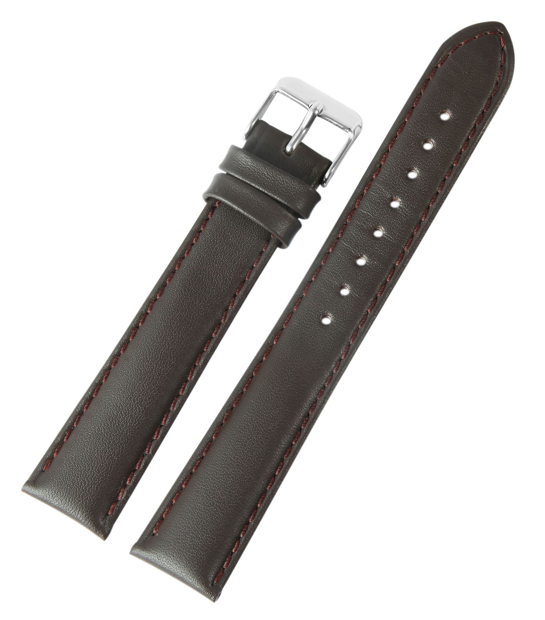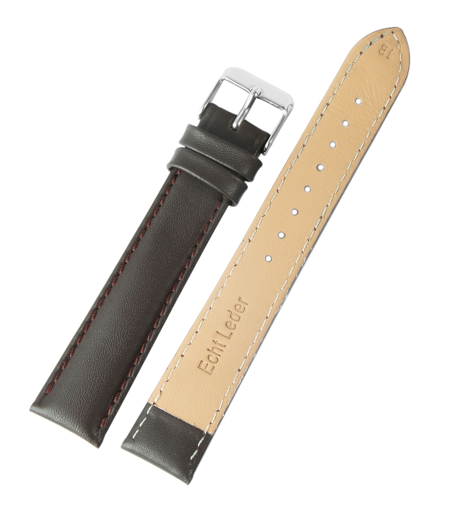 Das dunkelbraune Uhrenarmband aus Echtleder ist in einer Anstoßbreite von 24 mm gefertigt. Es hat eine glatte Oberfläche, ist leicht gepolstert und ist mit einer feinen dunkelbraunen Naht abgesetzt. Die Materialstärke beträgt 3,5 mm. Das Ersatzarmband hat eine Gesamtlänge von 22 cm, die sich aus dem 12 cm langen Lochteil und dem 10 cm langen Schließenteil zusammensetzt.. Der Schließenanstoß ist 2 mm schmaler als die Anstoßbreite, da das Band schmal zuläuft. Das Ersatzarmband lässt sich mit einer silberfarbenen, hochglanzpolierten Dornschließe öffnen und schließen. Das glänzende Finish in Kombination mit dem glatten Lederband unterstreicht das schöne Design des Uhrenarmbandes und sorgt für ein schnelles und leichthändiges An- und Ablegen. Zudem können Sie Ihrer Uhr mit diesem Band im Handumdrehen einen neuen Look verpassen.