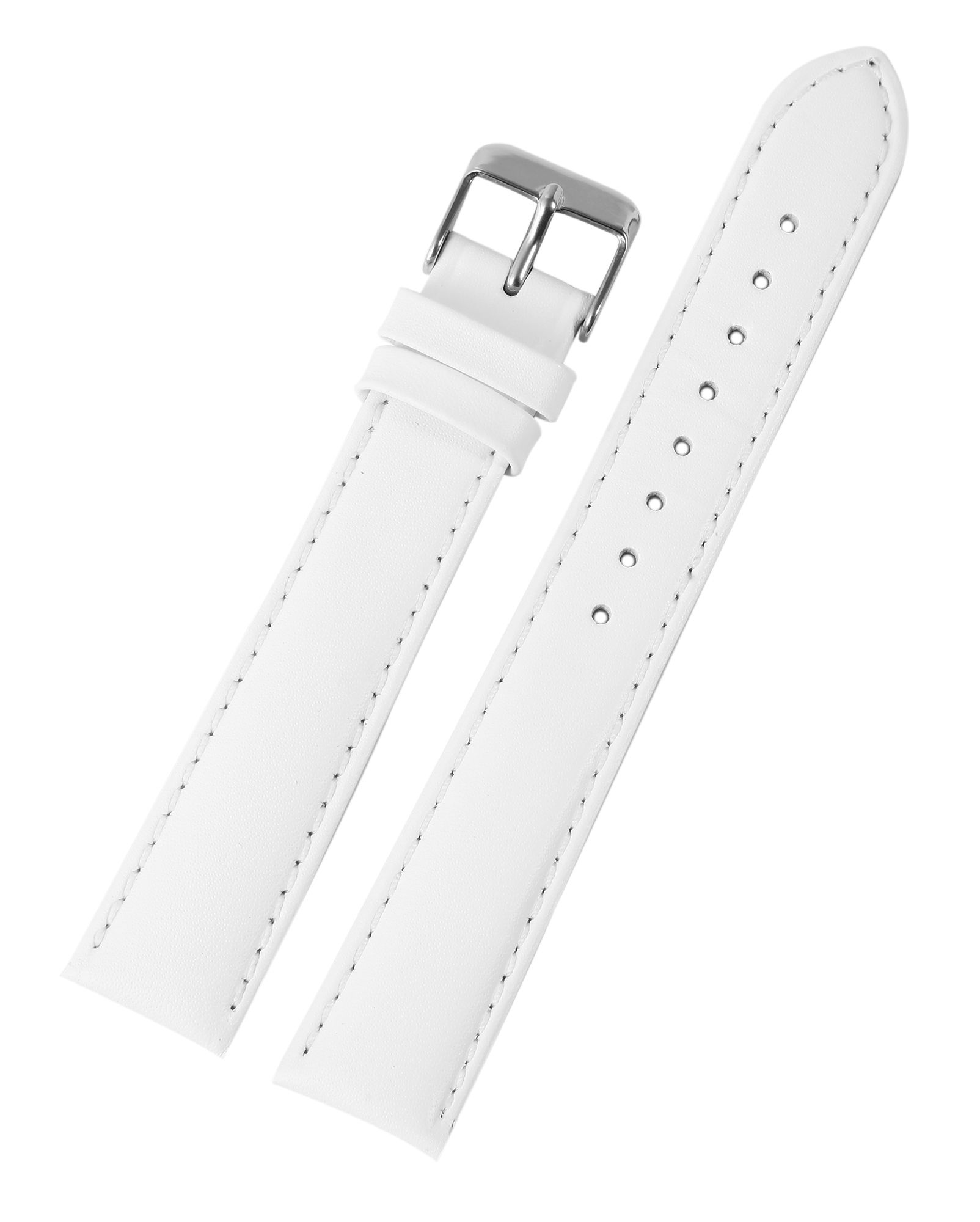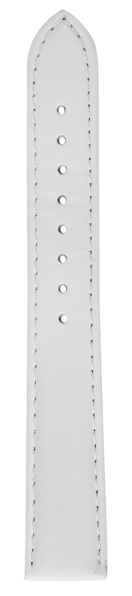 Das weiße Uhrenarmband aus Echtleder ist in einer Anstoßbreite von 2 mm gefertigt. Es hat eine glatte Oberfläche, ist leicht gepolstert und ist mit einer feinen weißen Naht abgesetzt. Die Materialstärke beträgt 3,5 mm. Das Ersatzarmband hat eine Gesamtlänge von 22 cm, die sich zusammensetzt aus dem 12,5 cm langen Lochteil und dem 9,5 cm langen Schließenteil. Der Schließenanstoß ist 2 mm schmaler als die Anstoßbreite, da das Band schmal zuläuft. Das Ersatzarmband lässt sich mit einer silberfarbenen, hochglanzpolierten Dornschließe öffnen und schließen. Das glänzende Finish in Kombination mit dem glatten Lederband unterstreicht das schöne Design des Uhrenarmbandes und sorgt für ein schnelles und leichthändiges An- und Ablegen. Zudem können Sie Ihrer Uhr mit diesem Band im Handumdrehen einen neuen Look verpassen.