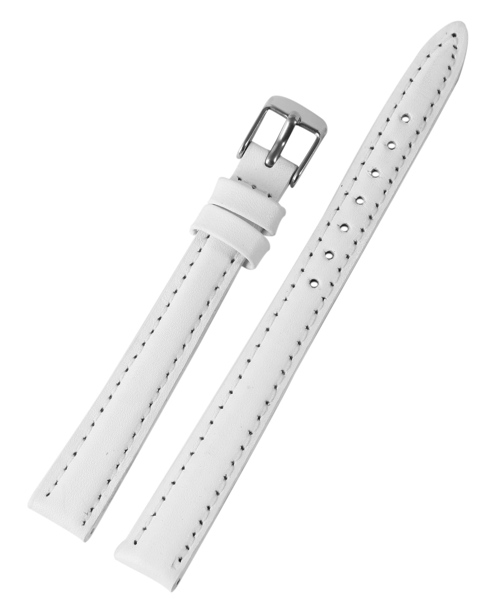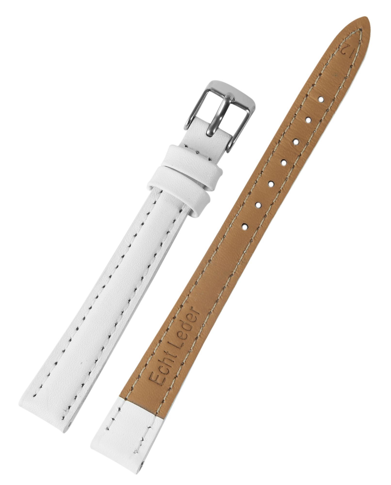 Das weiße Uhrenarmband aus Echtleder ist in einer Anstoßbreite von 10 mm gefertigt. Es hat eine glatte Oberfläche, ist leicht gepolstert und ist mit einer feinen weißen Naht abgesetzt. Die Materialstärke beträgt 3,5 mm. Das Ersatzarmband hat eine Gesamtlänge von 20,5 cm, die sich zusammensetzt aus dem 11,5 cm langen Lochteil und dem 9 cm langen Schließenteil. Der Schließenanstoß ist 2 mm schmaler als die Anstoßbreite, da das Band schmal zuläuft. Das Ersatzarmband lässt sich mit einer silberfarbenen, hochglanzpolierten Dornschließe öffnen und schließen. Das glänzende Finish in Kombination mit dem glatten Lederband unterstreicht das schöne Design des Uhrenarmbandes und sorgt für ein schnelles und leichthändiges An- und Ablegen. Zudem können Sie Ihrer Uhr mit diesem Band im Handumdrehen einen neuen Look verpassen.