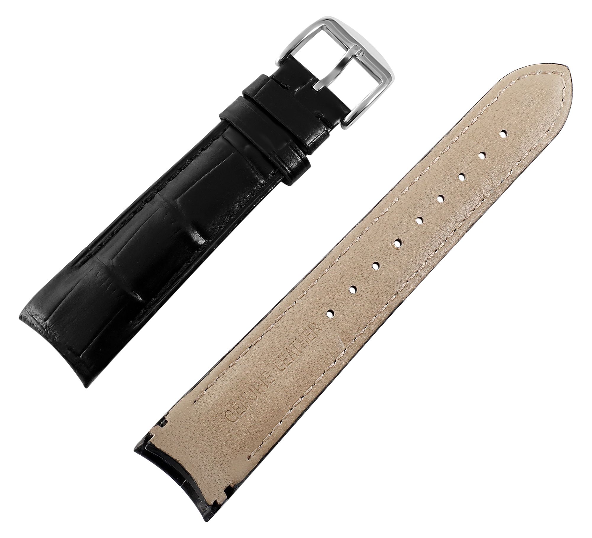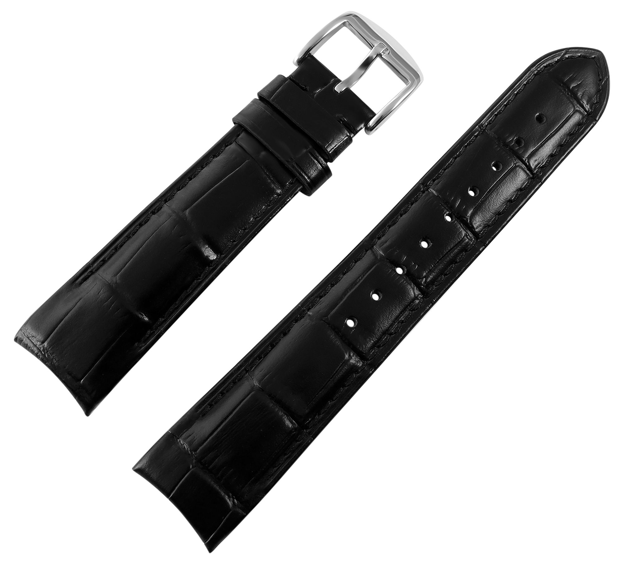 Schwarzes Uhrenarmband aus Echtleder mit silberfarbener Dornschließe - geprägt, gepolstert und genäht! Das ideale Ersatzarmband für Uhrenliebhaber, die Wert auf Qualität und zeitlose Optik legen. Das Armband besteht aus hochwertigem Leder in glänzendem Schwarz mit einer edlen Prägung. Es besticht durch seine hochwertige Verarbeitung und den präzisen Nähten. Die Polsterung sorgt für außergewöhnlichen Tragekomfort, ein Merkmal, dass Ihre Kunden zu schätzen wissen werden!