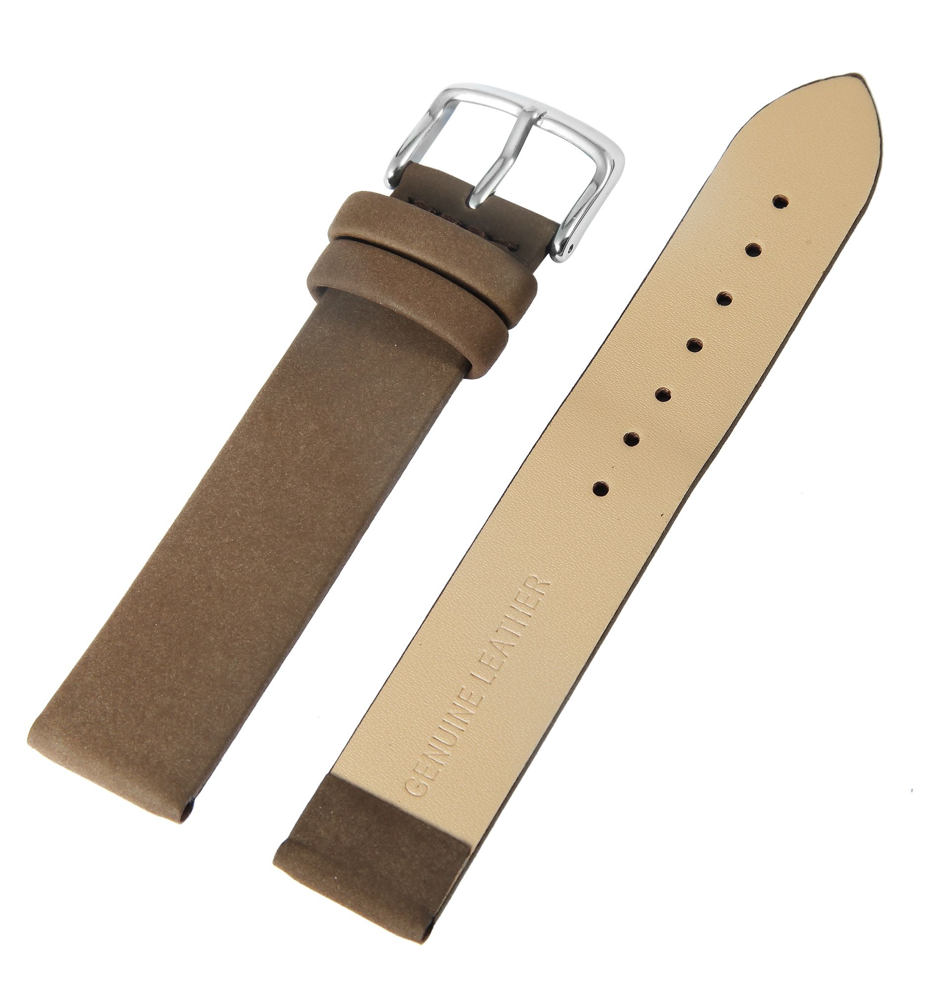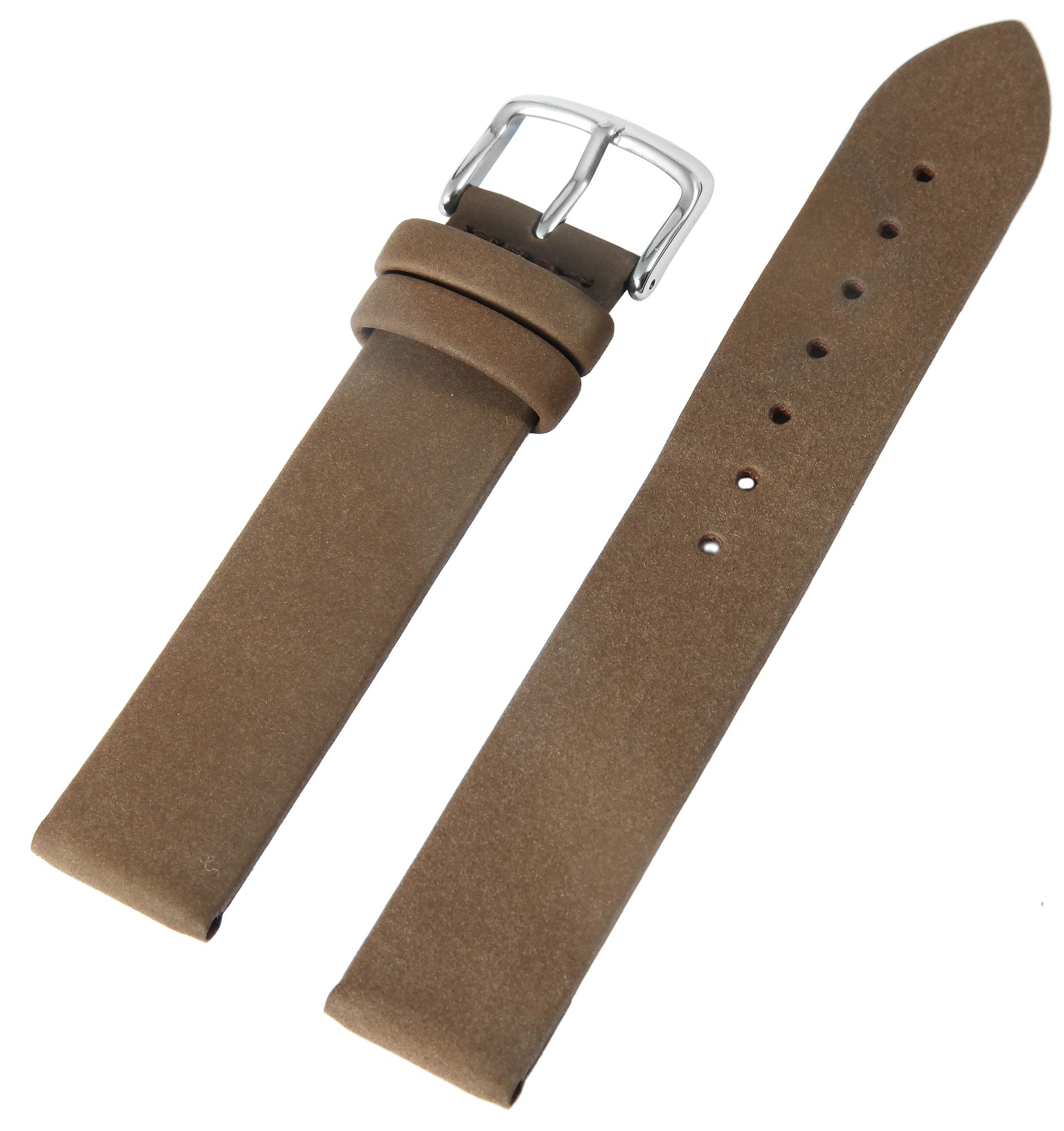 Das braune Uhrenarmband wurde aus Echtleder gefertigt. Die Oberflächenbeschaffenheit ist leicht angeraut und es hat eine Anstoßbreite von 16 mm. Zudem ist das Uhrenarmband 2 mm stark, die Gesamtlänge des Bandes beträgt 20 cm. Die Länge setzt sich zusammen aus dem 11,5 cm langen Lochteil und dem 9 cm langen Schließenteil. Das Ersatzarmband lässt sich mit einer silberfarbenen Dornschließe öffnen und schließen.
