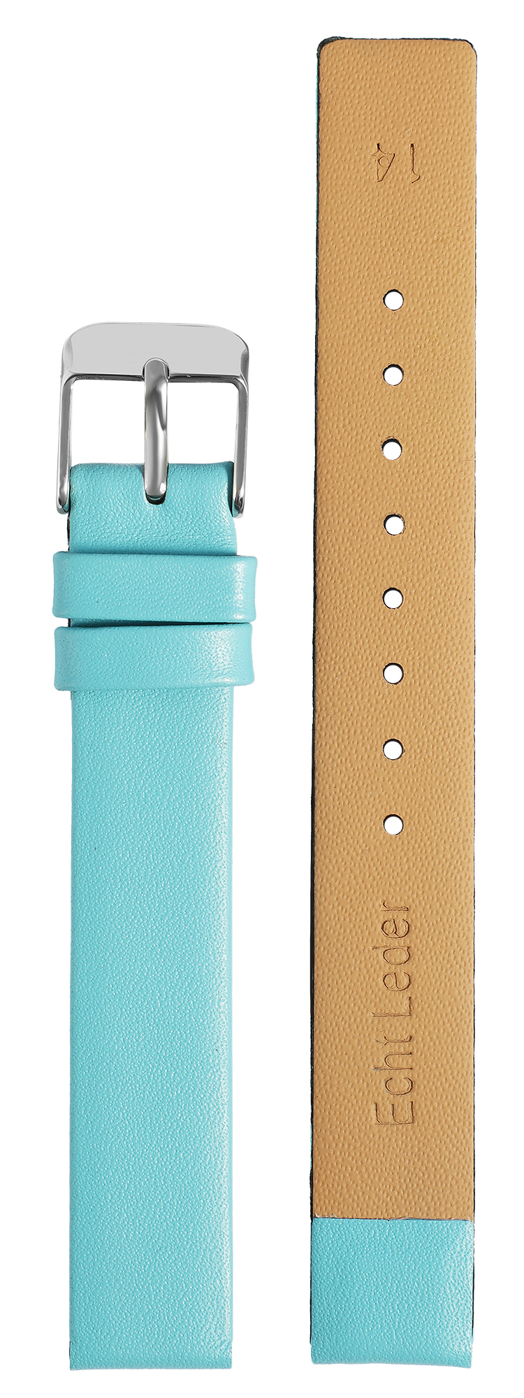 Das hellblaue Uhrenarmband wurde aus Echtleder gefertigt und es ist in den Anstoßbreiten 14 mm, 16 mm, 18 mm, 20 mm und 22 mm erhältlich. Die Gesamtlänge des Bandes beträgt zwischen 20,5 cm und 22 cm und die Materialstärke beträgt 3 mm. Die Länge ist abhängig von der Anstoßbreite. Das Ersatzarmband lässt sich mit einer silberfarbenen, hochglanzpolierten Dornschließe öffnen und schließen. Die glänzenden Elemente des Bandes unterstreichen das schöne Design und geben Ihrer Armbanduhr einen frischen Look.