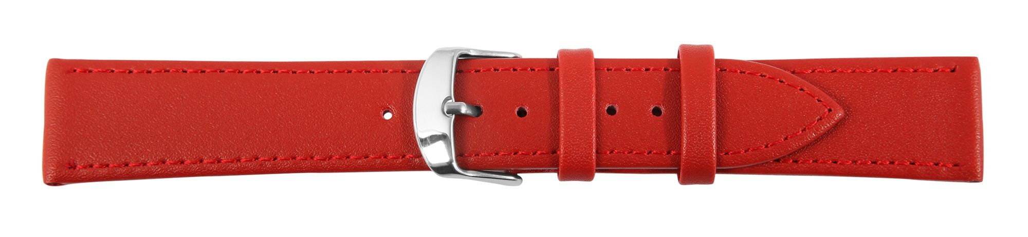 Das rote Uhrenarmband aus Echtleder hat eine Anstoßbreite von 20 mm. Es hat eine glatte Oberfläche und ist mit einer feinen roten Naht abgesetzt. Die Materialstärke beträgt 3 mm. Das Ersatzarmband hat eine Gesamtlänge von 21,5 cm. Der Schließenanstoß ist 2 mm schmaler als die Anstoßbreite, da das Band schmal zuläuft. Es lässt sich mit einer silberfarbenen Edelstahldornschließe öffnen und schließen.