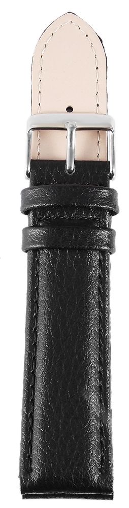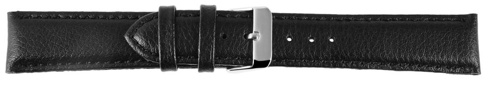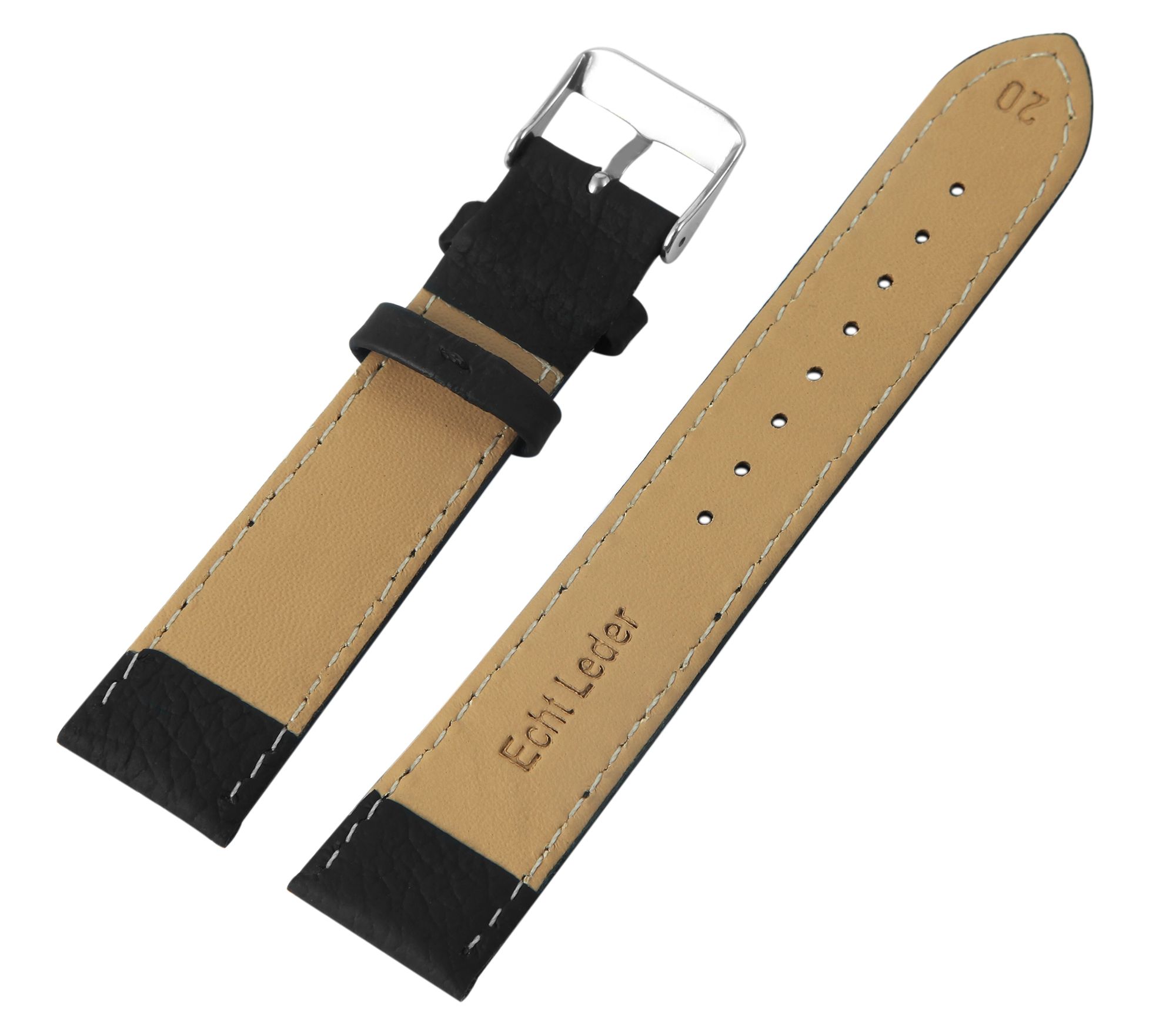 Das schwarze Uhrenarmband aus Echtleder ist in den Anstoßbreiten 12 mm, 14 mm, 16 mm, 18 mm, 20 mm, 22 mm und 24 mm erhältlich. Das Lederarmband ist leicht gepolstert, sodass es eine Materialstärke von ca. 4 mm hat. Es hat eine raue Oberfläche mit einer feinen Prägung und ist außen mit einer schwarzen Naht verziert. Die Gesamtlänge des Bandes orientiert sich an der jeweiligen Bandbreite und variiert zwischen ca. 19 - 21 cm. Der Schließenanstoß ist 2 mm schmaler als die Anstoßbreite, da das Band schmal zuläuft. Das Uhrenersatzarmband lässt sich über eine silberfarbene Edelstahlfaltschließe öffnen und schließen.
