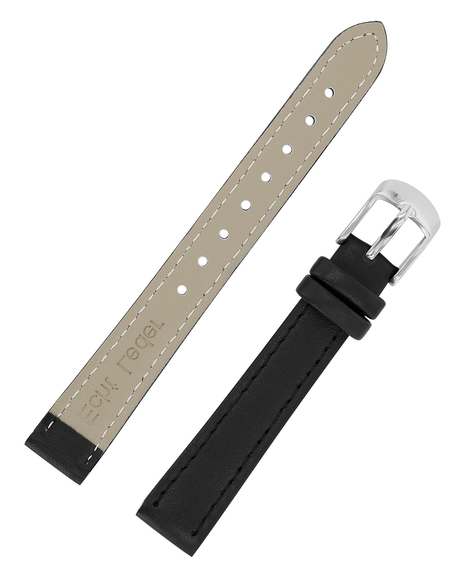 Das schwarze Uhrenarmband aus Echtleder hat eine Anstoßbreite von 14 mm. Es hat eine glatte Oberfläche und ist mit einer feinen schwarzen Naht abgesetzt. Die Materialstärke beträgt 3 mm. Das Ersatzarmband hat eine Gesamtlänge von 19,5 cm. Der Schließenanstoß ist 2 mm schmaler als die Anstoßbreite, da das Band schmal zuläuft. Es lässt sich mit einer silberfarbenen Dornschließe öffnen und schließen.
