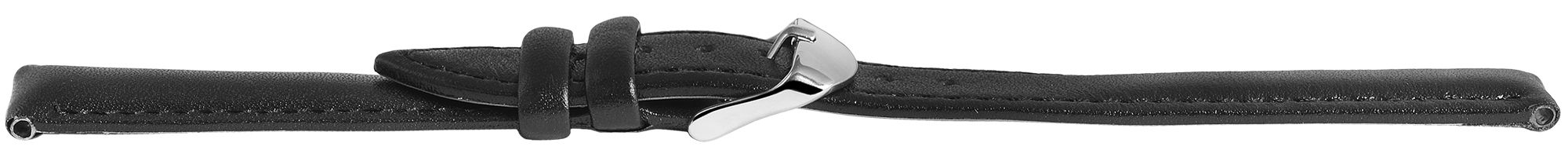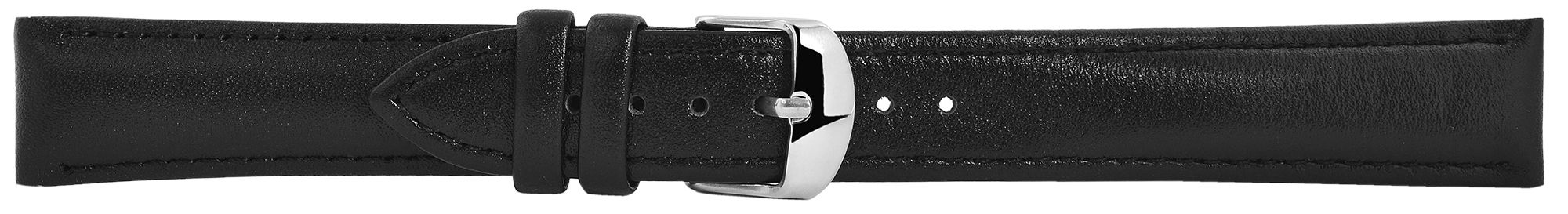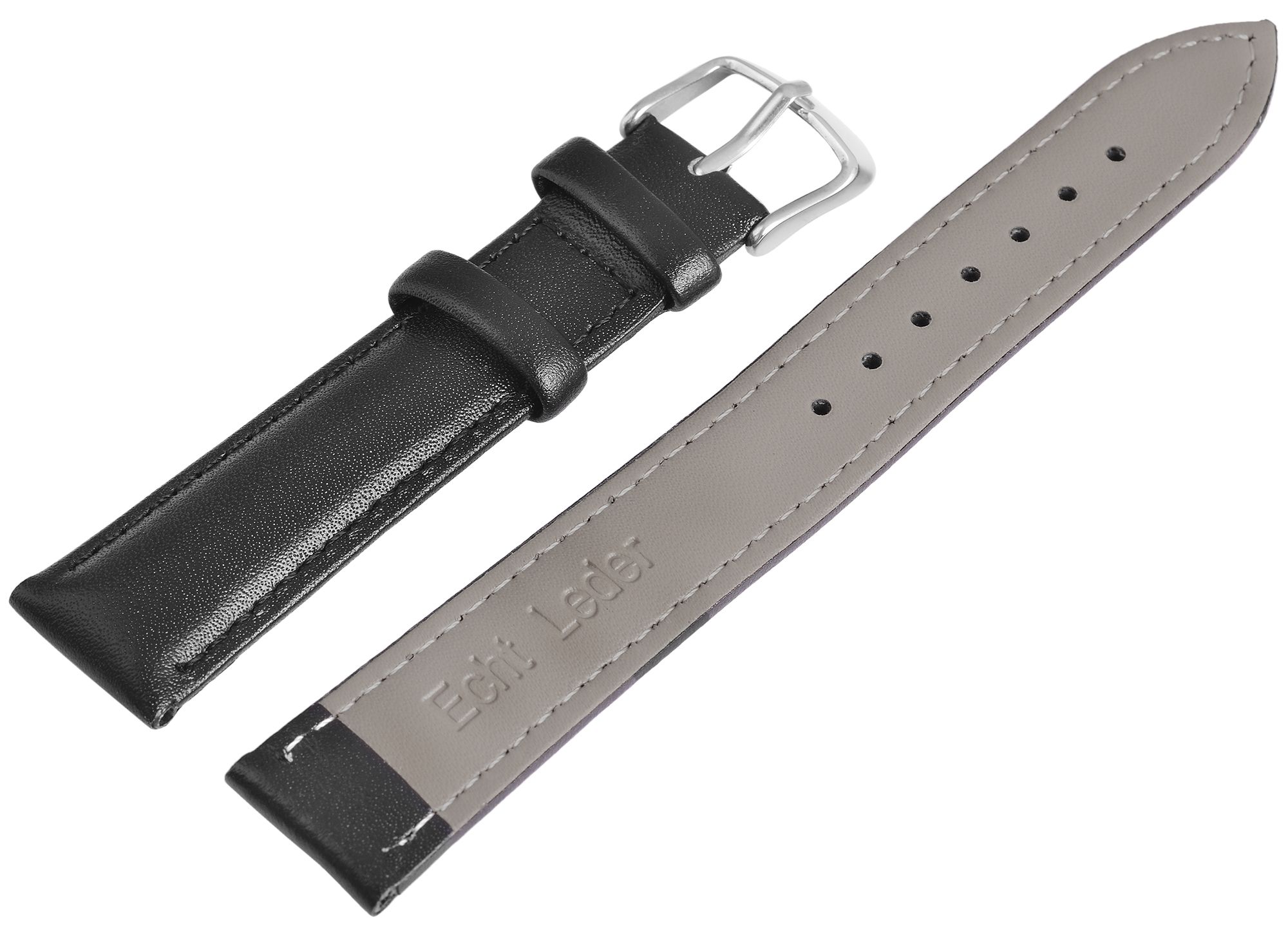 Das schwarze Uhrenarmband ist aus Echtleder gefertigt und in den Anstoßbreiten 12 mm, 14 mm, 16 mm, 18 mm, 20 mm, 22 mm, 24 mm und 26 mm erhältlich. Es hat eine glatte Oberfläche, ist gepolstert und mit einer feinen schwarzen Naht abgesetzt. Die Materialstärke beträgt 5 mm. Der Schließenanstoß ist 2 mm schmaler als die Anstoßbreite, da das Band schmal zuläuft. Die Gesamtlänge ist abhängig von der Anstoßbreite und beträgt 17,5 cm bis 21,5 cm. Das Ersatzarmband lässt sich mit einer silberfarbenen Dornschließe öffnen und schließen.