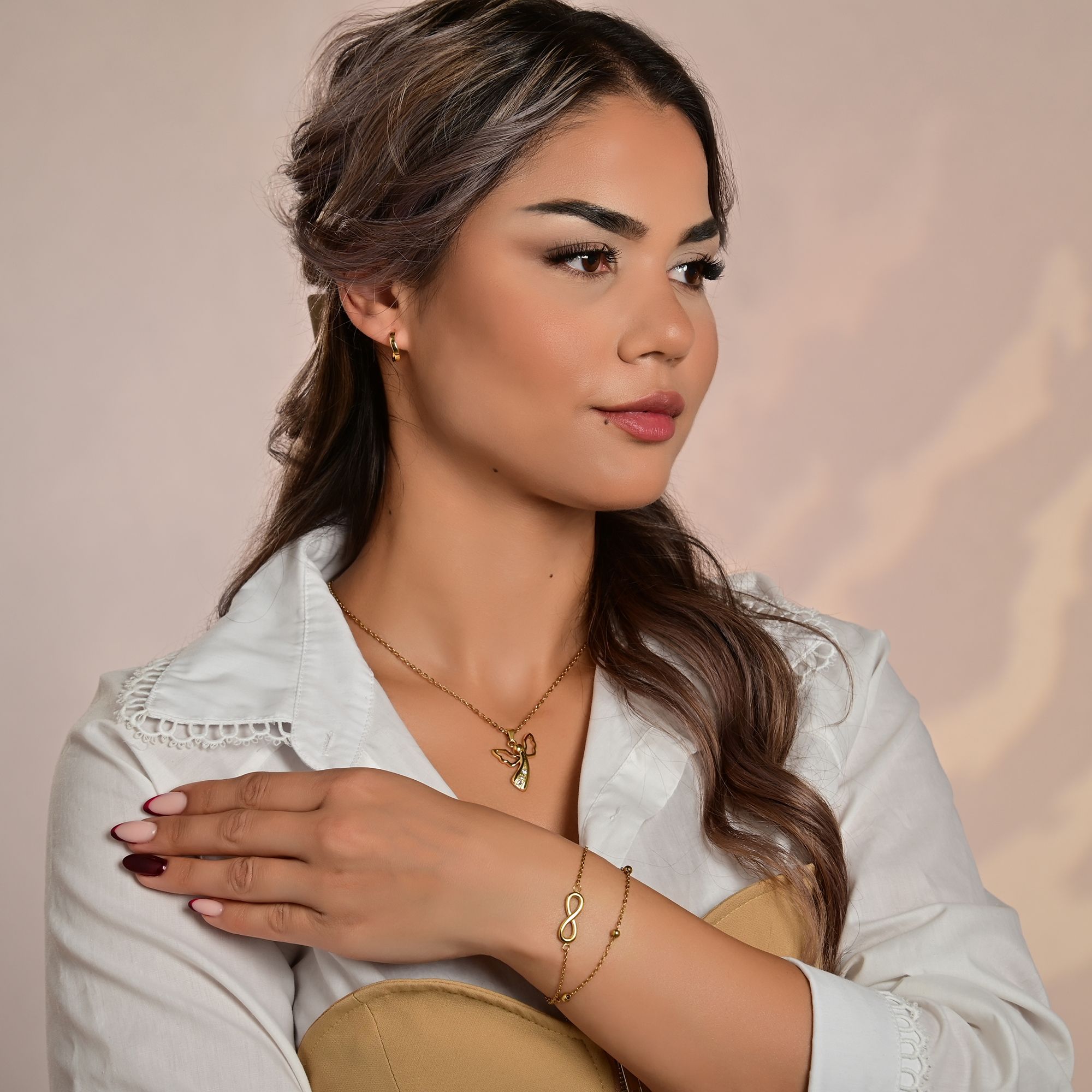 Das goldfarbene Schmuckarmband der Marke Akzent ist im Ankermuster aus Edelstahl gefertigt. In gleichmäßigen Abständen sind jeweils kleine Edelstahlkugeln und ein Unendlichkeitssymbol aus Edelstahl an das Armband angebracht. Öffnen und schließen lässt sich das moderne Schmuckarmband mit einem Karabinerhaken, der ebenfalls aus Edelstahl gefertigt ist. Zusätzlich ist an das eine Ende des Bandes eine 3 cm lange Verlängerungskette angebracht um bis zu 3 cm in der Länge zu variieren und es so jedem Handgelenk anpassen zu können. Die Maße ergeben sich aus einer Länge von 17+3 cm, einer Breite von 8 mm und einer Stärke von 3 mm. Ein modernes Armband, das sich toll als Geschenk eignet und für ewige Verbundenheit steht.