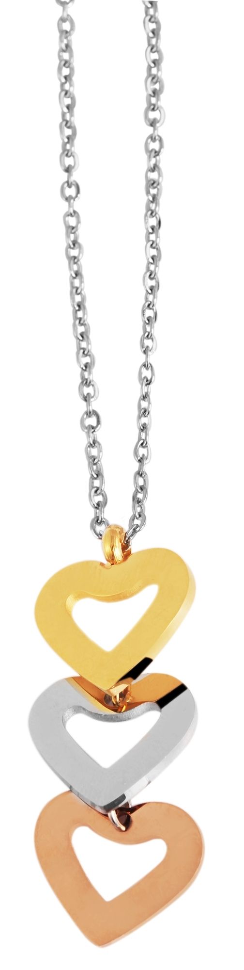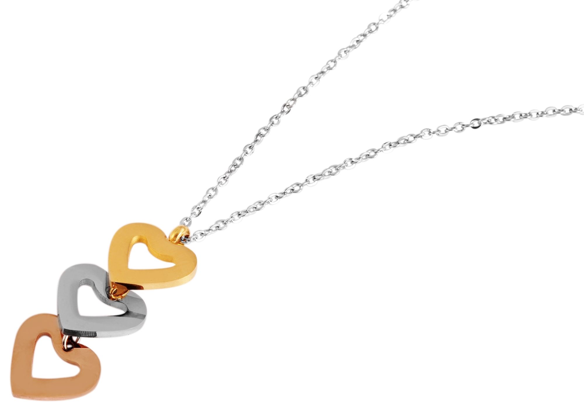 Edelstahl Schmuckset, Kette 43 + 5cm mit Anhänger + Ohrringe, tricolorzu können. Öffnen und schließen lässt sich die Kette mit einem stabilen Edelstahlkarabiner. Der Anhänger der Ankerkette besteht aus drei herzförmigen übereinanderstehenden Edelstahlelementen in den Farben Gold, Silber und Roségold. Diese sind hochglanzpoliert und mittig geöffnet. Die Maße des Anhängers ergeben sich aus einer Länge von 3,7 cm, einer Breite von 14 mm und einer Stärke von 1,5 mm. Die passenden silberfarbenen Ohrsteckern die ebenfalls hochglanzpoliert und mittig geöffnet sind, haben eine Länge von 11 mm, eine Breite von 12 mm und eine Stärke von 1 mm. Für den zusätzlichen Halt der Ohrringe sorgen die Komfort-Ohrmuttern, die mit einer Silikonplatte mitgeliefert werden.