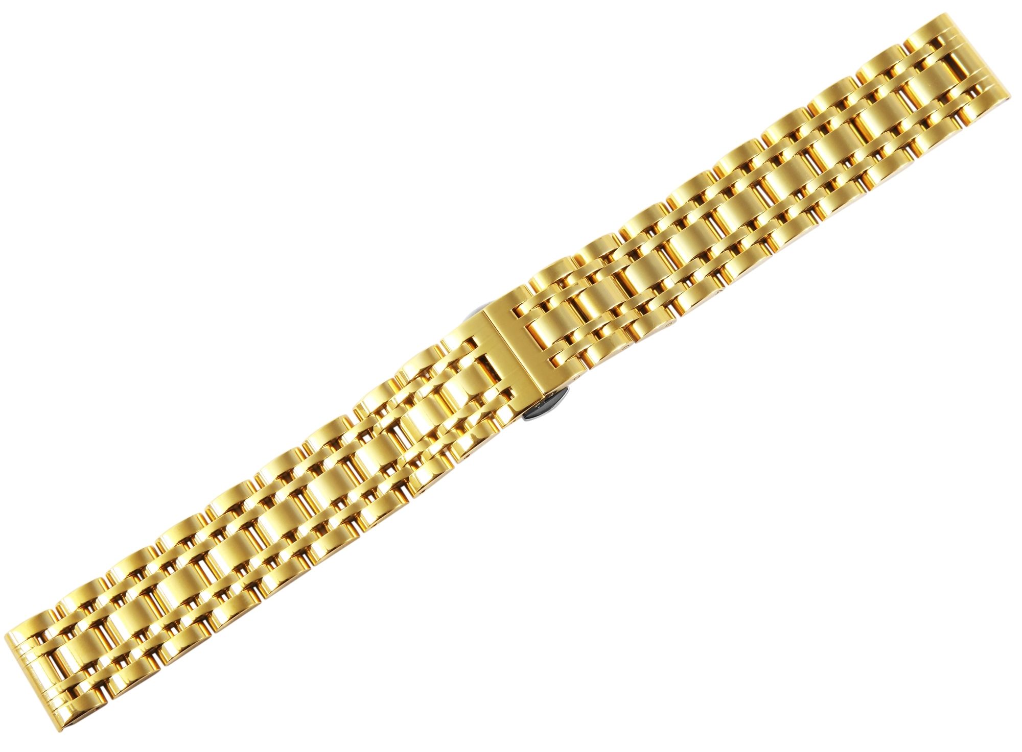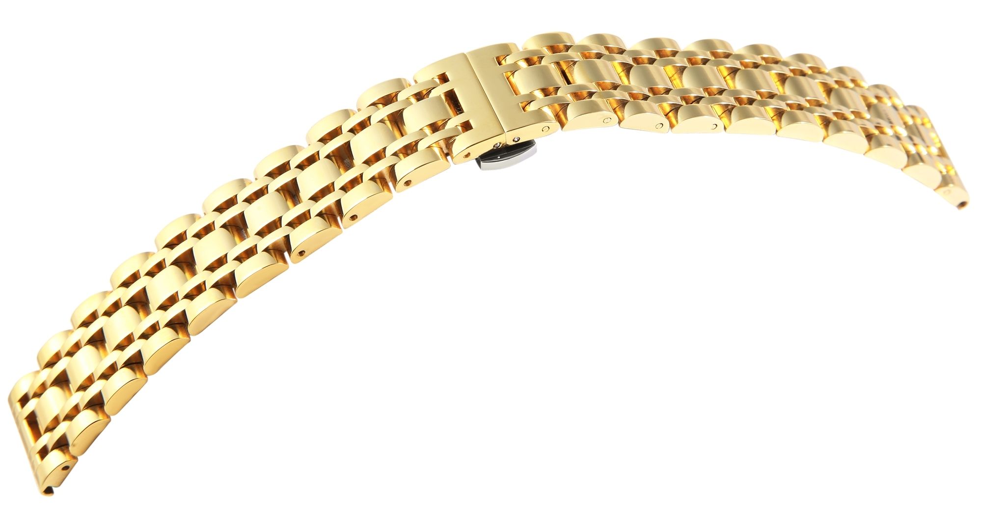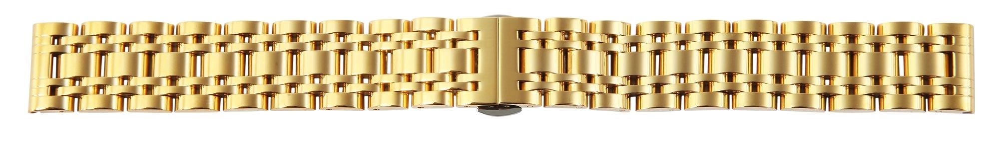 Das Ersatzarmband wurde aus Edelstahl gefertigt und ist goldfarben/glänzend. Es hat eine Anstoßbreite von 22 mm und eine Stärke von 3 mm. Dieses Armband ist in Kombination mit dem passendem Gehäuse der perfekte Ersatz für andere Uhrenarmbänder. Mit der Butterfly-Faltschließe aus Edelstahl lässt sich das Armband schnell und einfach öffnen. Durch die einzelnen Elemente garantiert das Armband eine hohe Anpassungsfähigkeit am Handgelenk und ein angenehmes Tragegefühl. Durch die eingesetzten Federstege lässt sich das Band beliebig kürzen.