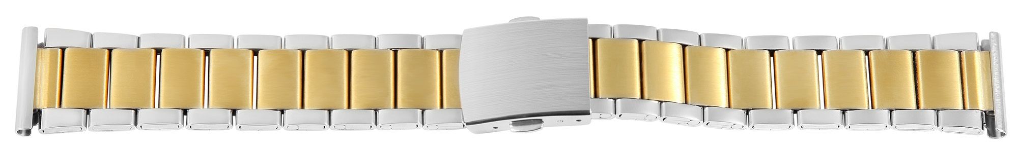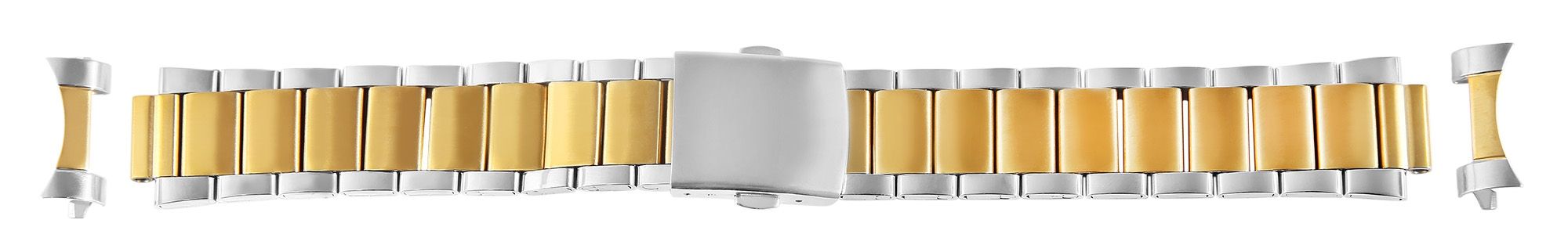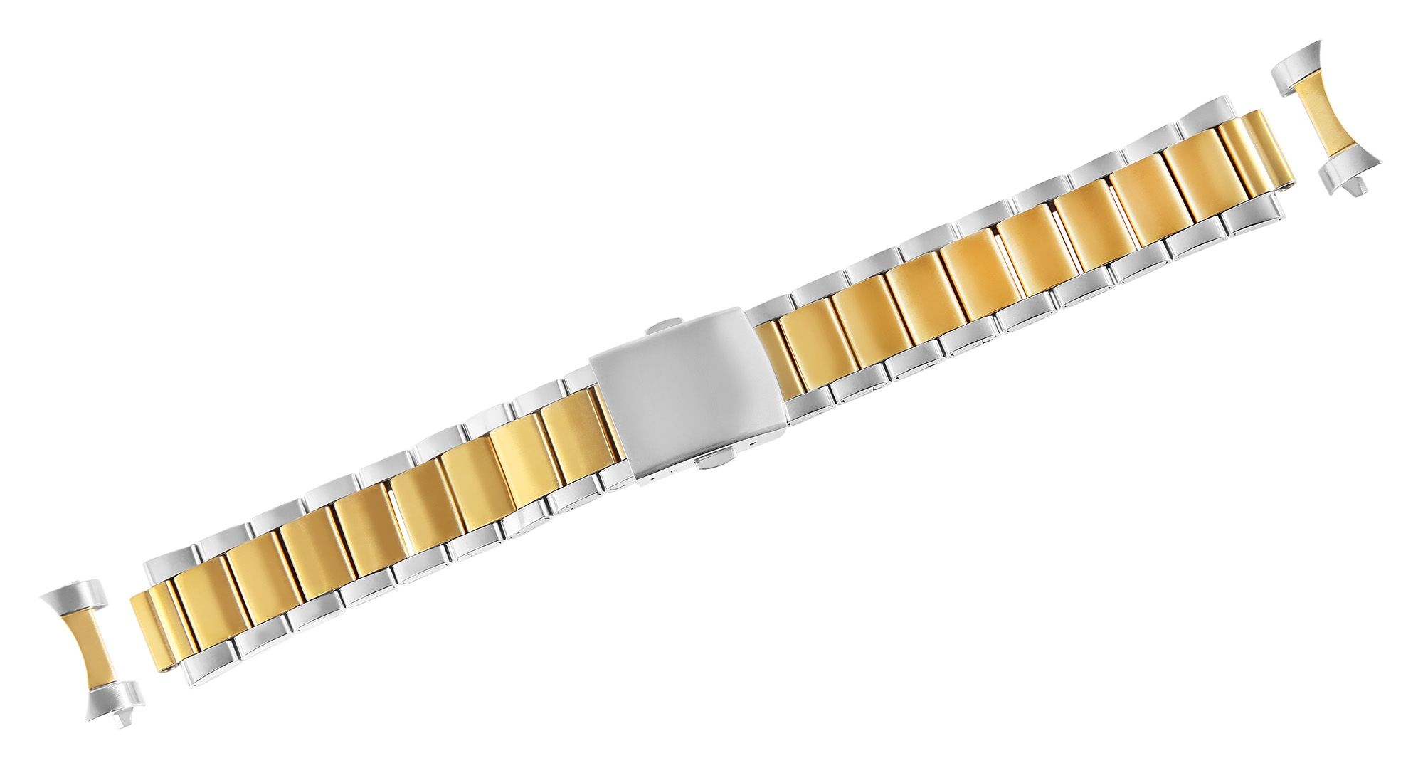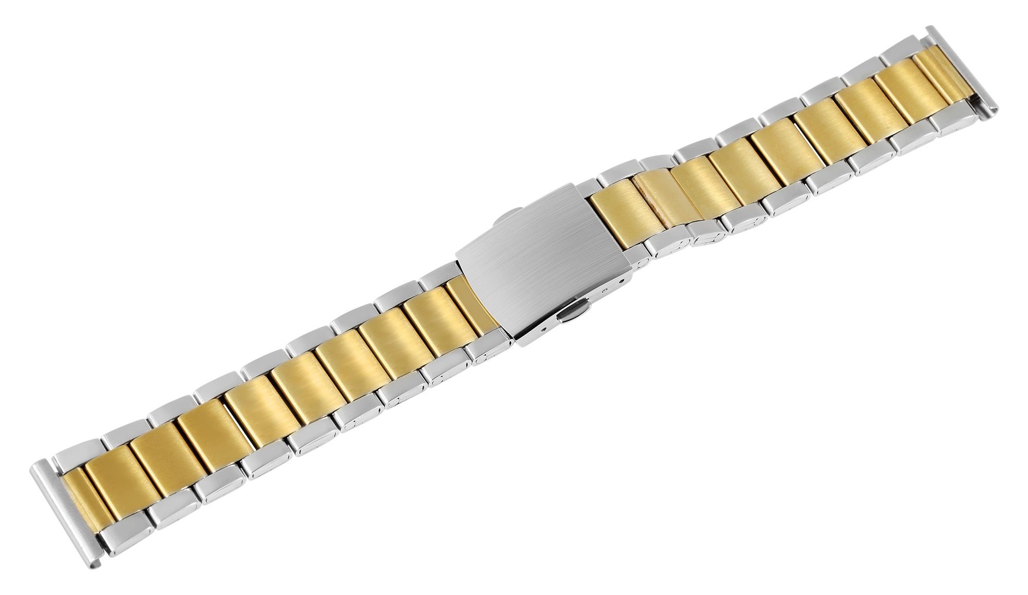 Das Bicolor-Uhrenarmband ist aus Edelstahl gefertigt und lässt sich über eine silberfarbene Edelstahl-Faltschließe öffnen und schließen. Es hat eine Anstoßbreite von 24 mm. Das Ersatzarmband setzt sich aus vielen Elementen zusammen, die sich mit wenig Aufwand entnehmen lassen. Damit ist das Band individuell auf jedes Handgelenk anpassbar. Die Gesamtlänge des Gliederarmbandes beträgt 17,5 cm. Der Anstoß ist auswechselbar. Es besteht die Möglichkeit einen halbrunden Anstoß zu verwenden, der sich perfekt an das Gehäuse anpasst, oder man verwendet einen geraden Anstoß, der der Uhr einen besonderen Look verleiht und mit jedem Gehäuse kompatibel ist. Die einzelnen Elemente bestehen jeweils aus drei Einzelteilen, die das Edelstahlarmband im zusammengesetzten Zustand dreireihig aussehen lassen. Die äußeren silberfarbenen Teile sind poliert und die goldfarbene Mittelreihe ist mattiert. Durch diese Art der Oberflächenbearbeitung passt sich dieses Armband perfekt an jede Uhr an.