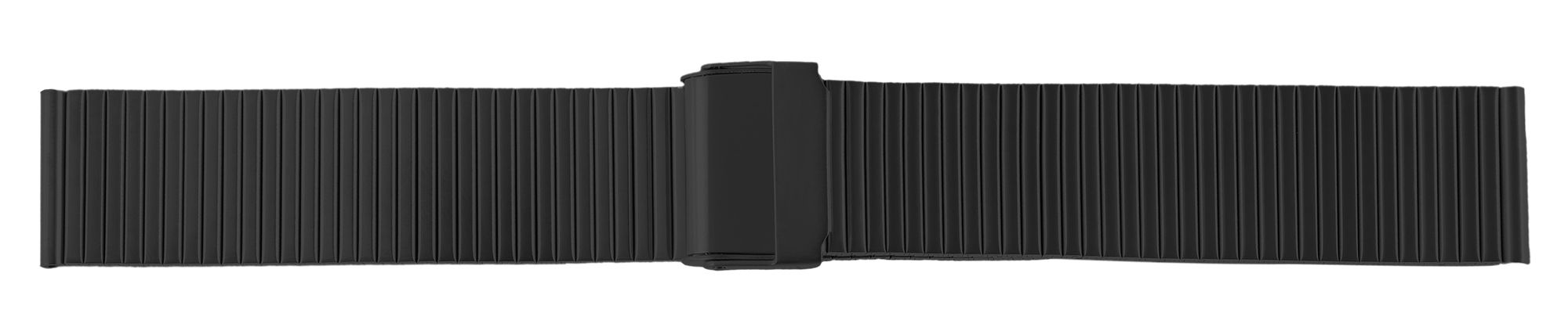 Das schwarze Uhrenarmband ist aus Edelstahl gefertigt und lässt sich mit einem schwarzen Hakenverschluss aus Edelstahl öffnen und schließen. Das Ersatzarmband ist optisch wie ein Zugarmband gefertigt und besteht aus vielen kleinen aneinander gereihten Elementen, die sich nicht entnehmen lassen. Jedoch lässt sich die Länge des Armbandes anhand der Schließe verstellen, die wie bei einem Milanesearmband stufenweise verstellbar ist. Durch die Machart, die einem Milanesearmband sehr ähnelt, hat das Uhrenband einen sehr hohen Tragekomfort und ist durch die feine Stufenverstellung perfekt an jedes Handgelenk anpassbar. Die Gesamtlänge des Uhrenbandes beträgt 18,5 cm. Das Ersatzarmband hat eine Anstoßbreite von 18 mm. Der Anstoß ist gerade und somit mit jeder Uhr kompatibel.