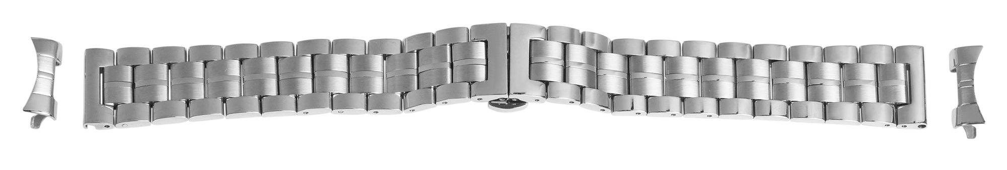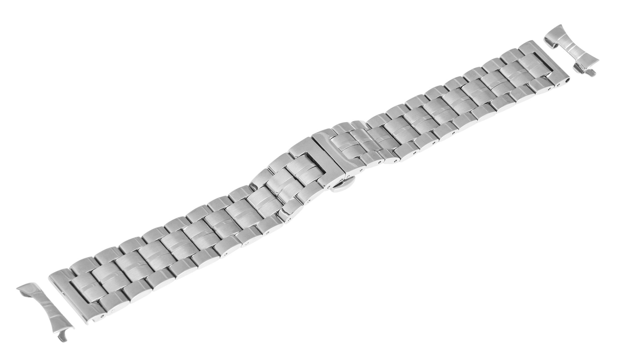 Das Uhrenersatzarmband ist aus Edelstahl gefertigt und lässt sich über eine silberfarbene Edelstahl-Butterflyfaltschließe öffnen und schließen. Es hat eine Anstoßbreite von 22 mm. Das Ersatzarmband setzt sich aus vielen Elementen zusammen, die sich mit wenig Aufwand entnehmen lassen. Damit ist das Band individuell auf jedes Handgelenk anpassbar. Die Gesamtlänge des Gliederarmbandes beträgt 19 cm. Der Anstoß ist auswechselbar. Es besteht die Möglichkeit einen halbrunden Anstoß zu verwenden, der sich perfekt an das Gehäuse anpasst, oder man nimmt einen geraden Anstoß, der der Uhr einen besonderen Look verleiht. Die einzelnen Elemente bestehen jeweils aus drei Einzelteilen, die das Edelstahlarmband im zusammengesetzten Zustand dreireihig aussehen lassen. Die äußeren Teile sind poliert und die mittlere Reihe ist mattiert. Eine Besonderheit ist, dass die mittlere mattierte Reihe mit einem ca 1 mm breiten polierten Längsstreifen verziert ist. Durch diese Art der Oberflächenbearbeitung passt sich dieses Armband perfekt an jede Uhr an.