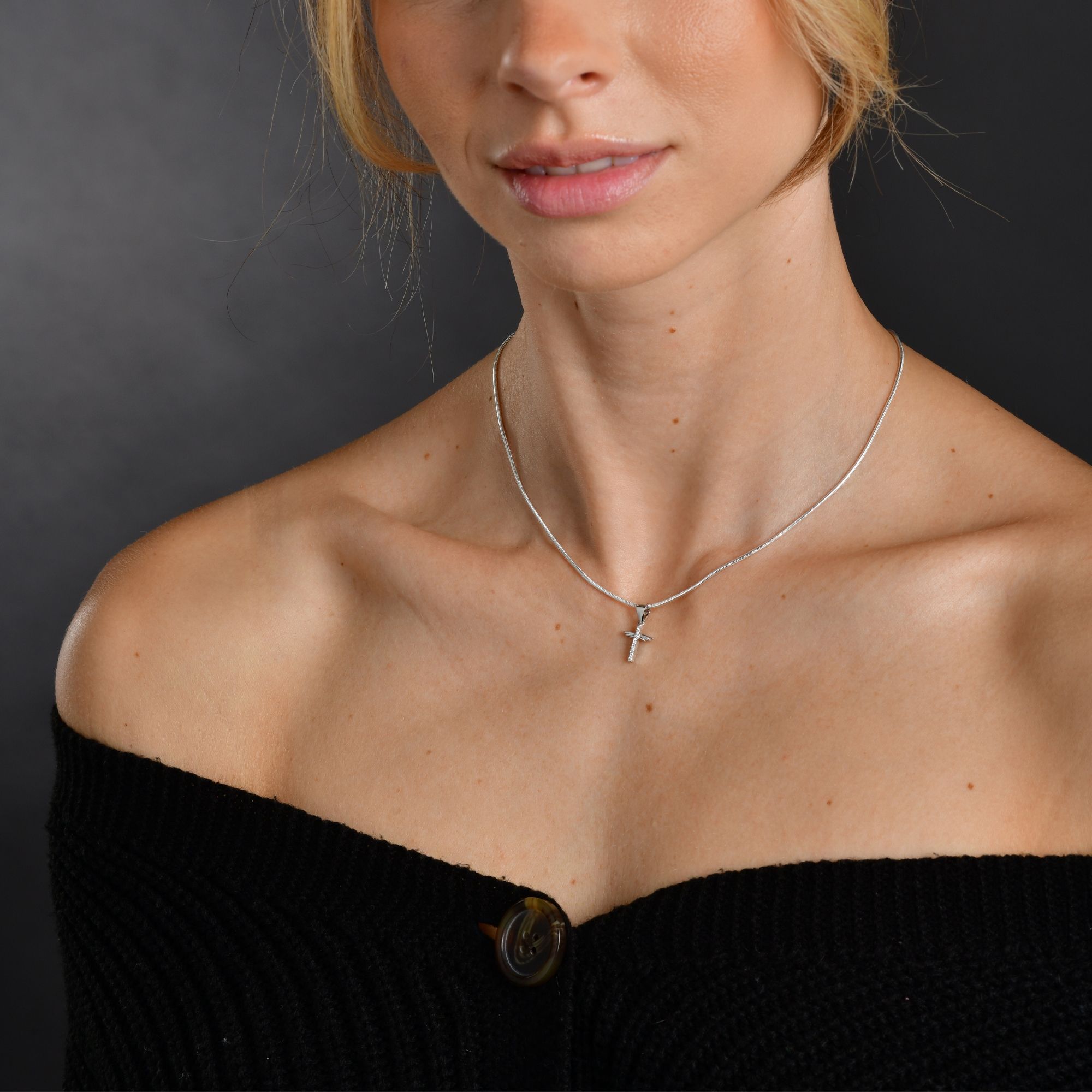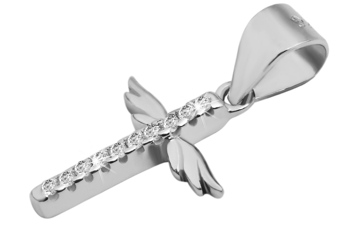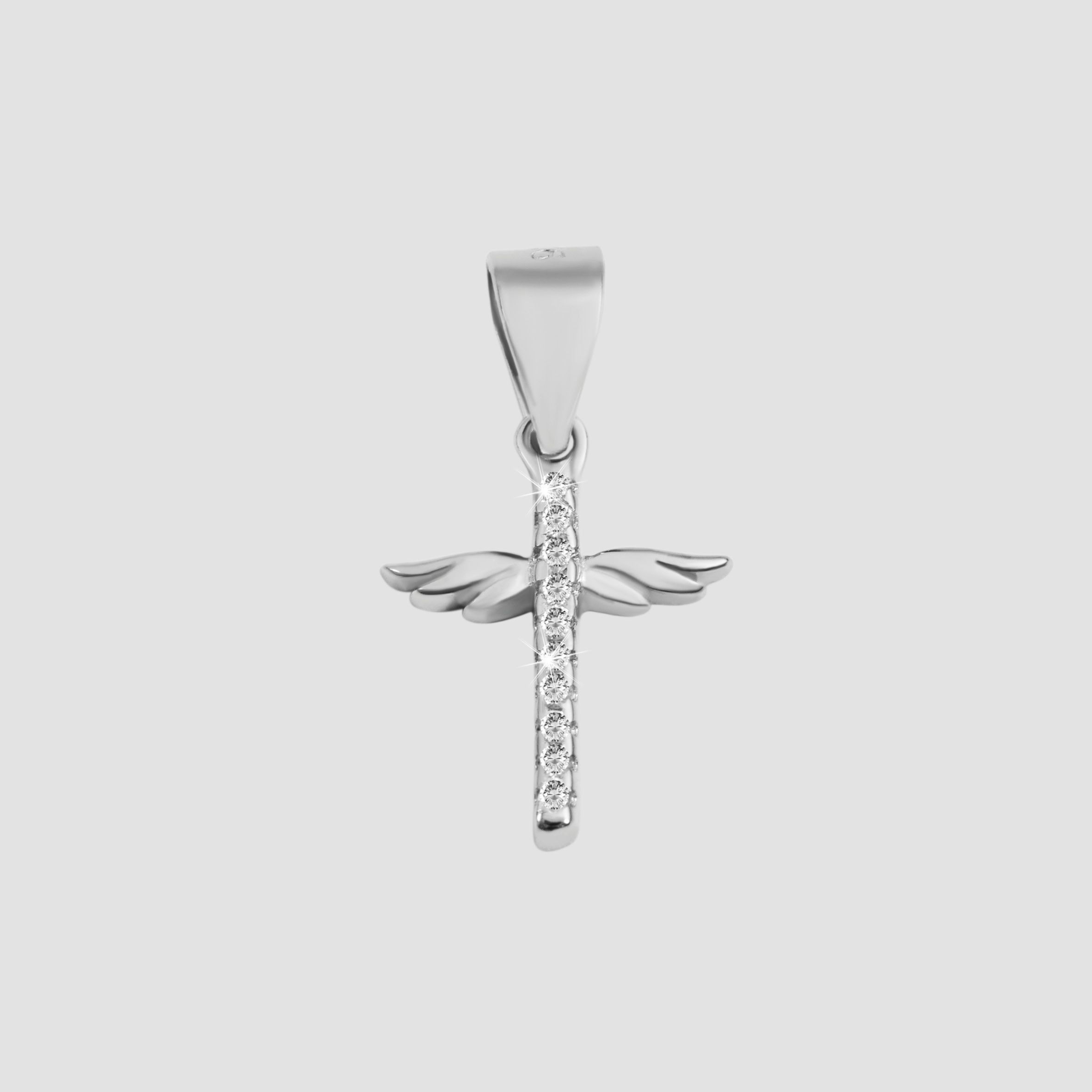 Der vertikale Balken des Kreuzes ist mit 10 funkelnden, weißen Zirkoniasteinen besetzt: der Querbalken wird durch 2 detaillierte Flügelchen gebildet. Durch eine ovale Öse kann der Anhänger beliebig an Ketten oder Armbändern befestigt werden. Die Größe ergibt sich aus einer Länge von 13 mm, einer Breite von 10 mm und einer Stärke von 2 mm.