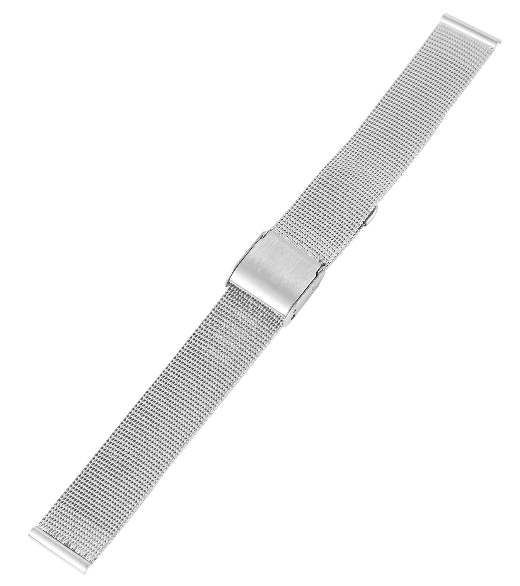 Das Ersatz-Milanaiseband wurde aus silberfarbenen Metallldrähten in ein besonders bewegliches und robustes Gewebe geflochten. Dies verleiht dem Armband sein markantes und wieder erkennbares Aussehen. Durch die feine Meshstruktur strahlt das Milanaiseband eine Note von schlichter Eleganz aus. Dank des Metallgeflechtes ist dieses Armband besonders Luft durchlässig, was das Tragen bei warmen Temperaturen angenehm macht. Das Band hat eine Anstoßbreite von 18 mm, eine Materialstärke von 1,5 mm und eine Gesamtlänge von 16,5 cm.